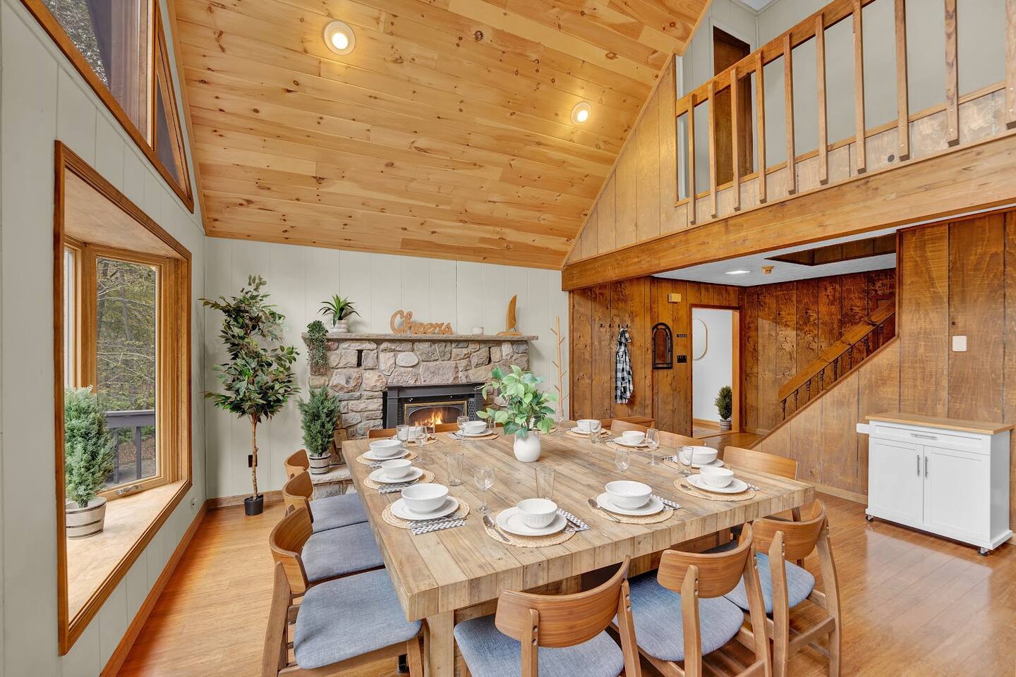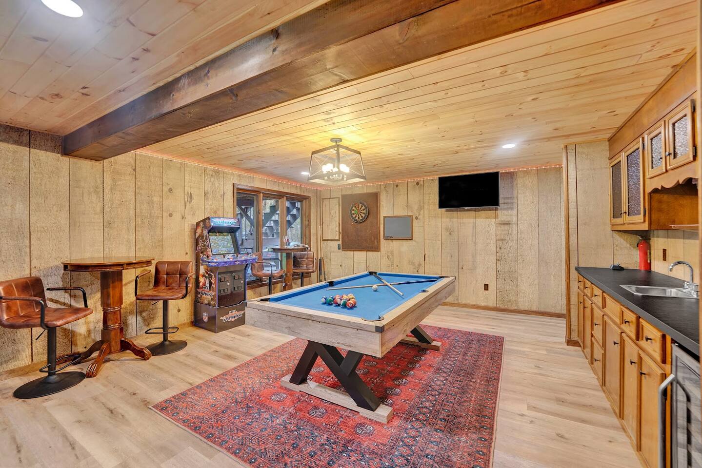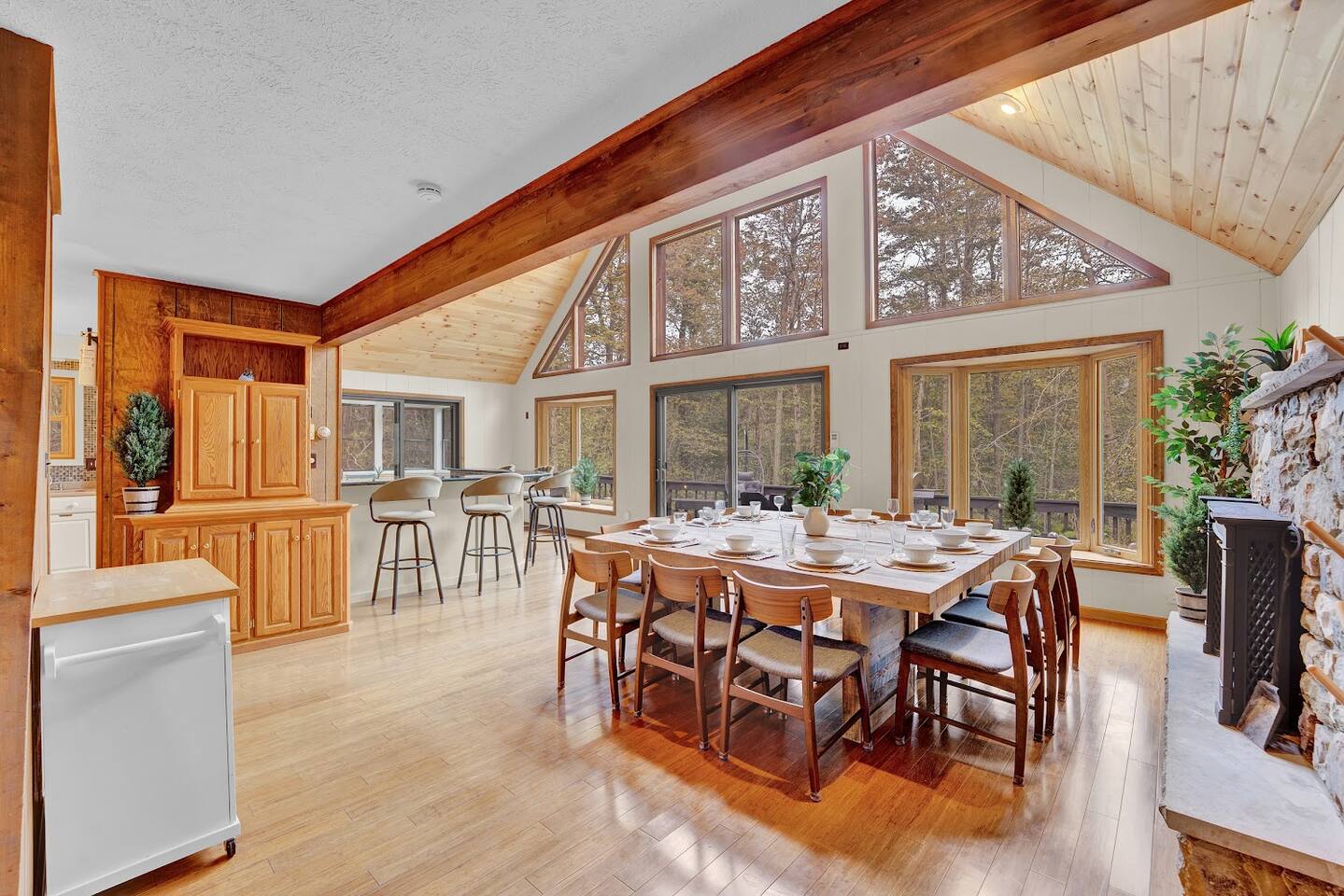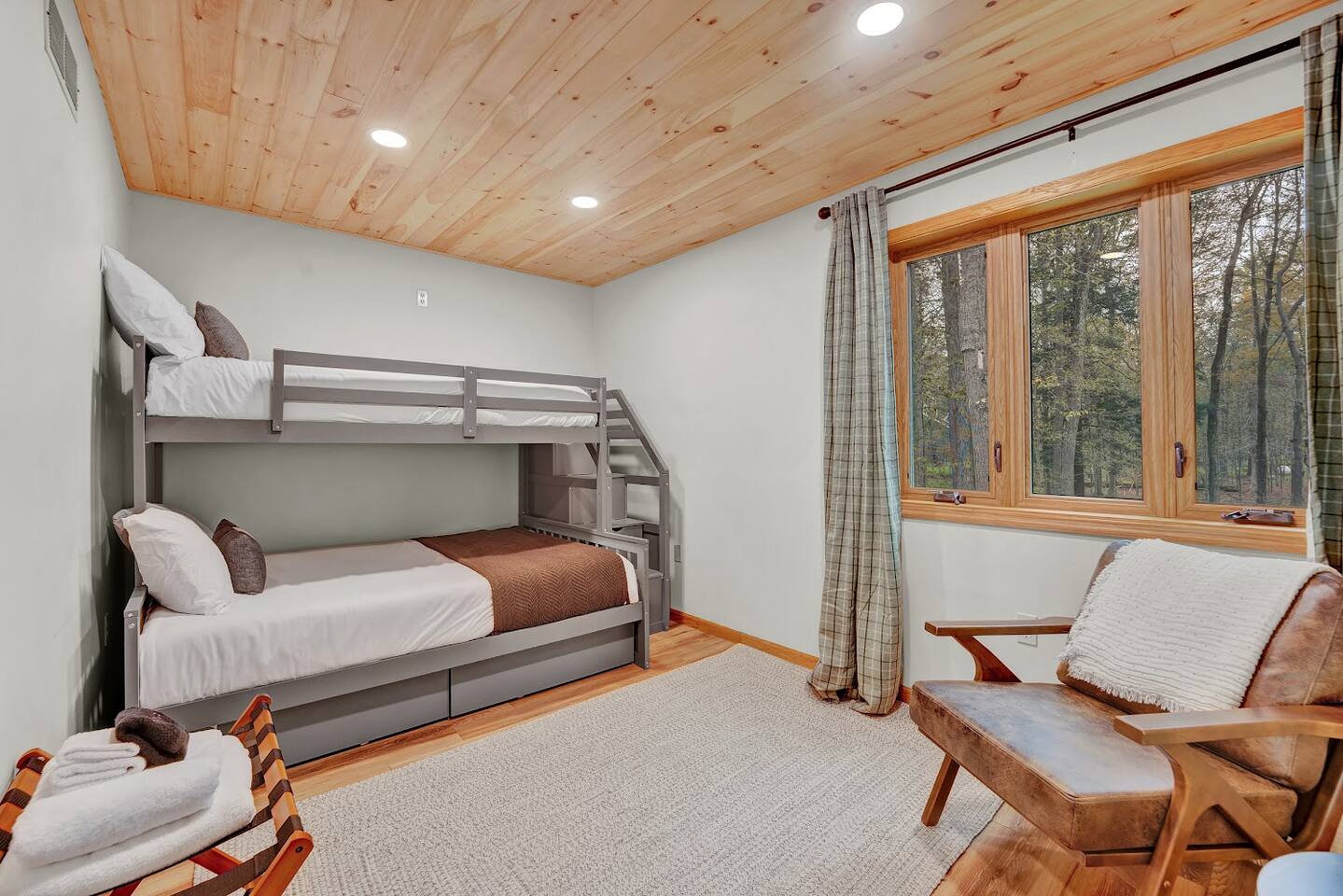 *NOTE: WE RECENTLY DID A COSMETIC REFRESH ON THE HOME & WE'RE SO EXCITED TO SHARE IT WITH YOU ALL! The current photos were taken BEFORE updates were made. The new photos will be posted shortly! Message us if you have any questions about the home!* --- Welcome to The Perch at Eagles View - a spacious, five-bedroom retreat with soaring ceilings, a stunning natural stone fireplace, and a sun-drenched deck made for outdoor living. Inside, you’ll find warm natural wood finishes and standout amenities, including a spa room with an indoor hot tub, fully stocked game room, home gym with sauna, and a cozy fire pit. Once you step into this Poconos oasis, you may never want to leave! KEY FEATURES: ⇢ 5 bedrooms, comfortably sleeping 12 guests (3 King, 2 Twin-over-Full bunk beds) & 4 full bathrooms ⇢ 8-person sunken hot tub in private spa room ⇢ Fully stocked game room with pool table, skeeball, multiple arcade games (NFL Blitz, Pacman, Street Fighter), darts, a wet bar, and two TVs. ⇢ Private fitness room with sauna, treadmill, exercise bike, weight bench & dumbbells ⇢ Outdoor Firepit with polywood Adirondack chairs ⇢ Cozy media room w/ oversized sectional & 85" smart TV ⇢ Access to premier Big Bass Lake Community private amenities, including: 3 lakes, 2 beaches, 2 pools (indoor + outdoor), basketball, tennis, pickleball, splash pad, playgrounds & more! ⇢ High-speed WiFi & Smart TVs ⇢ Kid + toddler-friendly w/ gate, high chair, and pack & play provided ↟ BEDROOMS ↟ The home's five bedrooms provide the perfect retreat for your entire group, offering privacy, comfort, and a sense of being completely at ease. Thoughtfully designed for both adults and children, these spaces make everyone feel right at home. The main floor features three bedrooms, one primary with a King sized bed and two bunk rooms located just off the living room. All bedrooms are conveniently located within steps from the two beautifully renovated full bathrooms on the floor and feature stylish window curtains, area rugs, and either a lounging chair or work desk. Upstairs are two additional bedrooms with king-sized beds, a sleek desk for any of those 'work-from-home' moments, and stylish finishes, providing ample space and ideal sleeping arrangements for everyone in your group - no fighting over who gets the master! ↟ BATHROOMS ↟ Each floor provides its own full-sized bathroom, ensuring plenty of space to refresh and recharge for your entire group. All three bathrooms on the main and upstairs floor feature large, beautifully tiled walk-in rain showers with glass enclosure and a vanity sink with a mirror. All bathrooms are fully stocked with complimentary hand towels, wash cloths, makeup towels, hair dryers, and premium bath-time essentials. ↟ KITCHEN AND DINING AREA ↟ Enjoy cooking in a kitchen that offers all the quality appliances, utensils and cookware needed to feel right at home! Think: all the pots & pans, serving trays, and bakeware you need to whip up a meal to remember. Steps away, the open floor plan flows seamlessly into a dining room that you won’t want to leave. Bathed in sunlight from floor-to-ceiling windows, the room is centered around an impressive stone fireplace and features a natural-wood dining table with seating for 12, making your mealtimes a truly special experience. Lastly, don’t forget to kickstart your mornings in the mountains with a thoughtfully designed caffeine station -- drip coffee and Keurig options, as well as a huge selection of Stash teas! ↟ LIVING ROOM ↟ Get cozy in the living room, with large glass windows framing a serene view of the surrounding trees, bringing in plenty of natural light and a peaceful connection to nature. Watch a movie on the WiFi-enabled 85-inch SmartTV or stream your favorite shows on any of the popular streaming apps you know and love. It’s a comfortable, thoughtfully equipped space—perfect for relaxing after a busy day or enjoying a quiet afternoon in. ↟ GAME ROOM ↟ Your go-to spot for entertainment, our first-floor game room is packed with activities to keep everyone engaged. Play classic arcade games like NFL Blitz, Street Fighter, and Pac-Man, enjoy a round of skeeball, or challenge each other at the pool table or dart board - all while watching the biggest sporting events or your favorite shows on the mounted smartTV. ↟ GYM & SPA ↟ Stay active and on track - even while you’re on vacation! - with our fully equipped home gym and fitness area. Break a sweat on the treadmill or exercise bike, or focus on strength training with the weight bench and dumbbells, or step into the sauna for a relaxing reset. On the main floor is a relaxing spa room with a sunken hot tub that comfortably seats eight and features recessed heat lamp bulbs in the ceiling! ↟ OUTDOOR SPACE ↟ The home is surrounded by a lush landscape with multiple outdoor seating areas. Just off the dining room is a large front deck with an outdoor dining table, hanging egg chair and stainless steel gas grill. Connected to the deck is also a three-season screened porch with polywood dining table with seating for four. Additionally, through the spa room is a second cozy deck with an outdoor sectional and additional table, perfect for those quiet mornings amongst nature with nothing but coffee and peace of mind. In the backyard is space for outdoor games, a fire pit area with polywood Adirondack chairs, and a hidden game room! - Tucked on the backside of the house, open the double doors to find a fun bonus space with putting green and outdoor games. ↟ BIG BASS LAKE AMENITIES ↟ You and your loved ones won't ever be bored with all the amenities that this private community has to offer. Enjoy access to 2 beaches, 2 pools (indoor + outdoor), basketball, tennis and pickleball courts, a splash pad, playgrounds & more! Kayaks & paddle boards are also available to rent from Thursday to Sunday, and must be reserved 48 hours in advance. Amenity passes are priced as fol