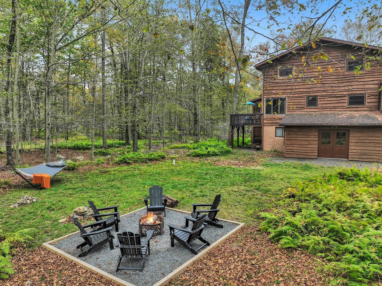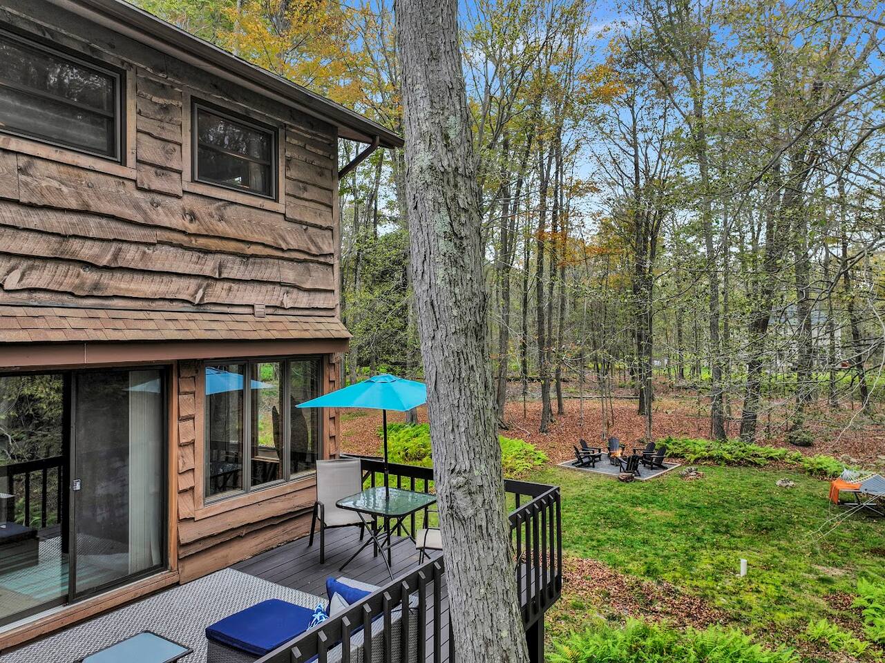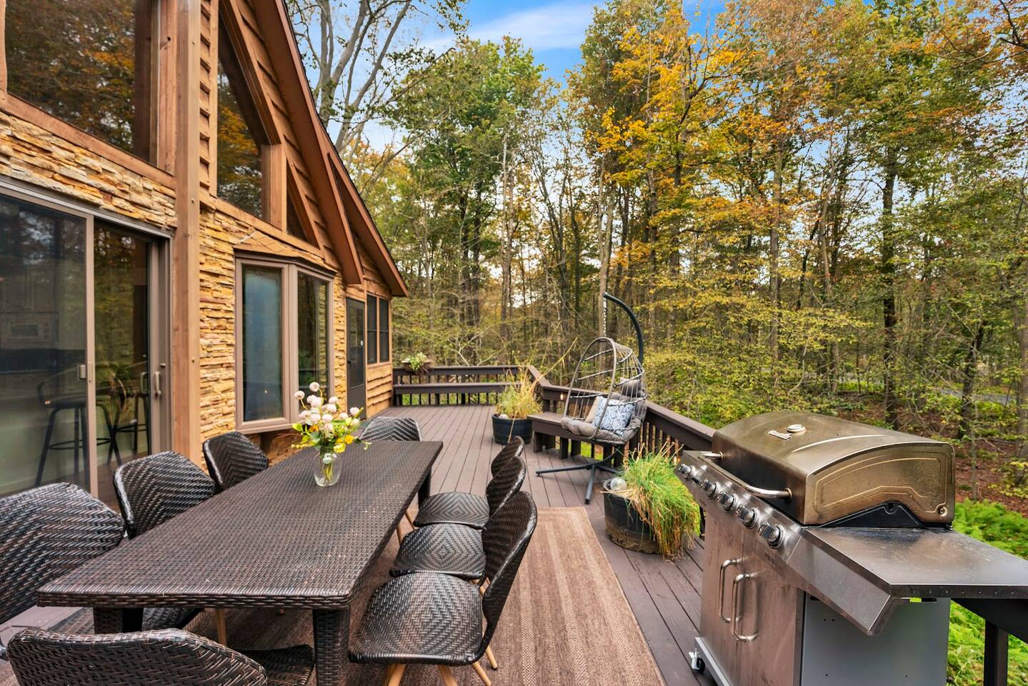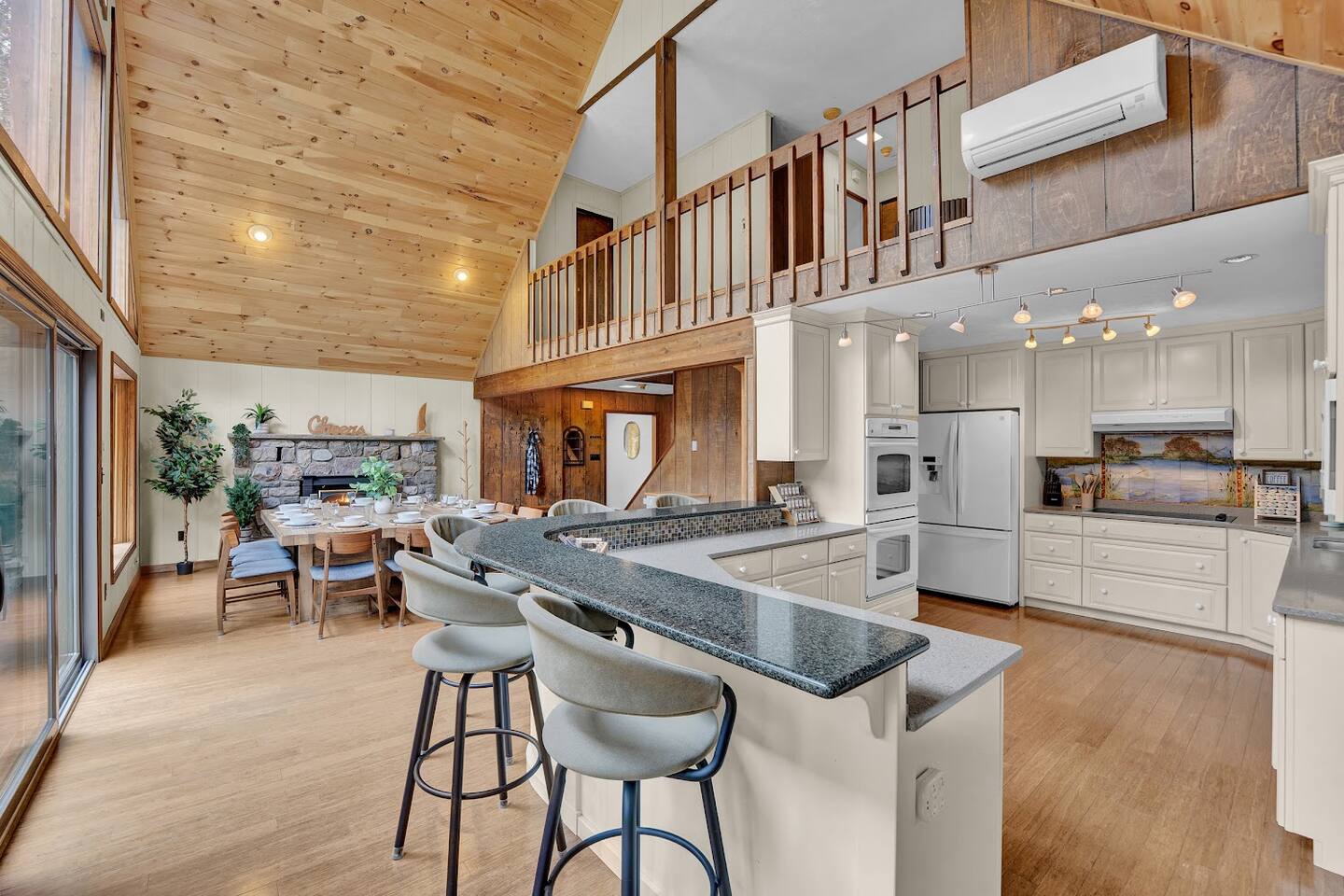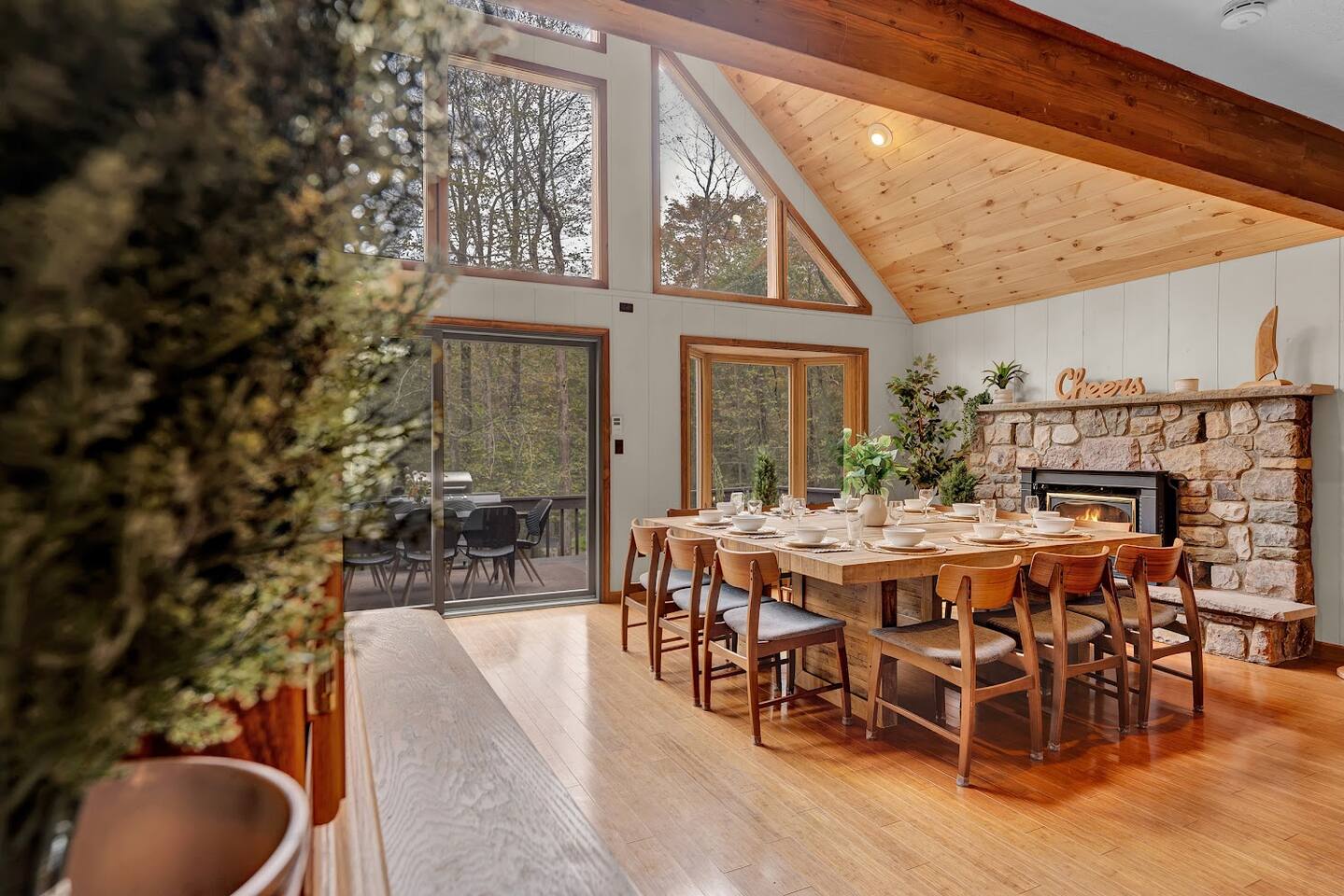 *NOTE: WE RECENTLY DID A COSMETIC REFRESH ON THE HOME & WE'RE SO EXCITED TO SHARE IT WITH YOU ALL! The current photos were taken BEFORE updates were made. The new photos will be posted shortly! Message us if you have any questions about the home!* --- Welcome to The Perch at Eagles View - a spacious, five-bedroom retreat with soaring ceilings, a stunning natural stone fireplace, and a sun-drenched deck made for outdoor living. Inside, you’ll find warm natural wood finishes and standout amenities, including a spa room with an indoor hot tub, fully stocked game room, home gym with sauna, and a cozy fire pit. Once you step into this Poconos oasis, you may never want to leave! KEY FEATURES: ⇢ 5 bedrooms, comfortably sleeping 12 guests (3 King, 2 Twin-over-Full bunk beds) & 4 full bathrooms ⇢ 8-person sunken hot tub in private spa room ⇢ Fully stocked game room with pool table, skeeball, multiple arcade games (NFL Blitz, Pacman, Street Fighter), darts, a wet bar, and two TVs. ⇢ Private fitness room with sauna, treadmill, exercise bike, weight bench & dumbbells ⇢ Outdoor Firepit with polywood Adirondack chairs ⇢ Cozy media room w/ oversized sectional & 85" smart TV ⇢ Access to premier Big Bass Lake Community private amenities, including: 3 lakes, 2 beaches, 2 pools (indoor + outdoor), basketball, tennis, pickleball, splash pad, playgrounds & more! ⇢ High-speed WiFi & Smart TVs ⇢ Kid + toddler-friendly w/ gate, high chair, and pack & play provided ↟ BEDROOMS ↟ The home's five bedrooms provide the perfect retreat for your entire group, offering privacy, comfort, and a sense of being completely at ease. Thoughtfully designed for both adults and children, these spaces make everyone feel right at home. The main floor features three bedrooms, one primary with a King sized bed and two bunk rooms located just off the living room. All bedrooms are conveniently located within steps from the two beautifully renovated full bathrooms on the floor and feature stylish window curtains, area rugs, and either a lounging chair or work desk. Upstairs are two additional bedrooms with king-sized beds, a sleek desk for any of those 'work-from-home' moments, and stylish finishes, providing ample space and ideal sleeping arrangements for everyone in your group - no fighting over who gets the master! ↟ BATHROOMS ↟ Each floor provides its own full-sized bathroom, ensuring plenty of space to refresh and recharge for your entire group. All three bathrooms on the main and upstairs floor feature large, beautifully tiled walk-in rain showers with glass enclosure and a vanity sink with a mirror. All bathrooms are fully stocked with complimentary hand towels, wash cloths, makeup towels, hair dryers, and premium bath-time essentials. ↟ KITCHEN AND DINING AREA ↟ Enjoy cooking in a kitchen that offers all the quality appliances, utensils and cookware needed to feel right at home! Think: all the pots & pans, serving trays, and bakeware you need to whip up a meal to remember. Steps away, the open floor plan flows seamlessly into a dining room that you won’t want to leave. Bathed in sunlight from floor-to-ceiling windows, the room is centered around an impressive stone fireplace and features a natural-wood dining table with seating for 12, making your mealtimes a truly special experience. Lastly, don’t forget to kickstart your mornings in the mountains with a thoughtfully designed caffeine station -- drip coffee and Keurig options, as well as a huge selection of Stash teas! ↟ LIVING ROOM ↟ Get cozy in the living room, with large glass windows framing a serene view of the surrounding trees, bringing in plenty of natural light and a peaceful connection to nature. Watch a movie on the WiFi-enabled 85-inch SmartTV or stream your favorite shows on any of the popular streaming apps you know and love. It’s a comfortable, thoughtfully equipped space—perfect for relaxing after a busy day or enjoying a quiet afternoon in. ↟ GAME ROOM ↟ Your go-to spot for entertainment, our first-floor game room is packed with activities to keep everyone engaged. Play classic arcade games like NFL Blitz, Street Fighter, and Pac-Man, enjoy a round of skeeball, or challenge each other at the pool table or dart board - all while watching the biggest sporting events or your favorite shows on the mounted smartTV. ↟ GYM & SPA ↟ Stay active and on track - even while you’re on vacation! - with our fully equipped home gym and fitness area. Break a sweat on the treadmill or exercise bike, or focus on strength training with the weight bench and dumbbells, or step into the sauna for a relaxing reset. On the main floor is a relaxing spa room with a sunken hot tub that comfortably seats eight and features recessed heat lamp bulbs in the ceiling! ↟ OUTDOOR SPACE ↟ The home is surrounded by a lush landscape with multiple outdoor seating areas. Just off the dining room is a large front deck with an outdoor dining table, hanging egg chair and stainless steel gas grill. Connected to the deck is also a three-season screened porch with polywood dining table with seating for four. Additionally, through the spa room is a second cozy deck with an outdoor sectional and additional table, perfect for those quiet mornings amongst nature with nothing but coffee and peace of mind. In the backyard is space for outdoor games, a fire pit area with polywood Adirondack chairs, and a hidden game room! - Tucked on the backside of the house, open the double doors to find a fun bonus space with putting green and outdoor games. ↟ BIG BASS LAKE AMENITIES ↟ You and your loved ones won't ever be bored with all the amenities that this private community has to offer. Enjoy access to 2 beaches, 2 pools (indoor + outdoor), basketball, tennis and pickleball courts, a splash pad, playgrounds & more! Kayaks & paddle boards are also available to rent from Thursday to Sunday, and must be reserved 48 hours in advance. Amenity passes are priced as fol