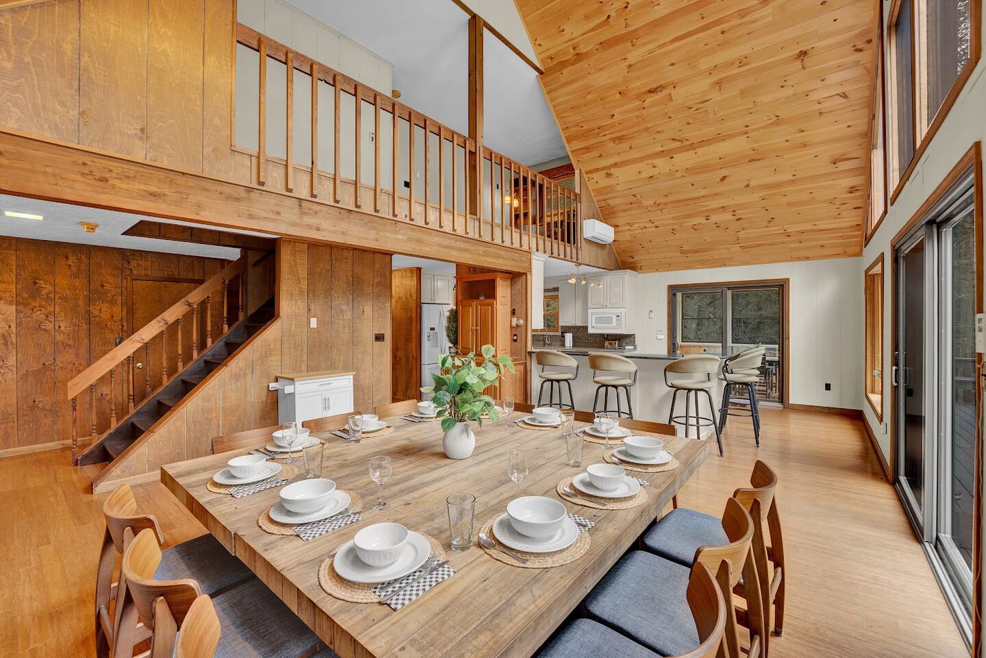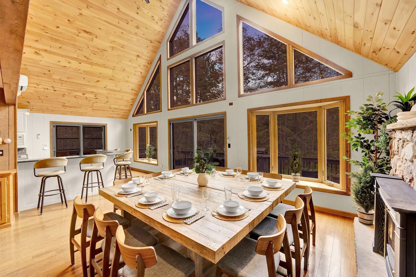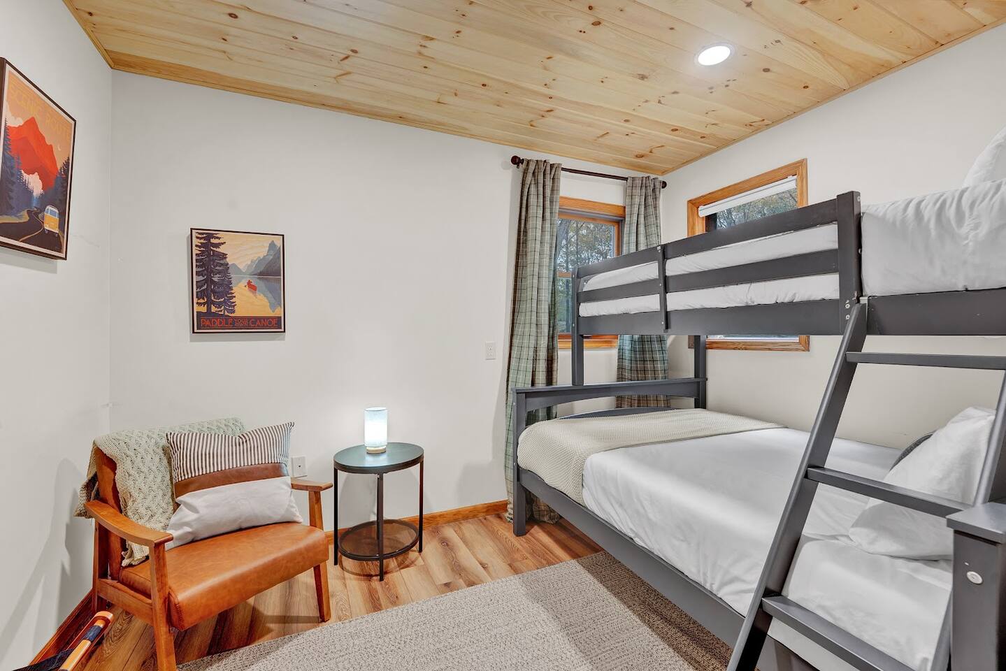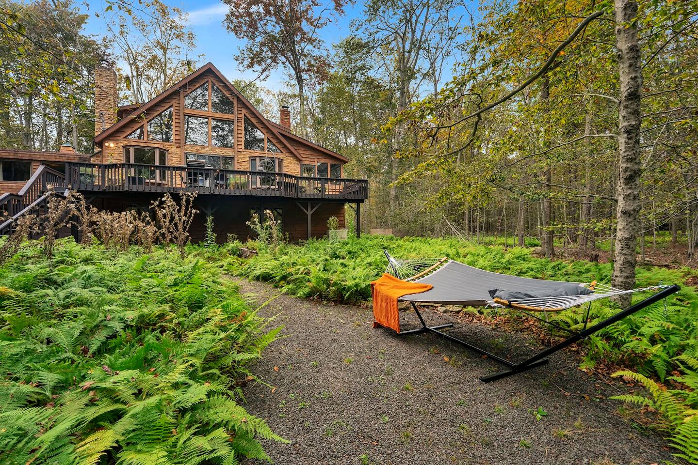 *NOTE: WE RECENTLY DID A COSMETIC REFRESH ON THE HOME & WE'RE SO EXCITED TO SHARE IT WITH YOU ALL! The current photos were taken BEFORE updates were made. The new photos will be posted shortly! Message us if you have any questions about the home!* --- Welcome to The Perch at Eagles View - a spacious, five-bedroom retreat with soaring ceilings, a stunning natural stone fireplace, and a sun-drenched deck made for outdoor living. Inside, you’ll find warm natural wood finishes and standout amenities, including a spa room with an indoor hot tub, fully stocked game room, home gym with sauna, and a cozy fire pit. Once you step into this Poconos oasis, you may never want to leave! KEY FEATURES: ⇢ 5 bedrooms, comfortably sleeping 12 guests (3 King, 2 Twin-over-Full bunk beds) & 4 full bathrooms ⇢ 8-person sunken hot tub in private spa room ⇢ Fully stocked game room with pool table, skeeball, multiple arcade games (NFL Blitz, Pacman, Street Fighter), darts, a wet bar, and two TVs. ⇢ Private fitness room with sauna, treadmill, exercise bike, weight bench & dumbbells ⇢ Outdoor Firepit with polywood Adirondack chairs ⇢ Cozy media room w/ oversized sectional & 85" smart TV ⇢ Access to premier Big Bass Lake Community private amenities, including: 3 lakes, 2 beaches, 2 pools (indoor + outdoor), basketball, tennis, pickleball, splash pad, playgrounds & more! ⇢ High-speed WiFi & Smart TVs ⇢ Kid + toddler-friendly w/ gate, high chair, and pack & play provided ↟ BEDROOMS ↟ The home's five bedrooms provide the perfect retreat for your entire group, offering privacy, comfort, and a sense of being completely at ease. Thoughtfully designed for both adults and children, these spaces make everyone feel right at home. The main floor features three bedrooms, one primary with a King sized bed and two bunk rooms located just off the living room. All bedrooms are conveniently located within steps from the two beautifully renovated full bathrooms on the floor and feature stylish window curtains, area rugs, and either a lounging chair or work desk. Upstairs are two additional bedrooms with king-sized beds, a sleek desk for any of those 'work-from-home' moments, and stylish finishes, providing ample space and ideal sleeping arrangements for everyone in your group - no fighting over who gets the master! ↟ BATHROOMS ↟ Each floor provides its own full-sized bathroom, ensuring plenty of space to refresh and recharge for your entire group. All three bathrooms on the main and upstairs floor feature large, beautifully tiled walk-in rain showers with glass enclosure and a vanity sink with a mirror. All bathrooms are fully stocked with complimentary hand towels, wash cloths, makeup towels, hair dryers, and premium bath-time essentials. ↟ KITCHEN AND DINING AREA ↟ Enjoy cooking in a kitchen that offers all the quality appliances, utensils and cookware needed to feel right at home! Think: all the pots & pans, serving trays, and bakeware you need to whip up a meal to remember. Steps away, the open floor plan flows seamlessly into a dining room that you won’t want to leave. Bathed in sunlight from floor-to-ceiling windows, the room is centered around an impressive stone fireplace and features a natural-wood dining table with seating for 12, making your mealtimes a truly special experience. Lastly, don’t forget to kickstart your mornings in the mountains with a thoughtfully designed caffeine station -- drip coffee and Keurig options, as well as a huge selection of Stash teas! ↟ LIVING ROOM ↟ Get cozy in the living room, with large glass windows framing a serene view of the surrounding trees, bringing in plenty of natural light and a peaceful connection to nature. Watch a movie on the WiFi-enabled 85-inch SmartTV or stream your favorite shows on any of the popular streaming apps you know and love. It’s a comfortable, thoughtfully equipped space—perfect for relaxing after a busy day or enjoying a quiet afternoon in. ↟ GAME ROOM ↟ Your go-to spot for entertainment, our first-floor game room is packed with activities to keep everyone engaged. Play classic arcade games like NFL Blitz, Street Fighter, and Pac-Man, enjoy a round of skeeball, or challenge each other at the pool table or dart board - all while watching the biggest sporting events or your favorite shows on the mounted smartTV. ↟ GYM & SPA ↟ Stay active and on track - even while you’re on vacation! - with our fully equipped home gym and fitness area. Break a sweat on the treadmill or exercise bike, or focus on strength training with the weight bench and dumbbells, or step into the sauna for a relaxing reset. On the main floor is a relaxing spa room with a sunken hot tub that comfortably seats eight and features recessed heat lamp bulbs in the ceiling! ↟ OUTDOOR SPACE ↟ The home is surrounded by a lush landscape with multiple outdoor seating areas. Just off the dining room is a large front deck with an outdoor dining table, hanging egg chair and stainless steel gas grill. Connected to the deck is also a three-season screened porch with polywood dining table with seating for four. Additionally, through the spa room is a second cozy deck with an outdoor sectional and additional table, perfect for those quiet mornings amongst nature with nothing but coffee and peace of mind. In the backyard is space for outdoor games, a fire pit area with polywood Adirondack chairs, and a hidden game room! - Tucked on the backside of the house, open the double doors to find a fun bonus space with putting green and outdoor games. ↟ BIG BASS LAKE AMENITIES ↟ You and your loved ones won't ever be bored with all the amenities that this private community has to offer. Enjoy access to 2 beaches, 2 pools (indoor + outdoor), basketball, tennis and pickleball courts, a splash pad, playgrounds & more! Kayaks & paddle boards are also available to rent from Thursday to Sunday, and must be reserved 48 hours in advance. Amenity passes are priced as fol