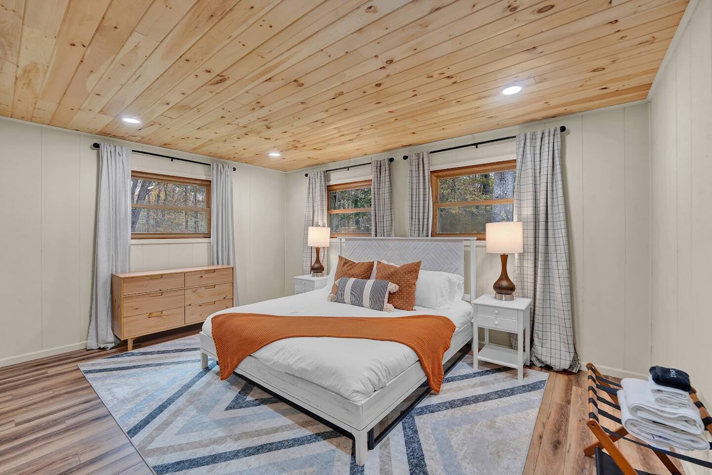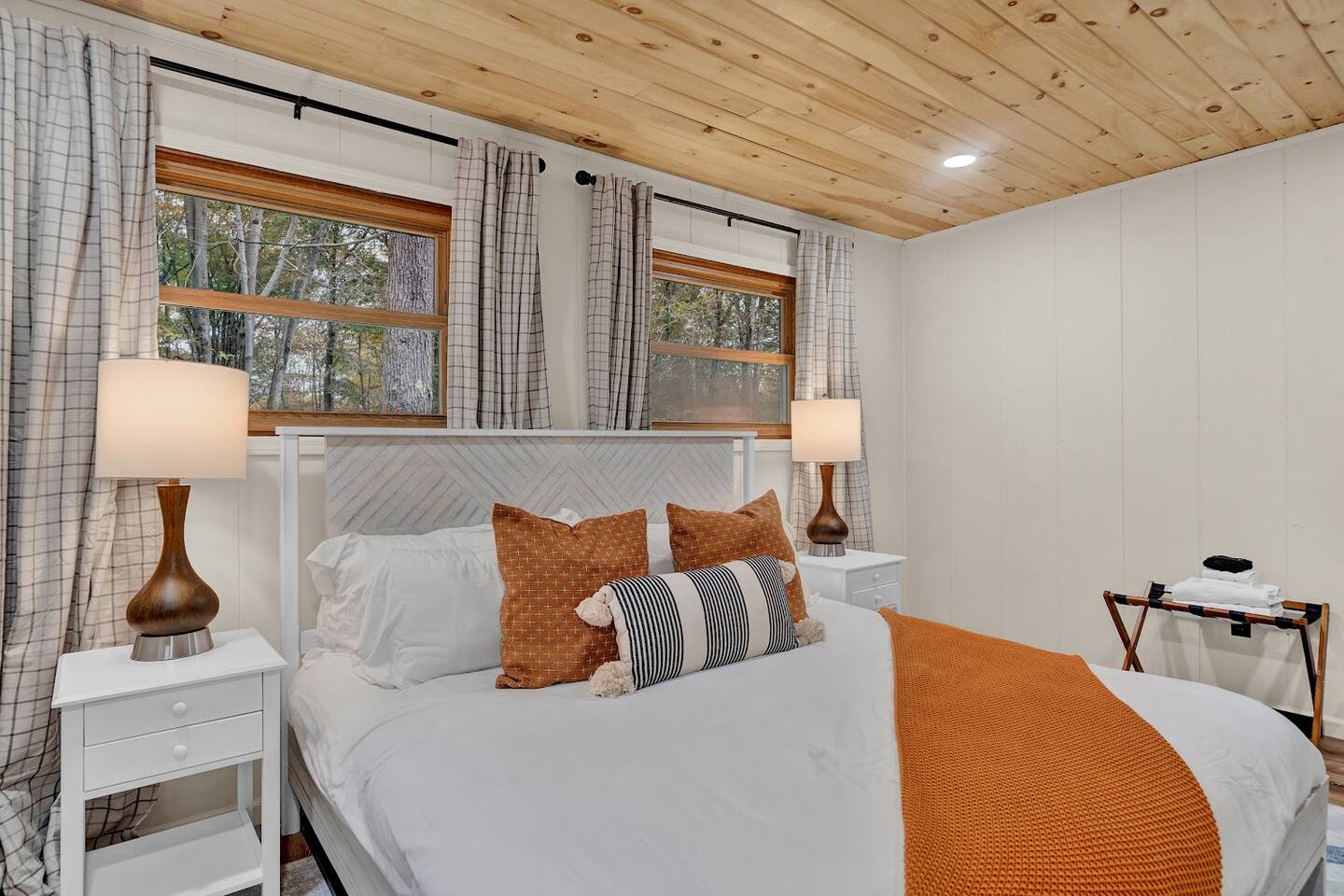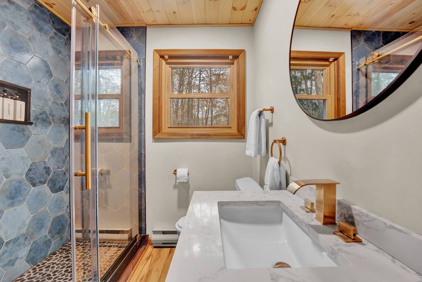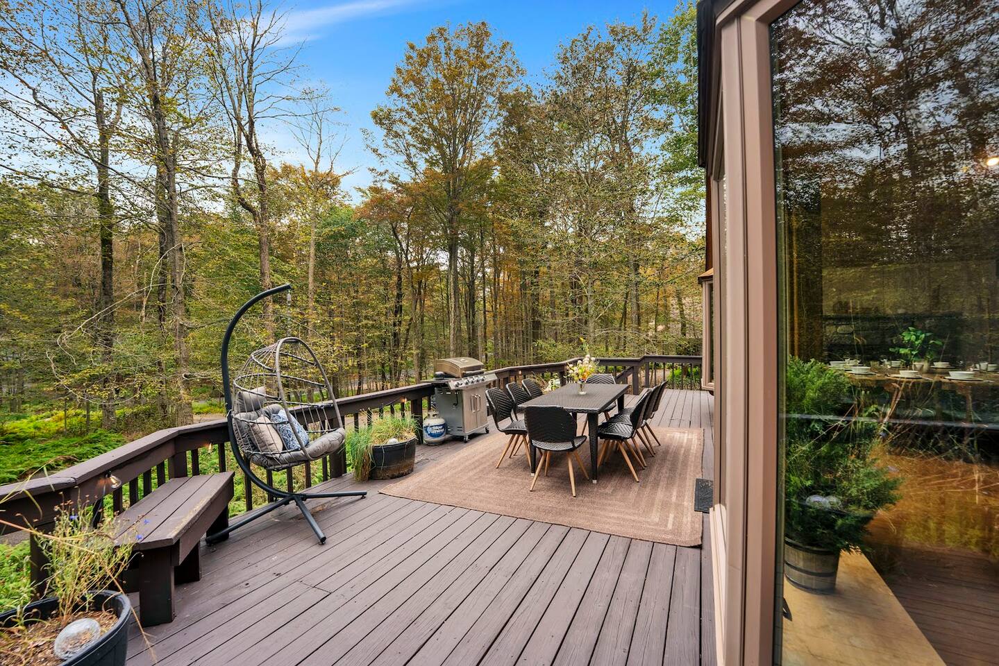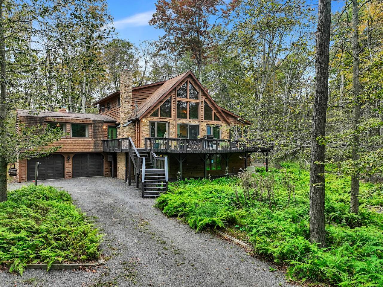 *NOTE: WE RECENTLY DID A COSMETIC REFRESH ON THE HOME & WE'RE SO EXCITED TO SHARE IT WITH YOU ALL! The current photos were taken BEFORE updates were made. The new photos will be posted shortly! Message us if you have any questions about the home!* --- Welcome to The Perch at Eagles View - a spacious, five-bedroom retreat with soaring ceilings, a stunning natural stone fireplace, and a sun-drenched deck made for outdoor living. Inside, you’ll find warm natural wood finishes and standout amenities, including a spa room with an indoor hot tub, fully stocked game room, home gym with sauna, and a cozy fire pit. Once you step into this Poconos oasis, you may never want to leave! KEY FEATURES: ⇢ 5 bedrooms, comfortably sleeping 12 guests (3 King, 2 Twin-over-Full bunk beds) & 4 full bathrooms ⇢ 8-person sunken hot tub in private spa room ⇢ Fully stocked game room with pool table, skeeball, multiple arcade games (NFL Blitz, Pacman, Street Fighter), darts, a wet bar, and two TVs. ⇢ Private fitness room with sauna, treadmill, exercise bike, weight bench & dumbbells ⇢ Outdoor Firepit with polywood Adirondack chairs ⇢ Cozy media room w/ oversized sectional & 85" smart TV ⇢ Access to premier Big Bass Lake Community private amenities, including: 3 lakes, 2 beaches, 2 pools (indoor + outdoor), basketball, tennis, pickleball, splash pad, playgrounds & more! ⇢ High-speed WiFi & Smart TVs ⇢ Kid + toddler-friendly w/ gate, high chair, and pack & play provided ↟ BEDROOMS ↟ The home's five bedrooms provide the perfect retreat for your entire group, offering privacy, comfort, and a sense of being completely at ease. Thoughtfully designed for both adults and children, these spaces make everyone feel right at home. The main floor features three bedrooms, one primary with a King sized bed and two bunk rooms located just off the living room. All bedrooms are conveniently located within steps from the two beautifully renovated full bathrooms on the floor and feature stylish window curtains, area rugs, and either a lounging chair or work desk. Upstairs are two additional bedrooms with king-sized beds, a sleek desk for any of those 'work-from-home' moments, and stylish finishes, providing ample space and ideal sleeping arrangements for everyone in your group - no fighting over who gets the master! ↟ BATHROOMS ↟ Each floor provides its own full-sized bathroom, ensuring plenty of space to refresh and recharge for your entire group. All three bathrooms on the main and upstairs floor feature large, beautifully tiled walk-in rain showers with glass enclosure and a vanity sink with a mirror. All bathrooms are fully stocked with complimentary hand towels, wash cloths, makeup towels, hair dryers, and premium bath-time essentials. ↟ KITCHEN AND DINING AREA ↟ Enjoy cooking in a kitchen that offers all the quality appliances, utensils and cookware needed to feel right at home! Think: all the pots & pans, serving trays, and bakeware you need to whip up a meal to remember. Steps away, the open floor plan flows seamlessly into a dining room that you won’t want to leave. Bathed in sunlight from floor-to-ceiling windows, the room is centered around an impressive stone fireplace and features a natural-wood dining table with seating for 12, making your mealtimes a truly special experience. Lastly, don’t forget to kickstart your mornings in the mountains with a thoughtfully designed caffeine station -- drip coffee and Keurig options, as well as a huge selection of Stash teas! ↟ LIVING ROOM ↟ Get cozy in the living room, with large glass windows framing a serene view of the surrounding trees, bringing in plenty of natural light and a peaceful connection to nature. Watch a movie on the WiFi-enabled 85-inch SmartTV or stream your favorite shows on any of the popular streaming apps you know and love. It’s a comfortable, thoughtfully equipped space—perfect for relaxing after a busy day or enjoying a quiet afternoon in. ↟ GAME ROOM ↟ Your go-to spot for entertainment, our first-floor game room is packed with activities to keep everyone engaged. Play classic arcade games like NFL Blitz, Street Fighter, and Pac-Man, enjoy a round of skeeball, or challenge each other at the pool table or dart board - all while watching the biggest sporting events or your favorite shows on the mounted smartTV. ↟ GYM & SPA ↟ Stay active and on track - even while you’re on vacation! - with our fully equipped home gym and fitness area. Break a sweat on the treadmill or exercise bike, or focus on strength training with the weight bench and dumbbells, or step into the sauna for a relaxing reset. On the main floor is a relaxing spa room with a sunken hot tub that comfortably seats eight and features recessed heat lamp bulbs in the ceiling! ↟ OUTDOOR SPACE ↟ The home is surrounded by a lush landscape with multiple outdoor seating areas. Just off the dining room is a large front deck with an outdoor dining table, hanging egg chair and stainless steel gas grill. Connected to the deck is also a three-season screened porch with polywood dining table with seating for four. Additionally, through the spa room is a second cozy deck with an outdoor sectional and additional table, perfect for those quiet mornings amongst nature with nothing but coffee and peace of mind. In the backyard is space for outdoor games, a fire pit area with polywood Adirondack chairs, and a hidden game room! - Tucked on the backside of the house, open the double doors to find a fun bonus space with putting green and outdoor games. ↟ BIG BASS LAKE AMENITIES ↟ You and your loved ones won't ever be bored with all the amenities that this private community has to offer. Enjoy access to 2 beaches, 2 pools (indoor + outdoor), basketball, tennis and pickleball courts, a splash pad, playgrounds & more! Kayaks & paddle boards are also available to rent from Thursday to Sunday, and must be reserved 48 hours in advance. Amenity passes are priced as fol