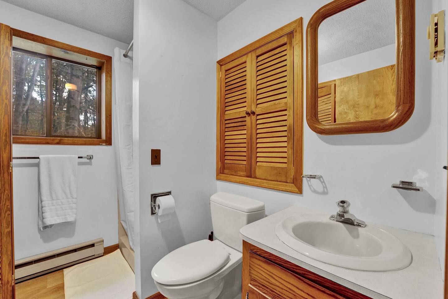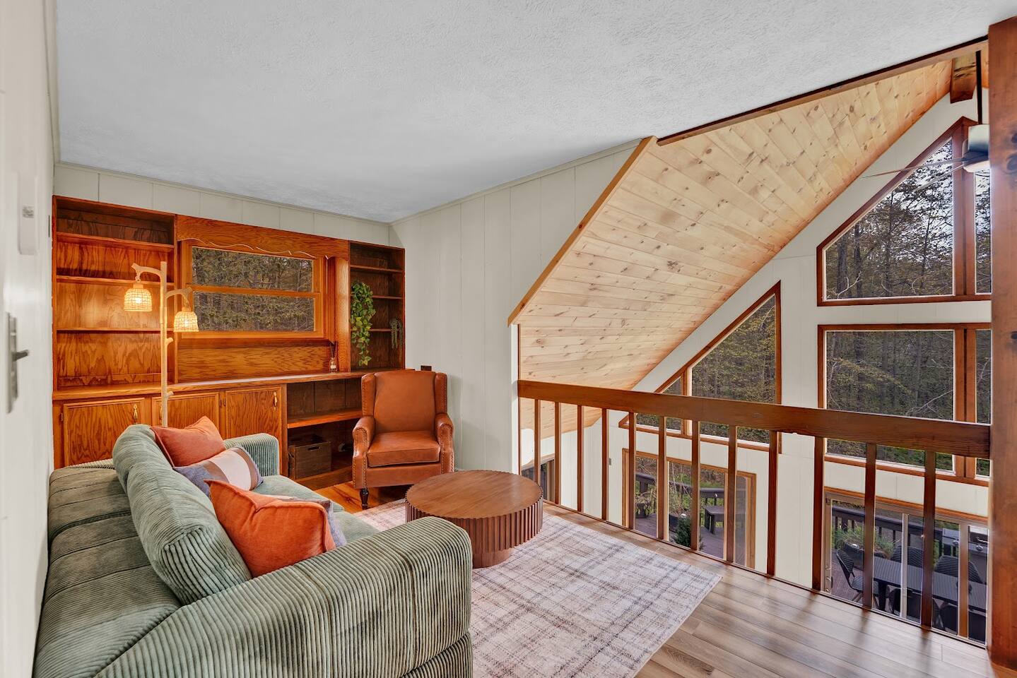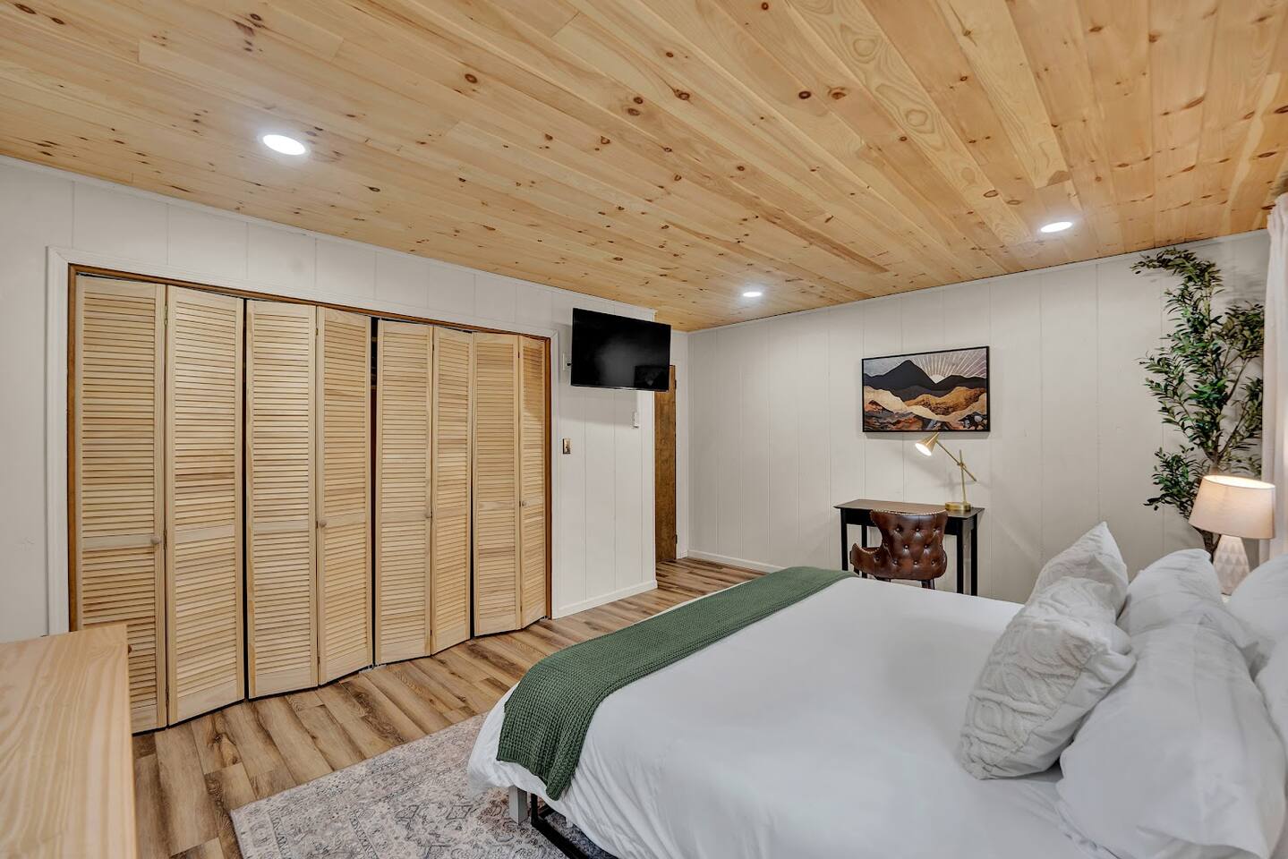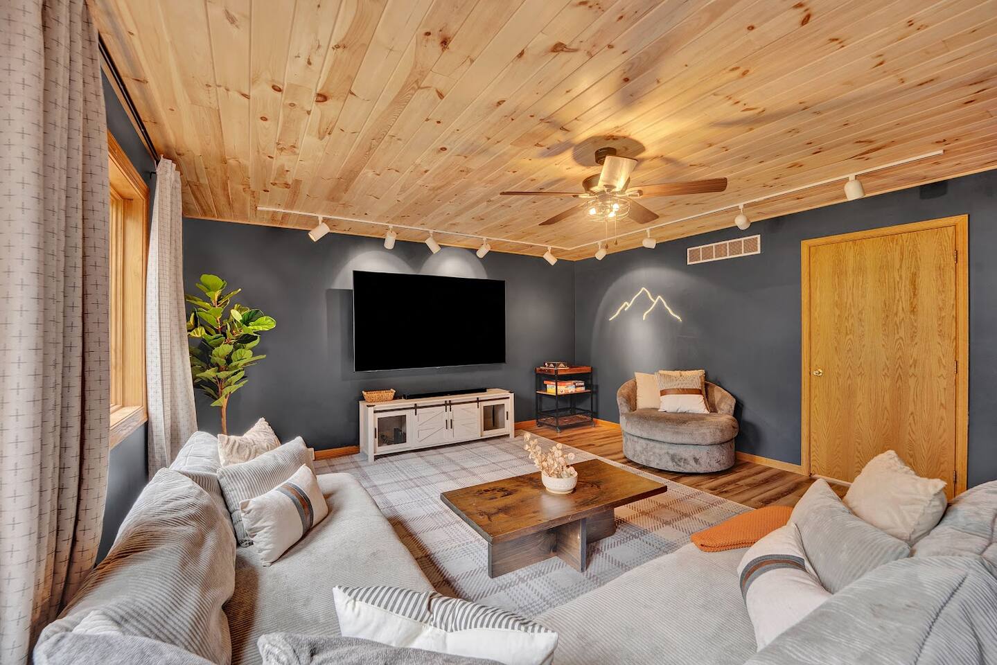 *NOTE: WE RECENTLY DID A COSMETIC REFRESH ON THE HOME & WE'RE SO EXCITED TO SHARE IT WITH YOU ALL! The current photos were taken BEFORE updates were made. The new photos will be posted shortly! Message us if you have any questions about the home!* --- Welcome to The Perch at Eagles View - a spacious, five-bedroom retreat with soaring ceilings, a stunning natural stone fireplace, and a sun-drenched deck made for outdoor living. Inside, you’ll find warm natural wood finishes and standout amenities, including a spa room with an indoor hot tub, fully stocked game room, home gym with sauna, and a cozy fire pit. Once you step into this Poconos oasis, you may never want to leave! KEY FEATURES: ⇢ 5 bedrooms, comfortably sleeping 12 guests (3 King, 2 Twin-over-Full bunk beds) & 4 full bathrooms ⇢ 8-person sunken hot tub in private spa room ⇢ Fully stocked game room with pool table, skeeball, multiple arcade games (NFL Blitz, Pacman, Street Fighter), darts, a wet bar, and two TVs. ⇢ Private fitness room with sauna, treadmill, exercise bike, weight bench & dumbbells ⇢ Outdoor Firepit with polywood Adirondack chairs ⇢ Cozy media room w/ oversized sectional & 85" smart TV ⇢ Access to premier Big Bass Lake Community private amenities, including: 3 lakes, 2 beaches, 2 pools (indoor + outdoor), basketball, tennis, pickleball, splash pad, playgrounds & more! ⇢ High-speed WiFi & Smart TVs ⇢ Kid + toddler-friendly w/ gate, high chair, and pack & play provided ↟ BEDROOMS ↟ The home's five bedrooms provide the perfect retreat for your entire group, offering privacy, comfort, and a sense of being completely at ease. Thoughtfully designed for both adults and children, these spaces make everyone feel right at home. The main floor features three bedrooms, one primary with a King sized bed and two bunk rooms located just off the living room. All bedrooms are conveniently located within steps from the two beautifully renovated full bathrooms on the floor and feature stylish window curtains, area rugs, and either a lounging chair or work desk. Upstairs are two additional bedrooms with king-sized beds, a sleek desk for any of those 'work-from-home' moments, and stylish finishes, providing ample space and ideal sleeping arrangements for everyone in your group - no fighting over who gets the master! ↟ BATHROOMS ↟ Each floor provides its own full-sized bathroom, ensuring plenty of space to refresh and recharge for your entire group. All three bathrooms on the main and upstairs floor feature large, beautifully tiled walk-in rain showers with glass enclosure and a vanity sink with a mirror. All bathrooms are fully stocked with complimentary hand towels, wash cloths, makeup towels, hair dryers, and premium bath-time essentials. ↟ KITCHEN AND DINING AREA ↟ Enjoy cooking in a kitchen that offers all the quality appliances, utensils and cookware needed to feel right at home! Think: all the pots & pans, serving trays, and bakeware you need to whip up a meal to remember. Steps away, the open floor plan flows seamlessly into a dining room that you won’t want to leave. Bathed in sunlight from floor-to-ceiling windows, the room is centered around an impressive stone fireplace and features a natural-wood dining table with seating for 12, making your mealtimes a truly special experience. Lastly, don’t forget to kickstart your mornings in the mountains with a thoughtfully designed caffeine station -- drip coffee and Keurig options, as well as a huge selection of Stash teas! ↟ LIVING ROOM ↟ Get cozy in the living room, with large glass windows framing a serene view of the surrounding trees, bringing in plenty of natural light and a peaceful connection to nature. Watch a movie on the WiFi-enabled 85-inch SmartTV or stream your favorite shows on any of the popular streaming apps you know and love. It’s a comfortable, thoughtfully equipped space—perfect for relaxing after a busy day or enjoying a quiet afternoon in. ↟ GAME ROOM ↟ Your go-to spot for entertainment, our first-floor game room is packed with activities to keep everyone engaged. Play classic arcade games like NFL Blitz, Street Fighter, and Pac-Man, enjoy a round of skeeball, or challenge each other at the pool table or dart board - all while watching the biggest sporting events or your favorite shows on the mounted smartTV. ↟ GYM & SPA ↟ Stay active and on track - even while you’re on vacation! - with our fully equipped home gym and fitness area. Break a sweat on the treadmill or exercise bike, or focus on strength training with the weight bench and dumbbells, or step into the sauna for a relaxing reset. On the main floor is a relaxing spa room with a sunken hot tub that comfortably seats eight and features recessed heat lamp bulbs in the ceiling! ↟ OUTDOOR SPACE ↟ The home is surrounded by a lush landscape with multiple outdoor seating areas. Just off the dining room is a large front deck with an outdoor dining table, hanging egg chair and stainless steel gas grill. Connected to the deck is also a three-season screened porch with polywood dining table with seating for four. Additionally, through the spa room is a second cozy deck with an outdoor sectional and additional table, perfect for those quiet mornings amongst nature with nothing but coffee and peace of mind. In the backyard is space for outdoor games, a fire pit area with polywood Adirondack chairs, and a hidden game room! - Tucked on the backside of the house, open the double doors to find a fun bonus space with putting green and outdoor games. ↟ BIG BASS LAKE AMENITIES ↟ You and your loved ones won't ever be bored with all the amenities that this private community has to offer. Enjoy access to 2 beaches, 2 pools (indoor + outdoor), basketball, tennis and pickleball courts, a splash pad, playgrounds & more! Kayaks & paddle boards are also available to rent from Thursday to Sunday, and must be reserved 48 hours in advance. Amenity passes are priced as fol