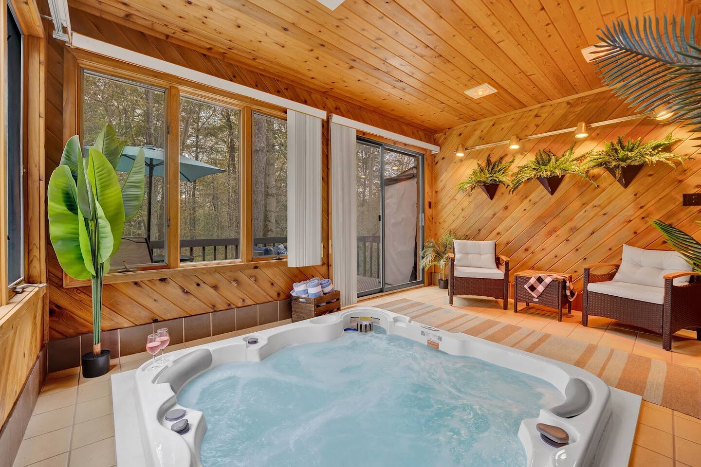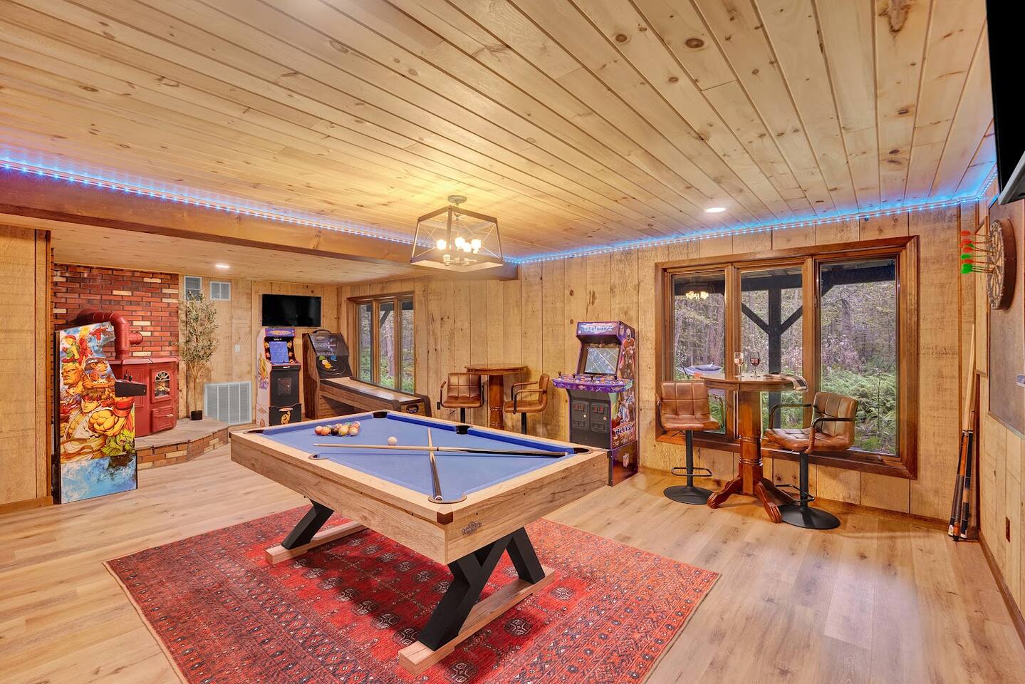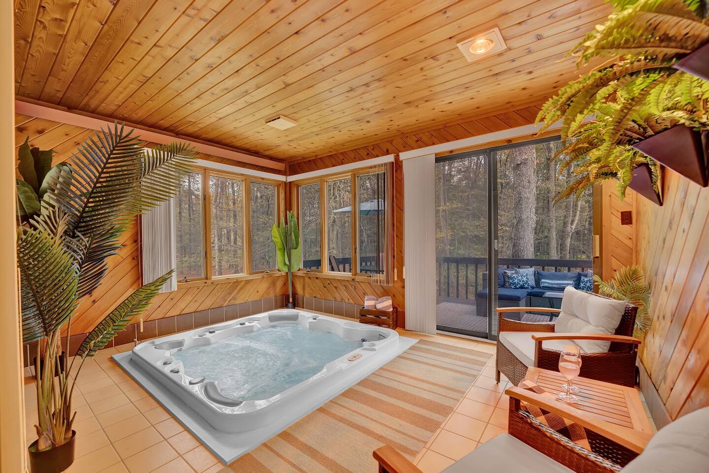 Escape to this newly renovated, designer cabin immersed in nature & packed with amenities! Enjoy the game room with pool table, skeeball, arcades & darts, relax in the sunken hot tub, sauna & private gym, or explore the community's 3 lakes, 2 beaches, splash pad, pool, sport courts & clubhouse! 🏖️ 3 min to beach & lake 🛝 25 min to Kalahari Waterpark ⛰️ 30 min to Camelback & Aquatopia Waterpark 🎰 30 min to Mount Airy Casino Experience the ultimate Poconos retreat with us-learn more below!