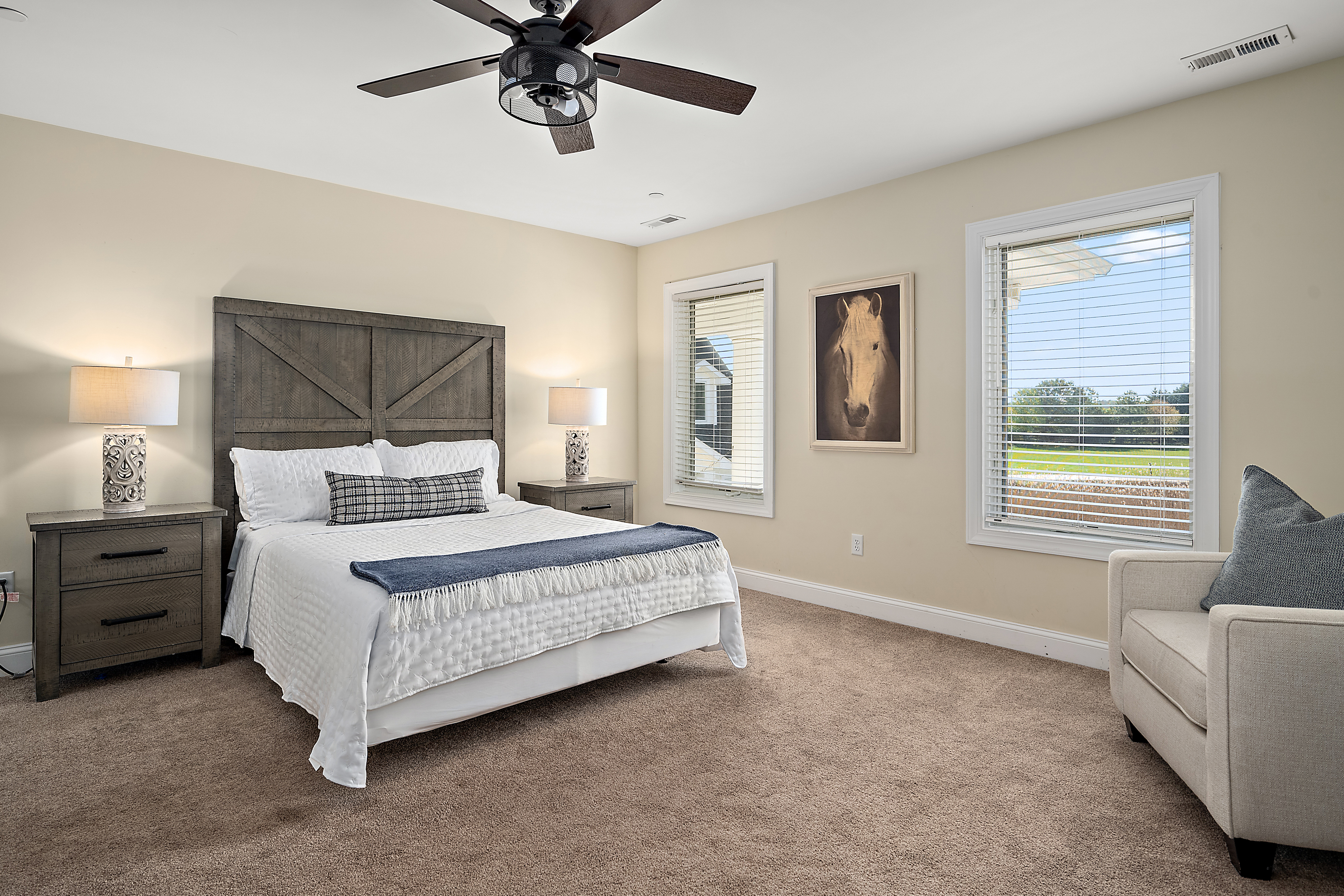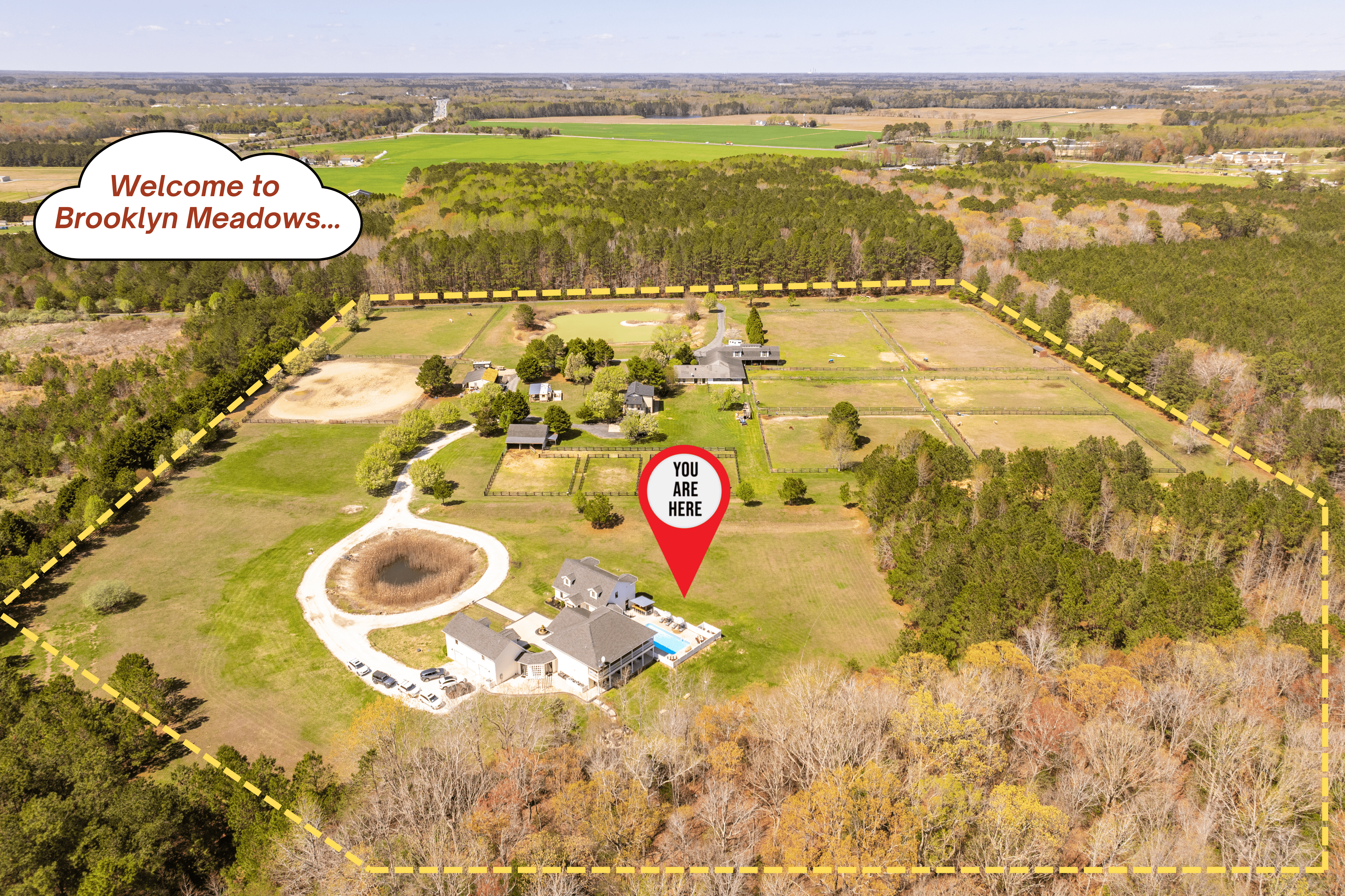 Welcome to Brooklyn Meadows, a luxurious 40-acre equestrian estate offering the perfect blend of elegance, comfort and tranquility. Whether you’re planning a large group getaway, corporate retreat, golf trip, or family vacation, this stunning 8-bedroom, 8,000+ square foot home is designed for unforgettable gatherings. The property features two beautiful homes: The Manor, a sprawling 6-bed, 7-bath main house, and The Equestry Inn, a quaint 2-bed, 1-bath guest house. ★ Past guests say.... ★ “We were there as a group of 20 guys on a golf trip. The house was clean and had everything we needed! Kitchen was stocked and between the main house and the guest house, we had plenty of room for everyone.” – Michael S. “The property is extensive, impressive, and private. It is close to the boardwalk, beach, shopping, and restaurants. The main house is huge and well furnished. Plenty of space to spread out and play games or relax.” – Patricia B. ------- ✨ KEY FEATURES ✨ ⇢ 8,000+ sq. ft. manor + guest house | 8 bedrooms | 8 baths | Sleeps 22 ⇢ Private in-ground pool with sun loungers, outdoor bar & teak dining tables ⇢ Game room with pool table, foosball, wet bar, and board games ⇢ Home gym with treadmill, elliptical, stationary bike and yoga mats ⇢ Luxury fire pit with polywood Adirondack chairs, hanging egg chairs & string lights ⇢ 40-acre equestrian estate with sweeping views ⇢ Less than 10 minutes to six of the areas best golf courses ⇢ Fully equipped kitchens in both the main house & guest house with modern, stainless steel appliances ⇢ WiFi, Smart TVs & streaming options throughout ⇢ Outdoor gas and charcoal grills, with patio seating for al fresco dining 🛏️ BEDROOMS ↟ The Manor offers six spacious bedrooms, each designed for relaxation and privacy. * Primary Suite (Main Wing): King bed, ensuite luxury bath w/ soaking tub + walk-in shower * Two Queen Bedrooms (Main Wing): Each w/ dresser, chair, & closet * Primary Suite (Left Wing): Queen bed, ensuite bath w/ walk-in shower * Queen Bedroom + Bunk Room (Left Wing): Share a full bath; bunk room has twin-over-double * All bedrooms (except bunk room) include Smart TVs 🪶 The main wing also features a private workspace and washer/dryer closet. The Equestry Inn offers a charming two-bedroom space, blending comfort and style perfectly. * Two Queen Bedrooms both feature a queen-sized bed * All bedrooms features smart TV, soft linens, and privacy away from the main house. 🛁 BATHROOMS ↟ Enjoy 8 beautifully designed bathrooms — 5 full and 2 half for the main house and 1 full bath for the guest house — stocked with plush towels, makeup cloths, and premium bath essentials. * Soaking tubs & double vanities in primary suites * Shower-tub combos for family convenience * Two powder rooms on the first floor * Guest house - walk-in shower 🍳 KITCHEN & DINING AREA ↟ The gourmet kitchen is a chef’s dream — stainless steel appliances, ample prep space, and everything you need to cook and gather. 🍽️ Seating for 16, incl. two dining tables and a large island for the main house and seating for 4 for the guest house. ☕ Fully stocked coffee & tea bar with K-cups and premium teas. 🌞 A secondary kitchenette near the pool is perfect for snacks or outdoor BBQ prep. 🛋️ LIVING AREAS ↟ The Manor (main house) * Gather in the main living room, featuring plush seating, cozy throw blankets, and a 65" Smart TV — ideal for movie nights or morning coffee chats. The second living room in the left wing adds extra lounging space with a sleeper sofa, leather swivel chairs, and another 65" Smart TV. The Equestry Inn (guest house) * Offers a charming living room with a smart TV and the property's third sleeper sofa, as well as a three-season sunroom with floor-to-ceiling windows. 🎯 GAME ROOM & GYM ↟ Challenge friends to a round of pool or foosball in the game room, complete with a wet bar, board games, lounge seating and 75" smartTV. Stay active in the home gym with a treadmill, elliptical, bike, yoga mats, and resistance bands. 🌅 OUTDOOR SPACE ↟ Step outside to your private oasis — an 18’ x 36’ in-ground pool surrounded by sun loungers, teak dining tables, an outdoor bar, gas BBQ grill and a cushioned egg chair. Follow the string-light walkway to the custom fire pit, where Adirondack and egg chairs invite you to unwind under starry skies. The professionally landscaped grounds offer breathtaking sunrises and sunsets across open pastures and grazing horses. 🗓️ Pool open May - October (not heated)