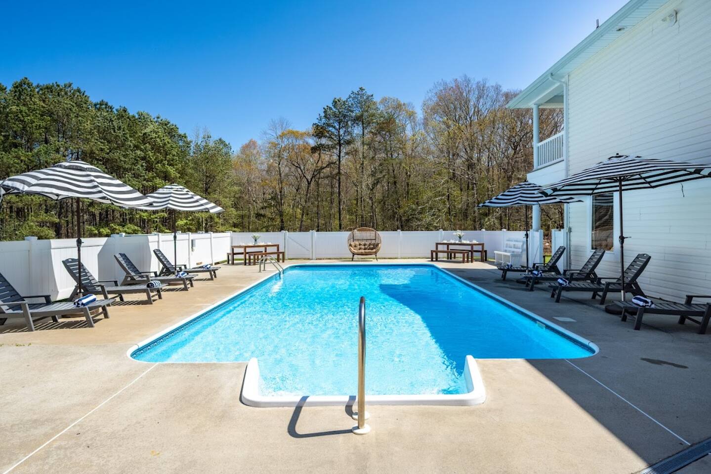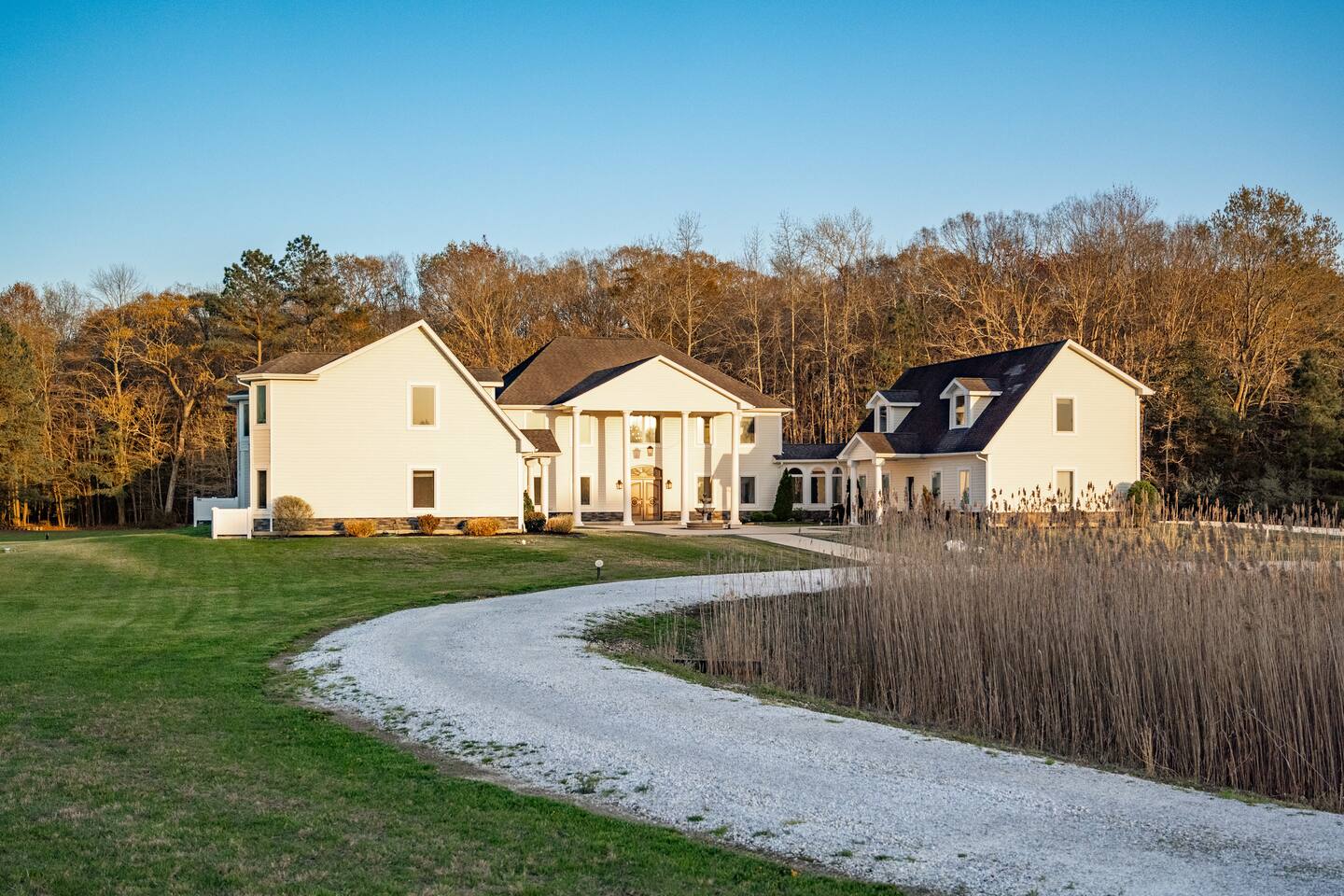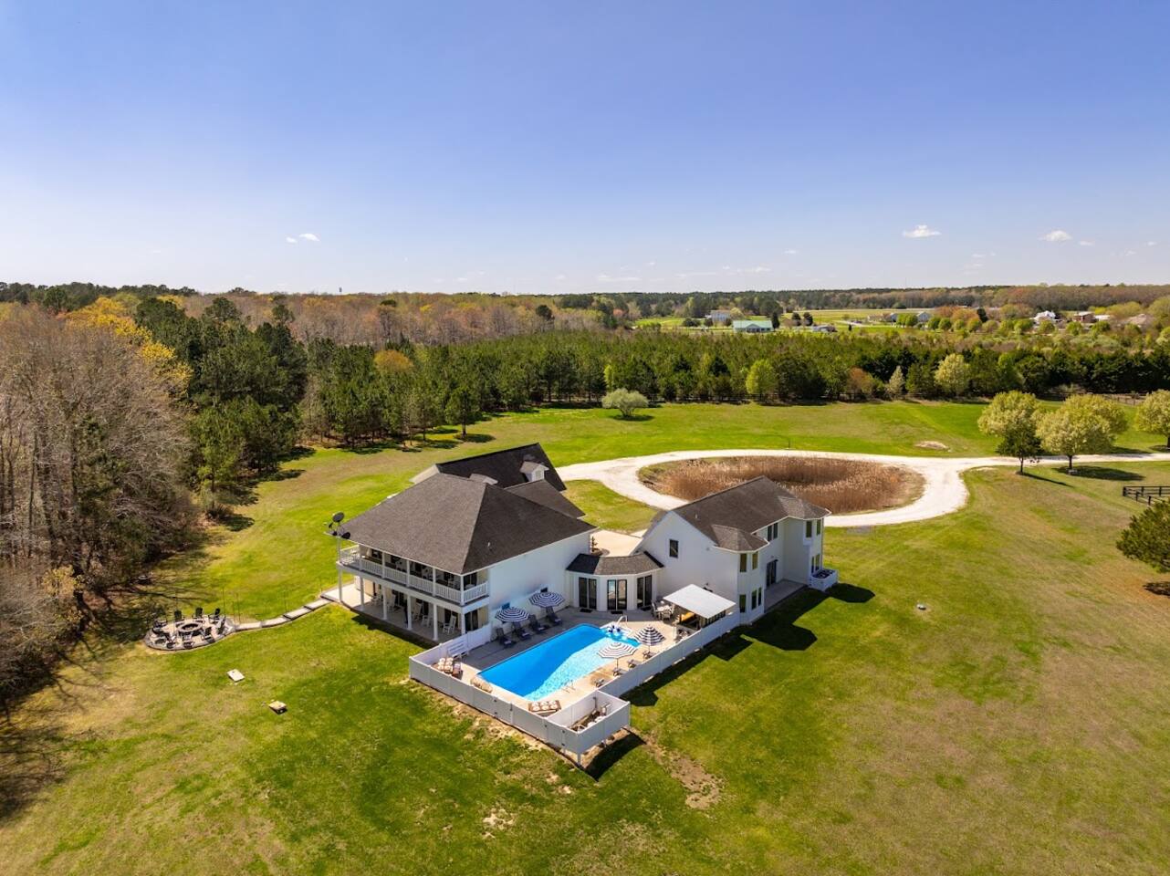 Welcome to Brooklyn Meadows - The Manor, located on a luxurious 40-acre equestrian estate and offering the perfect blend of elegance, comfort and tranquility. Whether youβre planning a large group getaway, corporate retreat, golf trip, or family vacation, this stunning 6-bedroom, 8,000+ square foot home is designed for unforgettable gatherings. β Past guest have said... β βThe property is extensive, impressive, and private. It is close to the boardwalk, beach, shopping, and restaurants.β β Patricia B. ------- KEY FEATURES: β’ 8,000+ sq. ft. for a total of 6 bedrooms & 6 baths (sleeps 17 total) β’ Private in-ground pool with sun loungers, two teakwood outdoor dining tables, a cushioned lounger & an outdoor bar β’ Large game room with a pool table, foosball table, wet bar, and board games β’ Fitness room featuring a treadmill, elliptical, exercise bike, yoga mats and resistance bands β’ Luxury outdoor fire pit with polywood Adirondack chairs, hanging egg chairs, and bistro string lights β’ Stunning 40-acre grounds ft. rolling horse pastures β’ Less than 10 minutes to six of the areas best golf courses β’ Fully equipped kitchen with modern, stainless steel appliances β’ Modern amenities including high-speed WiFi, smart TVs, and streaming options β’ Outdoor gas and charcoal grills, with patio seating for al fresco dining NOTE: This listing is Brooklyn Meadows - The Manor (main house) ONLY. If you'd like to reserve the Manor & Equestry Inn (guest house) for groups up to 22 guests, please find the other listing. β BEDROOMS β The home's spacious six bedrooms provide a perfect blend of privacy and comfort. The main wing boasts three beautifully appointed bedrooms and a large covered porch with rocking chairs that extends the full length of the wing. The spacious primary suite features a king-sized bed and an en-suite bathroom with a walk-in shower and soaking tub. Two additional bedrooms each feature a queen-sized bed, dresser, sitting chair, and closet. The main wing also features the private workspace and washer/dryer closet. The second primary suite is located in the left wing of the home, featuring a queen bed and en-suite bathroom with large walk-in shower. The other two bedrooms β one with a queen bed and the other with a twin-over-double bunk bed β share a full bathroom. Every bedroom in the house except the bunk room is equipped with a smart TV. Note that all bedrooms in the main house are located on the upstairs level. β BATHROOMS β The home boasts 7 beautifully designed bathrooms β 5 full and 2 half. The main wingβs primary en suite bathroom features a soaking tub, spacious walk-in shower, and a double vanity, creating the perfect retreat for relaxation. The other full bathrooms include a second en suite bathroom with a walk-in shower and a large double vanity, and several shower-tub combos, ideal for families traveling with little ones. The first floor also offers two convenient powder rooms. We proudly stock the bathrooms with complimentary bath towels, hand towels, washcloths, makeup towels and bath-time essentials! β KITCHEN & DINING AREA β The home's gourmet kitchen is a chefβs dream, outfitted with high-end stainless steel appliances, ample counter space, and a full set of cookware, dinnerware and utensils. Two large dining tables and an expansive island provide seating for 22. The left wing also includes a cozy eat-in kitchenette with direct access to the pool and outdoor BBQ grill, providing added convenience for snacking and meal prep. And of course, thereβs coffee and tea! Start your mornings with our fully stocked caffeine station, offering both ground coffee and K-cup options, as well as a variety of premium teas. β LIVING AREAS β The Manor boasts a spacious and inviting living area with large couches, comfy throw pillows, and a 65" smart TV. This open-concept space seamlessly connects to the kitchen, creating a warm and social atmosphere. In the house's left wing, there is also a second living room with a sleeper sofa, rustic brown leather swivel chairs and another 65" smart TV. β GAME ROOM & GYM β For those looking for some adrenaline or late-night competition, the Manor also features a dedicated game room and home gym. The game room boasts a pool table, foosball table, wet bar, board games, and multiple couches, including one sleeper sofa. The gym offers a treadmill, elliptical, exercise bike, yoga mats and resistance bands. β OUTDOOR SPACE β The home's private, in-ground 18' x 36' pool invites you to cool off or lounge in the sun. The surrounding patio features 8 sun loungers, two brand-new teakwood dining tables, and an oversized cushioned egg chair lounger. The warm and inviting atmosphere is perfect for lazy days with those you love or evening dining and cocktails at the outdoor bar. Follow the charming, string-light adorned walkway to the custom fire pit, where polywood Adirondack chairs and stylish hanging egg-chairs provide the perfect setting for roasting marshmallows and relaxing under the stars. The estateβs professionally landscaped grounds offer breathtaking views of pastures with grazing horses, as well as stunning sunrises and sunsets over the tree-lined horizon. IMPORTANT NOTES: -The pool is open seasonally May - October and is NOT heated.