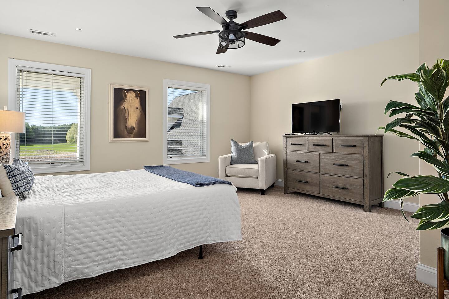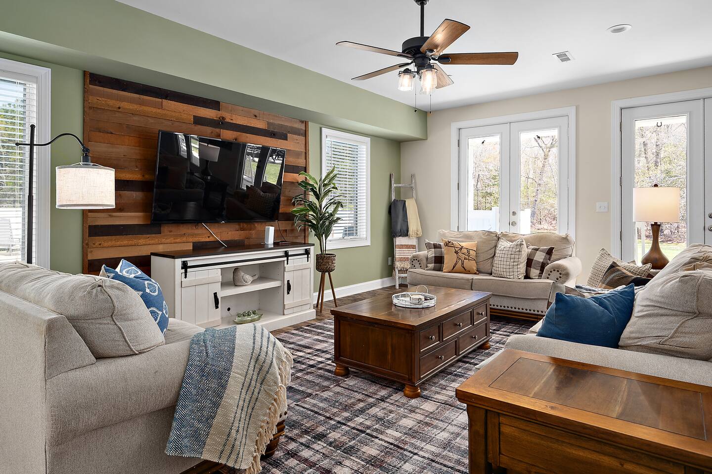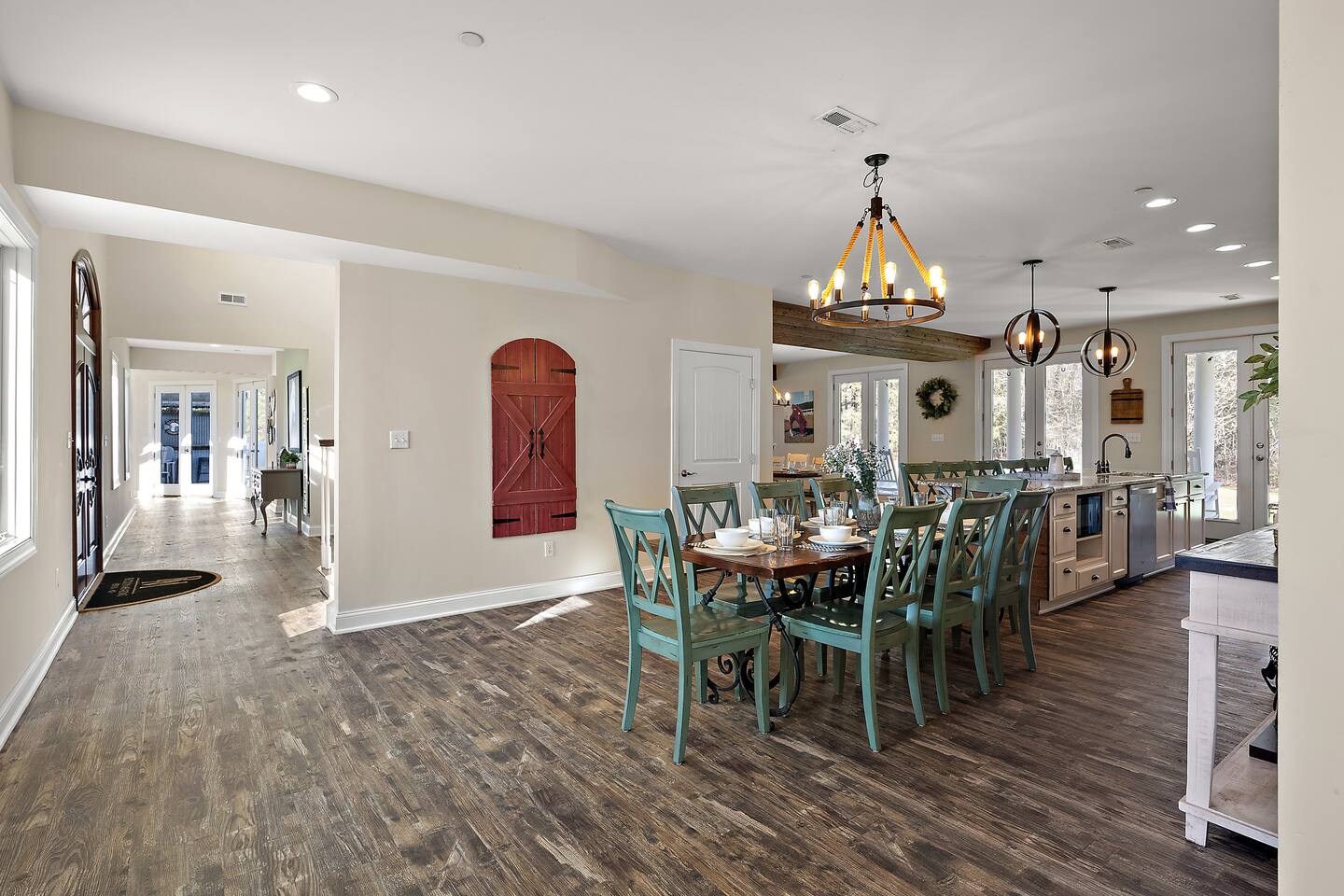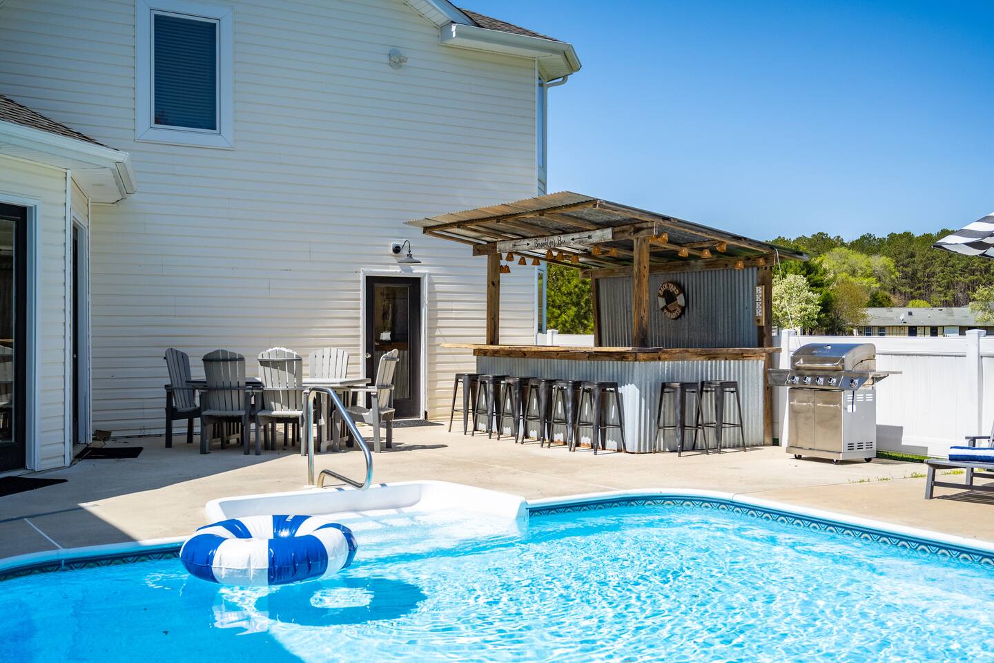 Welcome to Brooklyn Meadows - The Manor, located on a luxurious 40-acre equestrian estate and offering the perfect blend of elegance, comfort and tranquility. Whether youβre planning a large group getaway, corporate retreat, golf trip, or family vacation, this stunning 6-bedroom, 8,000+ square foot home is designed for unforgettable gatherings. β Past guest have said... β βThe property is extensive, impressive, and private. It is close to the boardwalk, beach, shopping, and restaurants.β β Patricia B. ------- KEY FEATURES: β’ 8,000+ sq. ft. for a total of 6 bedrooms & 6 baths (sleeps 17 total) β’ Private in-ground pool with sun loungers, two teakwood outdoor dining tables, a cushioned lounger & an outdoor bar β’ Large game room with a pool table, foosball table, wet bar, and board games β’ Fitness room featuring a treadmill, elliptical, exercise bike, yoga mats and resistance bands β’ Luxury outdoor fire pit with polywood Adirondack chairs, hanging egg chairs, and bistro string lights β’ Stunning 40-acre grounds ft. rolling horse pastures β’ Less than 10 minutes to six of the areas best golf courses β’ Fully equipped kitchen with modern, stainless steel appliances β’ Modern amenities including high-speed WiFi, smart TVs, and streaming options β’ Outdoor gas and charcoal grills, with patio seating for al fresco dining NOTE: This listing is Brooklyn Meadows - The Manor (main house) ONLY. If you'd like to reserve the Manor & Equestry Inn (guest house) for groups up to 22 guests, please find the other listing. β BEDROOMS β The home's spacious six bedrooms provide a perfect blend of privacy and comfort. The main wing boasts three beautifully appointed bedrooms and a large covered porch with rocking chairs that extends the full length of the wing. The spacious primary suite features a king-sized bed and an en-suite bathroom with a walk-in shower and soaking tub. Two additional bedrooms each feature a queen-sized bed, dresser, sitting chair, and closet. The main wing also features the private workspace and washer/dryer closet. The second primary suite is located in the left wing of the home, featuring a queen bed and en-suite bathroom with large walk-in shower. The other two bedrooms β one with a queen bed and the other with a twin-over-double bunk bed β share a full bathroom. Every bedroom in the house except the bunk room is equipped with a smart TV. Note that all bedrooms in the main house are located on the upstairs level. β BATHROOMS β The home boasts 7 beautifully designed bathrooms β 5 full and 2 half. The main wingβs primary en suite bathroom features a soaking tub, spacious walk-in shower, and a double vanity, creating the perfect retreat for relaxation. The other full bathrooms include a second en suite bathroom with a walk-in shower and a large double vanity, and several shower-tub combos, ideal for families traveling with little ones. The first floor also offers two convenient powder rooms. We proudly stock the bathrooms with complimentary bath towels, hand towels, washcloths, makeup towels and bath-time essentials! β KITCHEN & DINING AREA β The home's gourmet kitchen is a chefβs dream, outfitted with high-end stainless steel appliances, ample counter space, and a full set of cookware, dinnerware and utensils. Two large dining tables and an expansive island provide seating for 22. The left wing also includes a cozy eat-in kitchenette with direct access to the pool and outdoor BBQ grill, providing added convenience for snacking and meal prep. And of course, thereβs coffee and tea! Start your mornings with our fully stocked caffeine station, offering both ground coffee and K-cup options, as well as a variety of premium teas. β LIVING AREAS β The Manor boasts a spacious and inviting living area with large couches, comfy throw pillows, and a 65" smart TV. This open-concept space seamlessly connects to the kitchen, creating a warm and social atmosphere. In the house's left wing, there is also a second living room with a sleeper sofa, rustic brown leather swivel chairs and another 65" smart TV. β GAME ROOM & GYM β For those looking for some adrenaline or late-night competition, the Manor also features a dedicated game room and home gym. The game room boasts a pool table, foosball table, wet bar, board games, and multiple couches, including one sleeper sofa. The gym offers a treadmill, elliptical, exercise bike, yoga mats and resistance bands. β OUTDOOR SPACE β The home's private, in-ground 18' x 36' pool invites you to cool off or lounge in the sun. The surrounding patio features 8 sun loungers, two brand-new teakwood dining tables, and an oversized cushioned egg chair lounger. The warm and inviting atmosphere is perfect for lazy days with those you love or evening dining and cocktails at the outdoor bar. Follow the charming, string-light adorned walkway to the custom fire pit, where polywood Adirondack chairs and stylish hanging egg-chairs provide the perfect setting for roasting marshmallows and relaxing under the stars. The estateβs professionally landscaped grounds offer breathtaking views of pastures with grazing horses, as well as stunning sunrises and sunsets over the tree-lined horizon. IMPORTANT NOTES: -The pool is open seasonally May - October and is NOT heated.