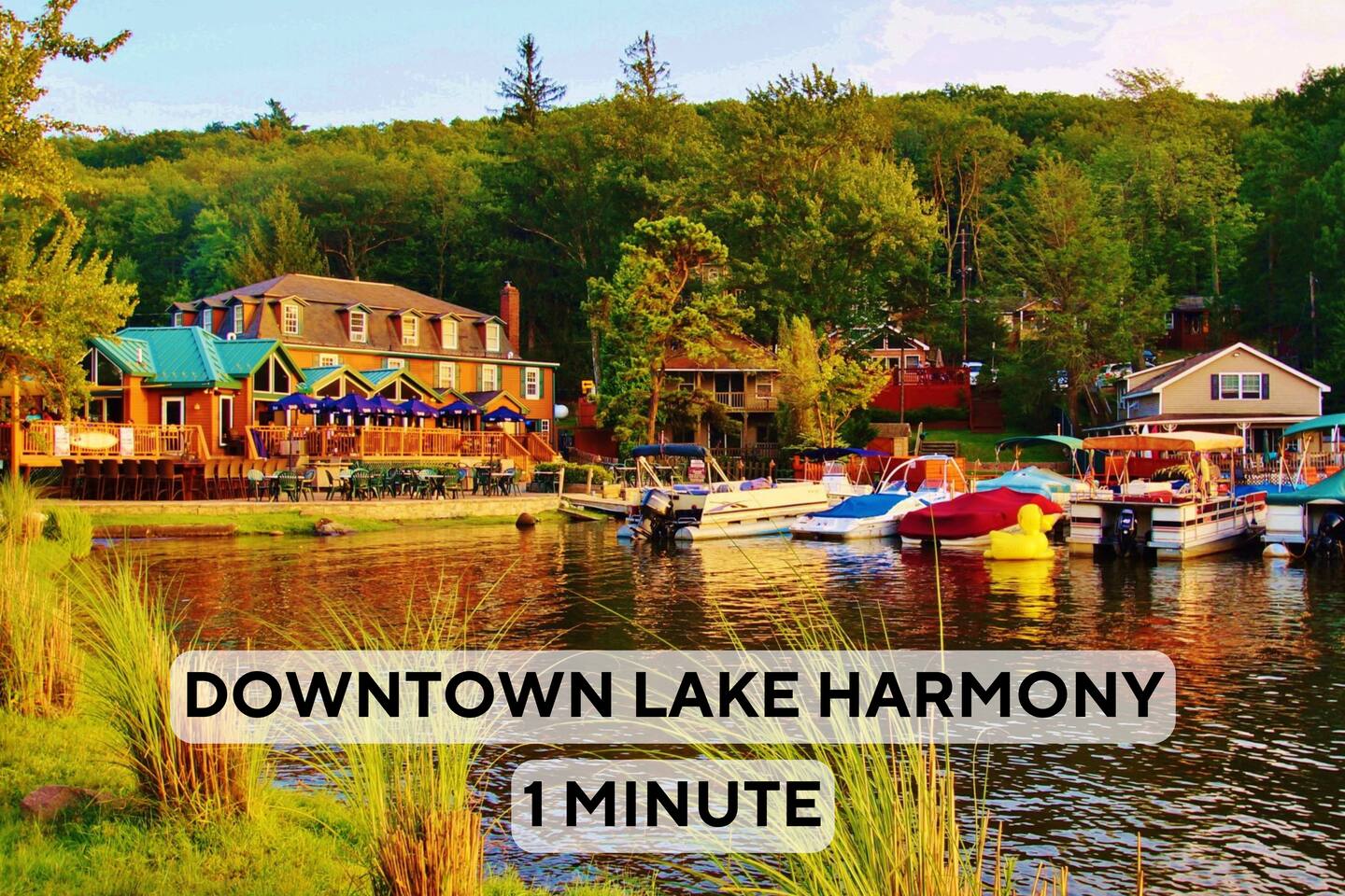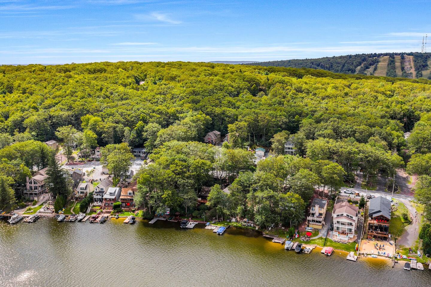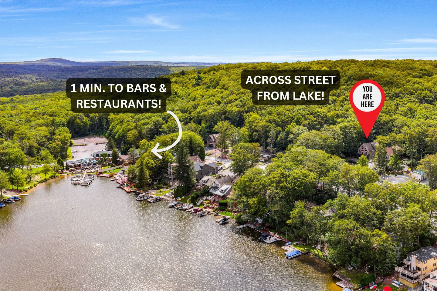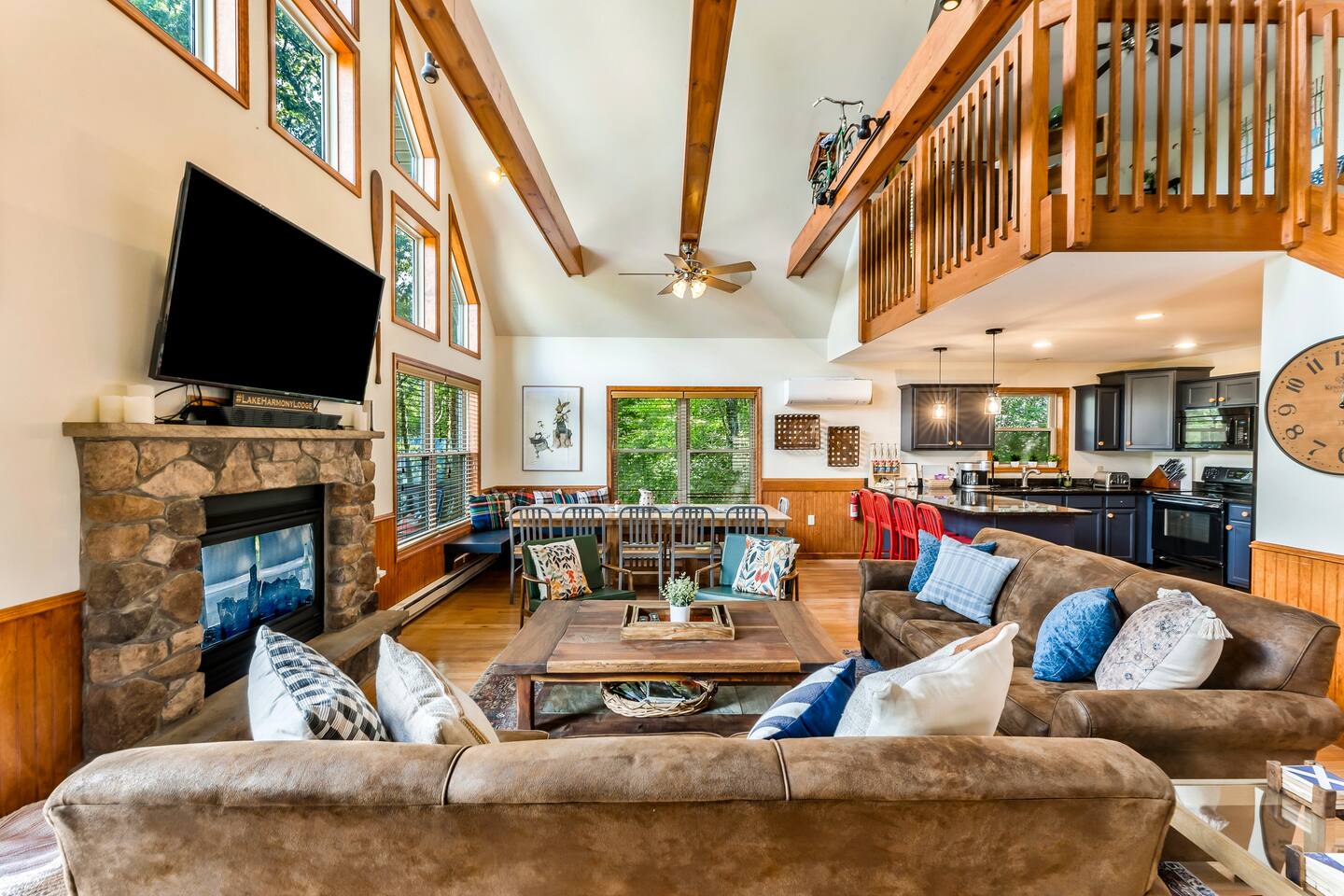 Welcome to Lake Harmony Lodge, a charming three-story chalet that blends modern luxury with classic mountain charm. Every detail has been thoughtfully designed, with a central location, direct lake views and access, and a host of amenities to ensure you experience the best of the Poconos and Lake Harmony. ↟ Past guests have said... "The house was perfect for our group - spacious, comfortable, and had music playing throughout. The beds were incredibly comfortable, and the view of the lake from the front porch was absolutely beautiful." - Maureen "Great vacation house. Lots of room for 13 guests. Beds were soft but comfortable. All amenities were plentiful and high end. Host was very responsive and never made you feel like you were bothering him." - Linda ↟ ---- KEY FEATURES: ⇢ 6 bedrooms & 13 beds, comfortably sleeping 22 guests (2 King, 1 Queen, 4 Full, 2 Full-Over-Twin Bunk Beds & 1 Trundle w. pull-out) ⇢ Floor-to-ceiling indoor-outdoor fireplace ⇢ 8-person hot tub with LAKE VIEWS ⇢ Rec room with pool table, arcade machine & 65" smartTV ⇢ Large deck overlooking the lake with brand-new outdoor sectional and dual-sided fireplace ⇢ Spacious fire pit with ample seating ⇢ Shared lake access via dock for swimming and kayak launching (kayaks provided!) ⇢ Heating & AC throughout ⇢ Level 2 Electric Vehicle (EV) charger available for use during your stay ⇢ Remote-work friendly with high-speed WiFi and a private desk ⇢ Modern, well-equipped kitchen with brand-new cookware and dinnerware ⇢ Kid-friendly amenities, including a high chair, baby gate, and pack 'n play ↟ BEDROOMS ↟ The home's 6 bedrooms provide the perfect retreat for your entire group, offering privacy, comfort, and a sense of being completely at ease. Thoughtfully designed for both adults and children, these spaces make everyone feel right at home, ensuring your vacation is effortless and filled with joy. Quietly tucked away on the first floor are two bedrooms, each with one metal bunk bed (twin over full) and one full bed, dressed in bright colors and playful, outdoor-inspired themes. The main floor hosts two bedrooms just off the kitchen. The first is a thoughtfully appointed Queen bedroom with fun, yet elegant wallpaper and corner desk, perfect for those work-from-home moments. Next door, you'll find an impressive and colorful King bedroom, conveniently located next to a full bathroom. Upstairs, you’ll be greeted by the loft’s immaculate charm, bright colors and fantastic views. The loft includes a cute rocking chair, kids bean bag chair, and a twin-sized daybed with a trundle that pulls another twin-sized bed out from underneath. Adjacent to the loft is a fun, fishing-themed bedroom with two full beds and a second spacious primary bedroom with a King bed. All bedrooms feature a mounted smart TV with cable and streaming apps, a closet, side table, dresser, and lamp, ensuring everyone has everything they need for a comfortable stay! ↟ BATHROOMS ↟ Each floor offers its own full-sized bathroom with ample space for everyone to refresh and recharge. The second and third-floor bathrooms feature a vanity sink and walk-in shower. On the main floor is another full bath with a shower-tub combo, perfect for a tranquil soak or playful bath time with the little ones. All bathrooms are fully stocked with complimentary hand towels, wash cloths, makeup towels, hair dryers, and premium bath-time essentials to ensure you feel pampered. ↟ KITCHEN ↟ The kitchen is the heart of the home, designed to inspire your inner chef with its modern layout and direct access to the dining and living areas. We provide all the quality appliances, brand new cookware, dinnerware, and utensils needed to make you feel right at home and cook up a meal to remember. Of course, we haven’t forgotten about coffee - or tea! Kickstart your mornings in the mountains with a Keurig coffee machine, offering both ground coffee and K-cup brewing options, as well as a variety of Torani syrups. For tea lovers, our extensive selection of Stash teas provides a delightful variety to suit every taste. ↟ LIVING ROOMS ↟ Step into the sun-drenched living room, where the dual-sided, floor-to-ceiling fireplace invites you to cozy up and unwind. Playful decor, plush leather couches, and an enchanting banquette seating area create an atmosphere of comfort and connection. Entertainment options are abound with a 65” smart TV featuring your favorite streaming apps and a premium cable channel package, as well as an extensive collection of games in the cupboard along the wall! Head downstairs to the recreation room, brimming with fun and excitement. Enjoy a friendly competition at the pool table, take a nostalgic dive into the arcade machine's 40 vintage games, or explore another treasure trove of board games. If relaxation is your goal, sink into the comfy sectional and enjoy another 65” smart TV for movie nights. Both floors are also equipped with a Bluetooth enabled built-in speaker system for easy connection! ↟ DINING AREA ↟ The dining area, with its stunning wooden 12-person table and cozy banquette seating, is the perfect gathering spot for shared meals, lively conversations, and cherished memories. Large windows provide corner views of Lake Harmony, adding a touch of magic to every moment. Additional counter seating for four ensures plenty of room for everyone. ↟ OUTDOOR SPACE ↟ The outdoor areas are designed to rejuvenate and delight. Step onto the expansive deck to sip your morning coffee while taking in serene lake views from the Adirondack chairs. Snuggle into the teakwood lounger with a book, or gather around the dual-sided indoor/outdoor fireplace on the luxurious sectional for evenings filled with warmth and laughter. Downstairs, the 8-person hot tub offers the ultimate in relaxation, complete with privacy curtains. Nearby, an oversized daybed swing beckons you to unwind. In the backyard, gather around the fire pit with ample 