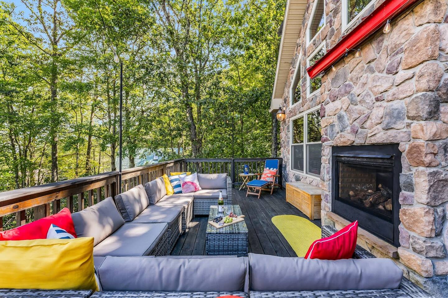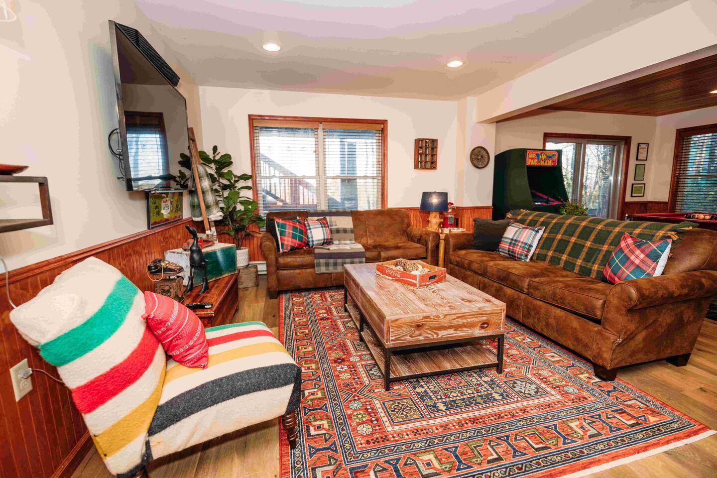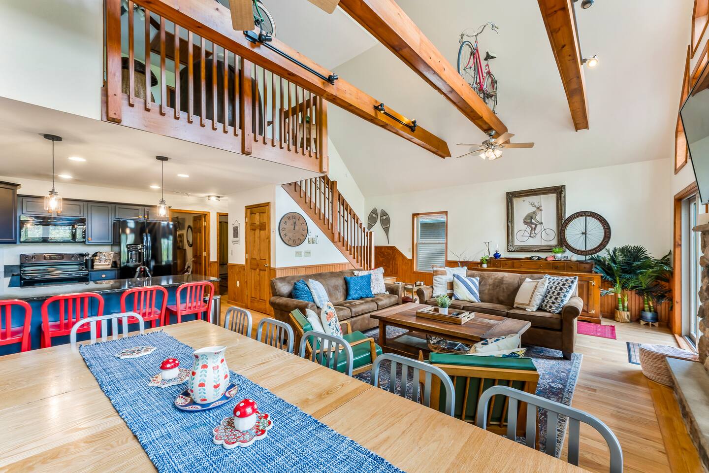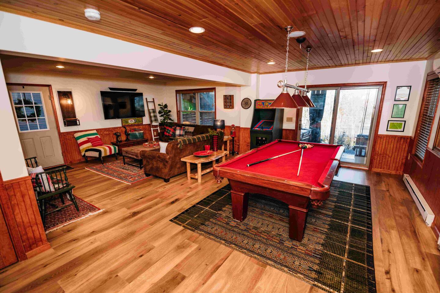 Welcome to Lake Harmony Lodge, a charming three-story chalet that blends modern luxury with classic mountain charm. Every detail has been thoughtfully designed, with a central location, direct lake views and access, and a host of amenities to ensure you experience the best of the Poconos and Lake Harmony. ↟ Past guests have said... "The house was perfect for our group - spacious, comfortable, and had music playing throughout. The beds were incredibly comfortable, and the view of the lake from the front porch was absolutely beautiful." - Maureen "Great vacation house. Lots of room for 13 guests. Beds were soft but comfortable. All amenities were plentiful and high end. Host was very responsive and never made you feel like you were bothering him." - Linda ↟ ---- KEY FEATURES: ⇢ 6 bedrooms & 13 beds, comfortably sleeping 22 guests (2 King, 1 Queen, 4 Full, 2 Full-Over-Twin Bunk Beds & 1 Trundle w. pull-out) ⇢ Floor-to-ceiling indoor-outdoor fireplace ⇢ 8-person hot tub with LAKE VIEWS ⇢ Rec room with pool table, arcade machine & 65" smartTV ⇢ Large deck overlooking the lake with brand-new outdoor sectional and dual-sided fireplace ⇢ Spacious fire pit with ample seating ⇢ Shared lake access via dock for swimming and kayak launching (kayaks provided!) ⇢ Heating & AC throughout ⇢ Level 2 Electric Vehicle (EV) charger available for use during your stay ⇢ Remote-work friendly with high-speed WiFi and a private desk ⇢ Modern, well-equipped kitchen with brand-new cookware and dinnerware ⇢ Kid-friendly amenities, including a high chair, baby gate, and pack 'n play ↟ BEDROOMS ↟ The home's 6 bedrooms provide the perfect retreat for your entire group, offering privacy, comfort, and a sense of being completely at ease. Thoughtfully designed for both adults and children, these spaces make everyone feel right at home, ensuring your vacation is effortless and filled with joy. Quietly tucked away on the first floor are two bedrooms, each with one metal bunk bed (twin over full) and one full bed, dressed in bright colors and playful, outdoor-inspired themes. The main floor hosts two bedrooms just off the kitchen. The first is a thoughtfully appointed Queen bedroom with fun, yet elegant wallpaper and corner desk, perfect for those work-from-home moments. Next door, you'll find an impressive and colorful King bedroom, conveniently located next to a full bathroom. Upstairs, you’ll be greeted by the loft’s immaculate charm, bright colors and fantastic views. The loft includes a cute rocking chair, kids bean bag chair, and a twin-sized daybed with a trundle that pulls another twin-sized bed out from underneath. Adjacent to the loft is a fun, fishing-themed bedroom with two full beds and a second spacious primary bedroom with a King bed. All bedrooms feature a mounted smart TV with cable and streaming apps, a closet, side table, dresser, and lamp, ensuring everyone has everything they need for a comfortable stay! ↟ BATHROOMS ↟ Each floor offers its own full-sized bathroom with ample space for everyone to refresh and recharge. The second and third-floor bathrooms feature a vanity sink and walk-in shower. On the main floor is another full bath with a shower-tub combo, perfect for a tranquil soak or playful bath time with the little ones. All bathrooms are fully stocked with complimentary hand towels, wash cloths, makeup towels, hair dryers, and premium bath-time essentials to ensure you feel pampered. ↟ KITCHEN ↟ The kitchen is the heart of the home, designed to inspire your inner chef with its modern layout and direct access to the dining and living areas. We provide all the quality appliances, brand new cookware, dinnerware, and utensils needed to make you feel right at home and cook up a meal to remember. Of course, we haven’t forgotten about coffee - or tea! Kickstart your mornings in the mountains with a Keurig coffee machine, offering both ground coffee and K-cup brewing options, as well as a variety of Torani syrups. For tea lovers, our extensive selection of Stash teas provides a delightful variety to suit every taste. ↟ LIVING ROOMS ↟ Step into the sun-drenched living room, where the dual-sided, floor-to-ceiling fireplace invites you to cozy up and unwind. Playful decor, plush leather couches, and an enchanting banquette seating area create an atmosphere of comfort and connection. Entertainment options are abound with a 65” smart TV featuring your favorite streaming apps and a premium cable channel package, as well as an extensive collection of games in the cupboard along the wall! Head downstairs to the recreation room, brimming with fun and excitement. Enjoy a friendly competition at the pool table, take a nostalgic dive into the arcade machine's 40 vintage games, or explore another treasure trove of board games. If relaxation is your goal, sink into the comfy sectional and enjoy another 65” smart TV for movie nights. Both floors are also equipped with a Bluetooth enabled built-in speaker system for easy connection! ↟ DINING AREA ↟ The dining area, with its stunning wooden 12-person table and cozy banquette seating, is the perfect gathering spot for shared meals, lively conversations, and cherished memories. Large windows provide corner views of Lake Harmony, adding a touch of magic to every moment. Additional counter seating for four ensures plenty of room for everyone. ↟ OUTDOOR SPACE ↟ The outdoor areas are designed to rejuvenate and delight. Step onto the expansive deck to sip your morning coffee while taking in serene lake views from the Adirondack chairs. Snuggle into the teakwood lounger with a book, or gather around the dual-sided indoor/outdoor fireplace on the luxurious sectional for evenings filled with warmth and laughter. Downstairs, the 8-person hot tub offers the ultimate in relaxation, complete with privacy curtains. Nearby, an oversized daybed swing beckons you to unwind. In the backyard, gather around the fire pit with ample 