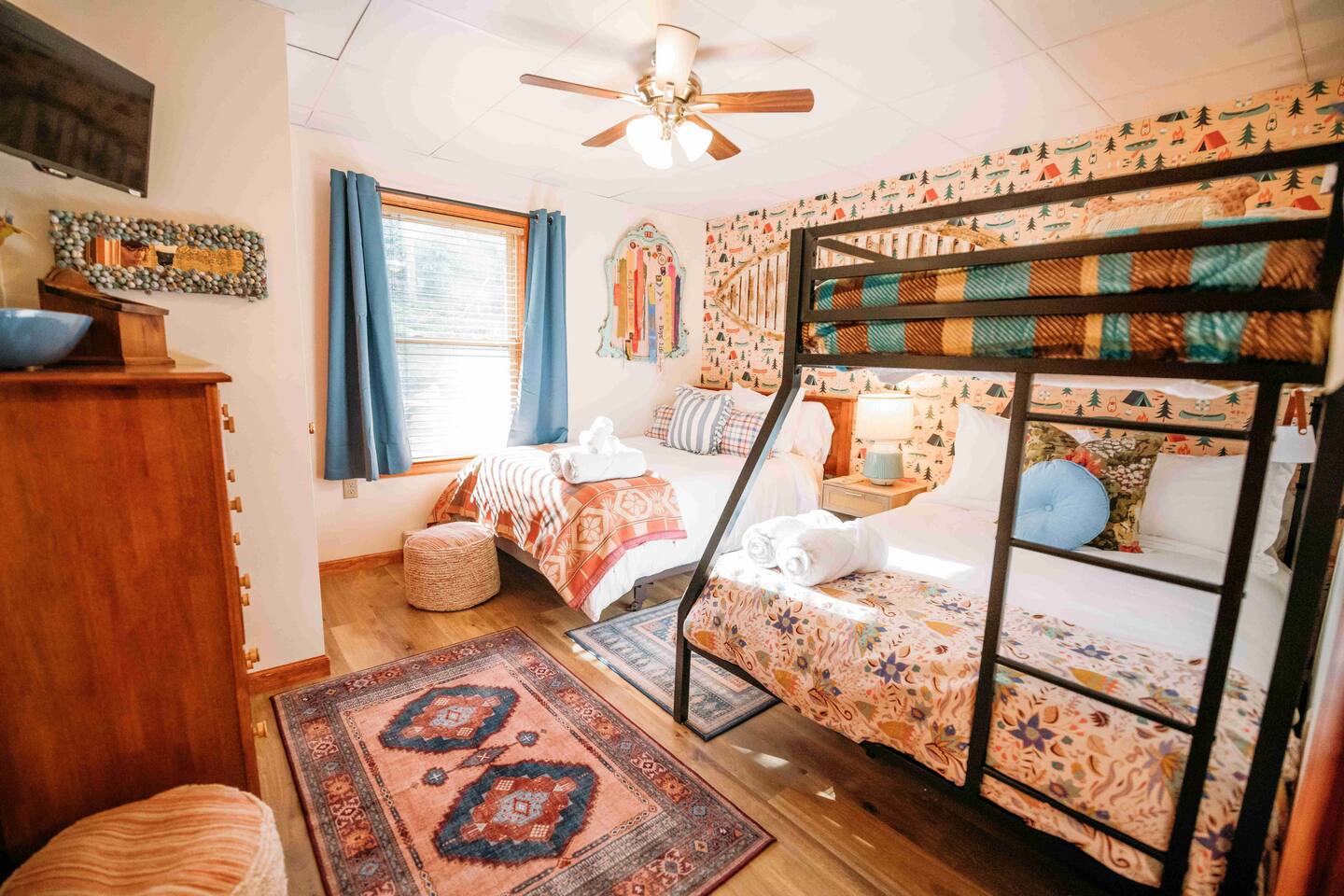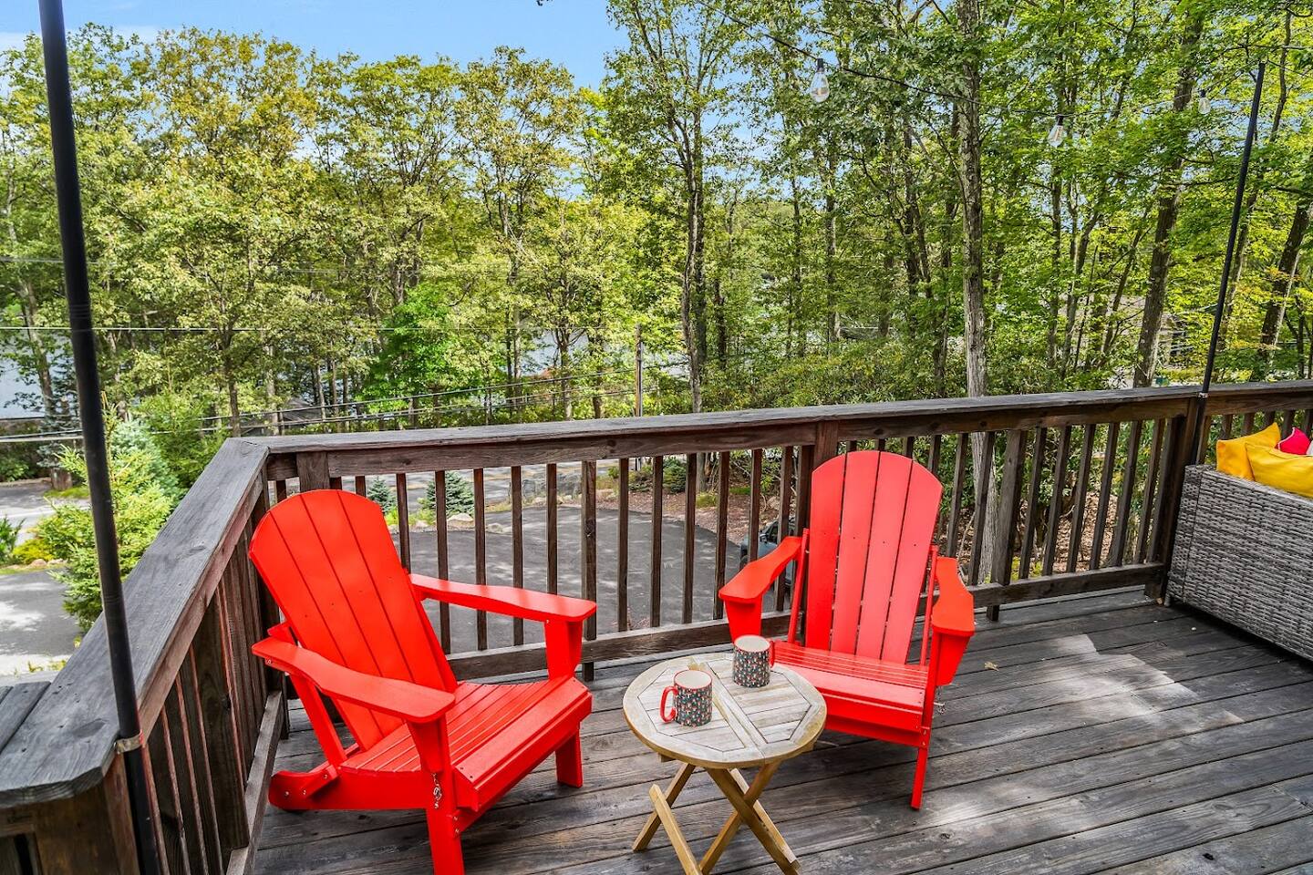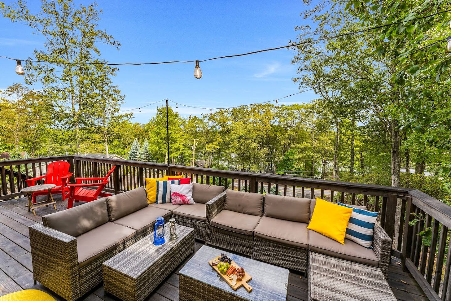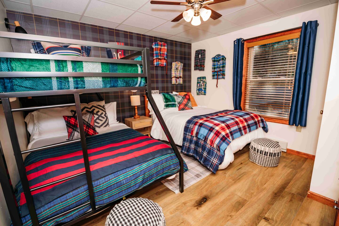 Welcome to Lake Harmony Lodge, a charming three-story chalet that blends modern luxury with classic mountain charm. Every detail has been thoughtfully designed, with a central location, direct lake views and access, and a host of amenities to ensure you experience the best of the Poconos and Lake Harmony. ↟ Past guests have said... "The house was perfect for our group - spacious, comfortable, and had music playing throughout. The beds were incredibly comfortable, and the view of the lake from the front porch was absolutely beautiful." - Maureen "Great vacation house. Lots of room for 13 guests. Beds were soft but comfortable. All amenities were plentiful and high end. Host was very responsive and never made you feel like you were bothering him." - Linda ↟ ---- KEY FEATURES: ⇢ 6 bedrooms & 13 beds, comfortably sleeping 22 guests (2 King, 1 Queen, 4 Full, 2 Full-Over-Twin Bunk Beds & 1 Trundle w. pull-out) ⇢ Floor-to-ceiling indoor-outdoor fireplace ⇢ 8-person hot tub with LAKE VIEWS ⇢ Rec room with pool table, arcade machine & 65" smartTV ⇢ Large deck overlooking the lake with brand-new outdoor sectional and dual-sided fireplace ⇢ Spacious fire pit with ample seating ⇢ Shared lake access via dock for swimming and kayak launching (kayaks provided!) ⇢ Heating & AC throughout ⇢ Level 2 Electric Vehicle (EV) charger available for use during your stay ⇢ Remote-work friendly with high-speed WiFi and a private desk ⇢ Modern, well-equipped kitchen with brand-new cookware and dinnerware ⇢ Kid-friendly amenities, including a high chair, baby gate, and pack 'n play ↟ BEDROOMS ↟ The home's 6 bedrooms provide the perfect retreat for your entire group, offering privacy, comfort, and a sense of being completely at ease. Thoughtfully designed for both adults and children, these spaces make everyone feel right at home, ensuring your vacation is effortless and filled with joy. Quietly tucked away on the first floor are two bedrooms, each with one metal bunk bed (twin over full) and one full bed, dressed in bright colors and playful, outdoor-inspired themes. The main floor hosts two bedrooms just off the kitchen. The first is a thoughtfully appointed Queen bedroom with fun, yet elegant wallpaper and corner desk, perfect for those work-from-home moments. Next door, you'll find an impressive and colorful King bedroom, conveniently located next to a full bathroom. Upstairs, you’ll be greeted by the loft’s immaculate charm, bright colors and fantastic views. The loft includes a cute rocking chair, kids bean bag chair, and a twin-sized daybed with a trundle that pulls another twin-sized bed out from underneath. Adjacent to the loft is a fun, fishing-themed bedroom with two full beds and a second spacious primary bedroom with a King bed. All bedrooms feature a mounted smart TV with cable and streaming apps, a closet, side table, dresser, and lamp, ensuring everyone has everything they need for a comfortable stay! ↟ BATHROOMS ↟ Each floor offers its own full-sized bathroom with ample space for everyone to refresh and recharge. The second and third-floor bathrooms feature a vanity sink and walk-in shower. On the main floor is another full bath with a shower-tub combo, perfect for a tranquil soak or playful bath time with the little ones. All bathrooms are fully stocked with complimentary hand towels, wash cloths, makeup towels, hair dryers, and premium bath-time essentials to ensure you feel pampered. ↟ KITCHEN ↟ The kitchen is the heart of the home, designed to inspire your inner chef with its modern layout and direct access to the dining and living areas. We provide all the quality appliances, brand new cookware, dinnerware, and utensils needed to make you feel right at home and cook up a meal to remember. Of course, we haven’t forgotten about coffee - or tea! Kickstart your mornings in the mountains with a Keurig coffee machine, offering both ground coffee and K-cup brewing options, as well as a variety of Torani syrups. For tea lovers, our extensive selection of Stash teas provides a delightful variety to suit every taste. ↟ LIVING ROOMS ↟ Step into the sun-drenched living room, where the dual-sided, floor-to-ceiling fireplace invites you to cozy up and unwind. Playful decor, plush leather couches, and an enchanting banquette seating area create an atmosphere of comfort and connection. Entertainment options are abound with a 65” smart TV featuring your favorite streaming apps and a premium cable channel package, as well as an extensive collection of games in the cupboard along the wall! Head downstairs to the recreation room, brimming with fun and excitement. Enjoy a friendly competition at the pool table, take a nostalgic dive into the arcade machine's 40 vintage games, or explore another treasure trove of board games. If relaxation is your goal, sink into the comfy sectional and enjoy another 65” smart TV for movie nights. Both floors are also equipped with a Bluetooth enabled built-in speaker system for easy connection! ↟ DINING AREA ↟ The dining area, with its stunning wooden 12-person table and cozy banquette seating, is the perfect gathering spot for shared meals, lively conversations, and cherished memories. Large windows provide corner views of Lake Harmony, adding a touch of magic to every moment. Additional counter seating for four ensures plenty of room for everyone. ↟ OUTDOOR SPACE ↟ The outdoor areas are designed to rejuvenate and delight. Step onto the expansive deck to sip your morning coffee while taking in serene lake views from the Adirondack chairs. Snuggle into the teakwood lounger with a book, or gather around the dual-sided indoor/outdoor fireplace on the luxurious sectional for evenings filled with warmth and laughter. Downstairs, the 8-person hot tub offers the ultimate in relaxation, complete with privacy curtains. Nearby, an oversized daybed swing beckons you to unwind. In the backyard, gather around the fire pit with ample 