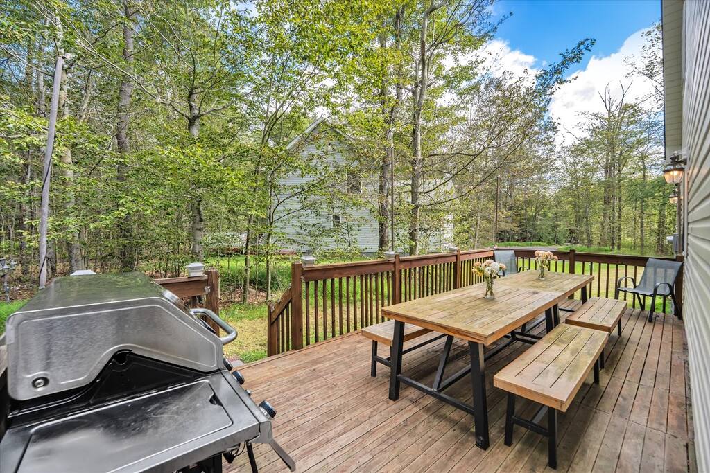 Craving a luxurious Poconos getaway with easy access to outdoor adventure? Welcome to your modern mountain escape, White Goose Hollow — perfect for families, friends, and large groups! This stunning home effortlessly blends modern style with fun, themed design and endless amenities, creating the perfect getaway for families and groups. With five uniquely themed bedrooms, a lively game room, and a spacious outdoor area, this retreat offers both adventure and relaxation in equal measure! KEY FEATURES: - 5 themed bedrooms, comfortably sleeping 14 guests; 3 King, 2 Queen, and 2 Bunk Beds ( twin-over-twin) - 7-person hot tub - Game room with pool table, foosball, & Pacman - Outdoor fire pit with polywood Adirondack chairs - Large deck w/ hot tub, grill & outdoor dining - High-speed WiFi & smartTVs with cable and streaming apps - Access to premier Poconos Farms Country Club Community Association amenities; including 18-hold golf course, beach, lake, pool, fitness center, sport courts, kayak rentals & clubhouse ↟ BEDROOMS ↟ You’ll love how many bedrooms this home offers! The beautiful modern home comfortably accommodates 14 guests in 5 different themed bedrooms. On the first floor, you’ll find a spacious bedroom with two queen beds, providing convenient access to the main living and dining area. Head upstairs to discover the master bedroom, featuring a king-sized bed and a private en suite bathroom. Two additional bedrooms nearby also have king-sized beds, providing ideal sleeping arrangements for large groups. Finally, a kid-friendly bedroom with two twin-over-twin bunk beds makes it easy to keep the little ones close and entertained! ↟ BATHROOMS ↟ Each floor of the home features its own full-sized bathroom, thoughtfully equipped with a vanity, sink, and mirror - giving everyone plenty of space to freshen up and unwind. The private ensuite is a standout, offering a soothing jacuzzi tub, walk-in shower, two vanities, and a walk-in closet. On both the upper and main levels, you'll find additional full bathrooms with convenient shower/tub combos, making it easy for guests to relax and get ready with ease or bathe the little ones. All bathrooms are fully stocked with complimentary hand towels, wash cloths, makeup towels, hair dryers, and premium bath-time essentials. ↟ KITCHEN AND DINING AREA ↟ Enjoy cooking in a kitchen that offers all the quality stainless steel appliances, utensils and cookware needed to feel right at home. Think all the pots & pans, serving trays, and bakeware you need to whip up a meal to remember. The bright and welcoming dining area features a large table surrounded by eight colorful chairs and an adjacent kitchen counter that seats three. Expansive windows flood the space with natural light and frame beautiful views of the surrounding trees. Lastly, don’t forget to kickstart your mornings in the mountains with a thoughtfully designed caffeine station -- drip coffee and Keurig options, as well as a huge selection of Stash teas! ↟ LIVING ROOMS ↟. Get cozy in a living room designed for comfort at any time of day. Vaulted ceilings create an airy, open feel, while the fireplace and plush leather seating invite you to sink in and unwind. Whether you're streaming your favorite shows on the 65" SmartTV with Netflix or taking in the peaceful backyard views, this space effortlessly blends relaxation and style. ↟ RECREATION ROOM ↟ Challenge your crew to a round of pool, foosball, or go retro with the classic Pac-Man arcade. Prefer something more low-key? Grab a seat at the picnic-style table for board games, snacks, or a laid-back card night. And yes—there’s even an indoor swing for a playful twist. ↟ OUTDOOR SPACE ↟ Step out onto the back deck and enjoy everything this inviting space has to offer. Fire up the gas grill and gather around the outdoor dining table for a laid-back meal in the fresh air. Just off the deck, you’ll find a fire pit surrounded by eight brand new polywood Adirondack chairs and a cozy hammock tucked under the trees. And when it’s time to truly relax, slip into the private hot tub just beside the fire pit for a relaxing soak under the stars. ↟ POCONO FARMS AMENITIES ↟ You and your loved ones will never be bored with all the amenities that this private community has to offer. Enjoy access to the lake and beach (seasonal), outdoor heated Olympic size pool (seasonal), boating, basketball court, bocce/shuffleboard court, tennis and pickleball courts, fitness center and clubhouse grill. Kayaks & paddle boards are available at no additional cost on Wednesday through Sunday from 11:00am to 6:00pm during the summer. Your stay includes 6 guests badges for access to the pool, lake, fitness center, and courts. Additional guests passes are available for purchase from the community directly for $8/day per person. Fitness Center access requires an additional fee for all guests.