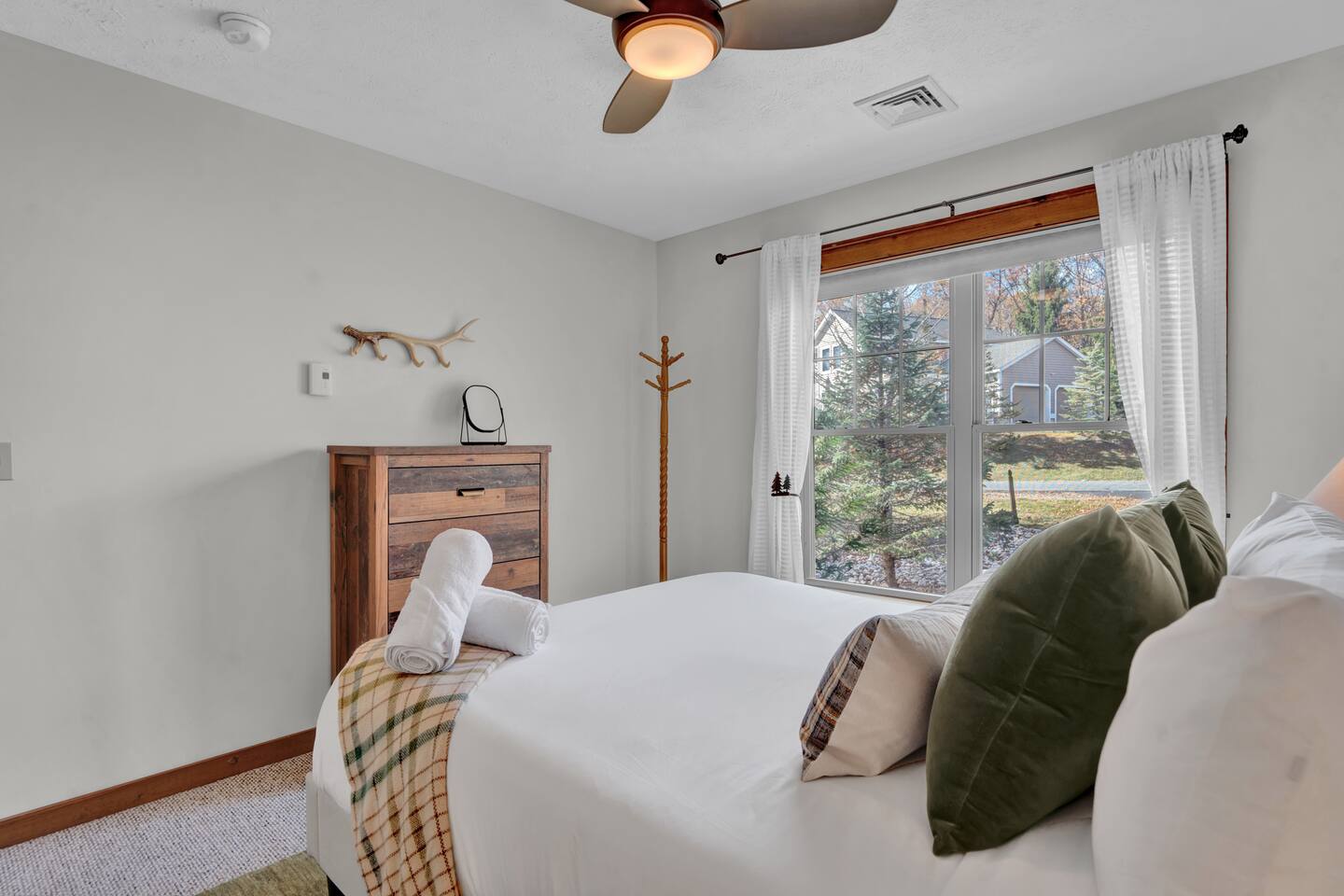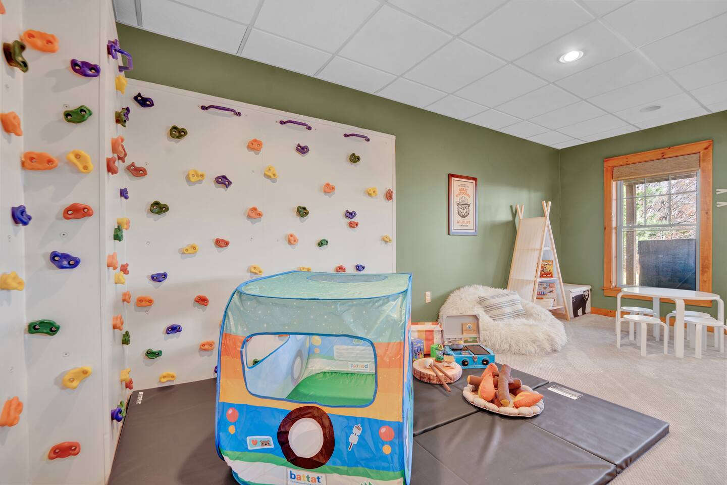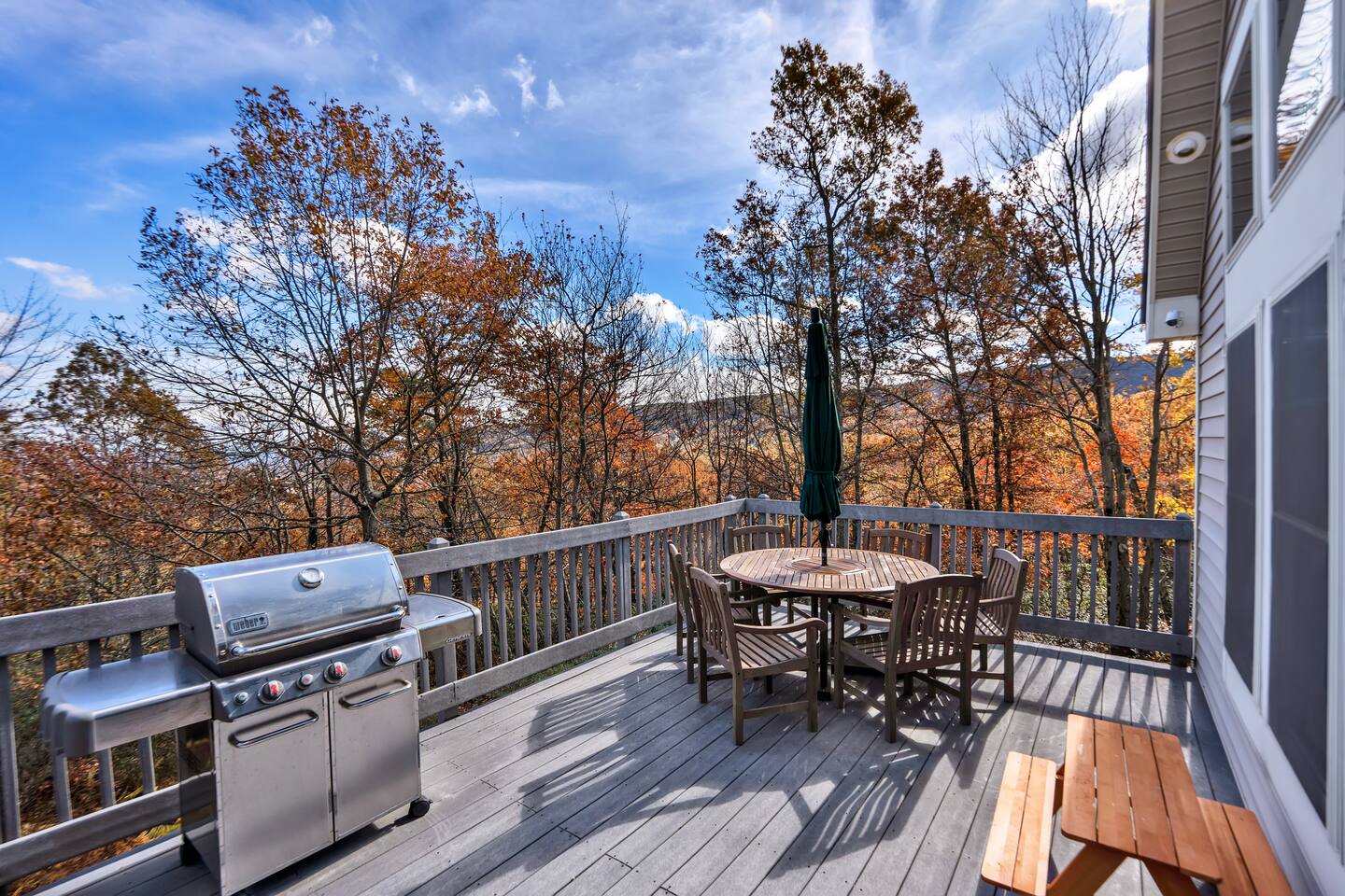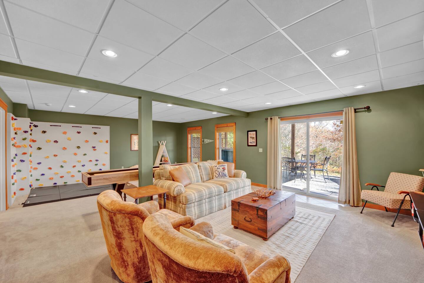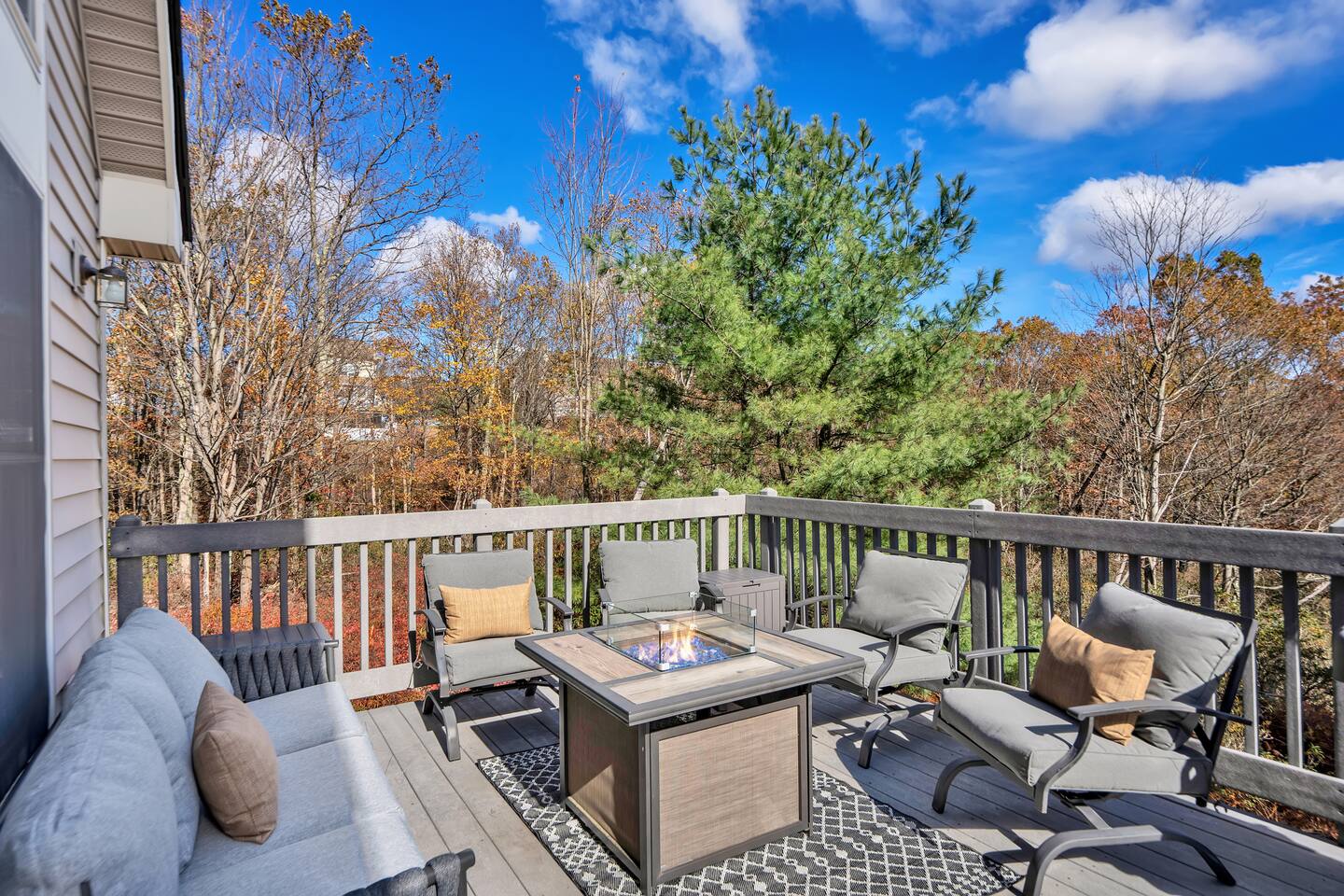 Welcome to Sunrise Chalet, a stylish and warm mountain-retreat basecamp for your Poconos adventure! Just minutes from Camelback’s slopes and trails, this inviting mountain home offers the perfect mix of comfort and excitement — unwind in the hot tub and take in the mountain views, let the kids explore and play on the custom-built climbing wall, or gather round the dining table late into the night. ✨ KEY FEATURES ✨ - 2,300+ sq. ft. | 3 bedrooms | 3 baths | Sleeps 8 - 6-person hot tub w. seasonal mtn views - Rec room with shuffleboard table, 80” smartTV, custom climbing wall & kids corner - Kid-friendly w/ high-chair, stroller, baby gate, bedrails, floorseat, bottle warmer & pack n’ play provided - Community outdoor pool, splash zone, playground & tennis courts - Large deck with outdoor dining, couch & rocking chairs, propane fire pit & Weber gas grill - Central AC throughout - Natural stone wood burning fireplace - Modern, well-equipped kitchen with quality cookware, appliances, and air-fryer 🛏️ BEDROOMS ↟ The home's 3 bedrooms offer comfort & privacy for your whole group – adults & children alike! On the main floor, you’ll find two comfortable queen bedrooms conveniently located next to a full bathroom with a tub. Each room is thoughtfully decorated and furnished with a dresser and closet. Upstairs, the master bedroom is a secluded en-suite, offering a king-sized bed, walk-in closet, dresser, dedicated workspace, and attached full bathroom. 🛁 BATHROOMS ↟ Enjoy a retreat-within-your-retreat in our three full-sized bathrooms. The main floor bathroom has a convenient shower/tub combo and a vanity sink, perfect for everyday use and bathing the kiddos after a long day of adventure. Upstairs, the master bathroom offers a spacious shower, tub, and a double-sink vanity with a large mirror - great for couples or families. The downstairs bathroom includes a large walk-in shower and sink, ideal for guests or quick refreshes. All bathrooms are fully stocked with complimentary hand towels, wash cloths, makeup towels, hair dryers, and premium bath-time essentials 🍳 KITCHEN & DINING AREA ↟ This bright, open kitchen makes meal time a breeze, with easy access to the 8-seat dining table and serene views of the surrounding woods. It’s fully stocked with stainless steel appliances—including a fridge with water dispenser, wine fridge, oven, stove, microwave, dishwasher, air fryer, crockpot and waffle maker - plus all the cookware, utensils, and serving pieces you need to create memorable meals with ease. Can’t forget the coffee (and tea, for all our tea people)! Kickstart your morning in the mountains with a Keurig dual drip & k-cup coffee machine. Or, choose from our extensive selection of Stash teas for a delightful variety to suit your taste buds. 🛋️ LIVING AREAS ↟ This living room is made for relaxing! Sink into the large L-shaped sectional or the stylish accent chair, both facing a cozy stone fireplace. Enjoy your favorite shows on the wall-mounted smartTV with all of your favorite streaming apps, play games with loved ones, or simply unwind after a day outdoors. Downstairs, the recreation room offers endless fun for everyone. Challenge each other on the shuffleboard table, let the kids explore the dedicated play corner with toys, books, and a custom-built, padded rock climbing wall, or sink into the couch while enjoying your favorite show on the 80” mounted smart TV. 🌅 OUTDOOR SPACE ↟ Enjoy direct views of Camelback mountain and the serenity of nature on our two-story deck! The upper deck features a propane fire pit table surrounded by a comfy outdoor sectional and chairs - perfect for cozy evenings under the stars. There’s also a 6-person dining table with an umbrella and Weber gas grill for al fresco meals with family or friends. The lower deck is your private relaxation spot, complete with a state-of-the-art hot tub, hammock, and 4-person outdoor dining table. Both levels offer stunning seasonal views of the ski slopes, making this the perfect setting for morning coffee, sunset cocktails, or simply unwinding after a day of adventure. Lastly, enjoy access (separate fee required)to the community's amazing amenities, including a brand new outdoor pool, splash zone, kid's playground and tennis courts.