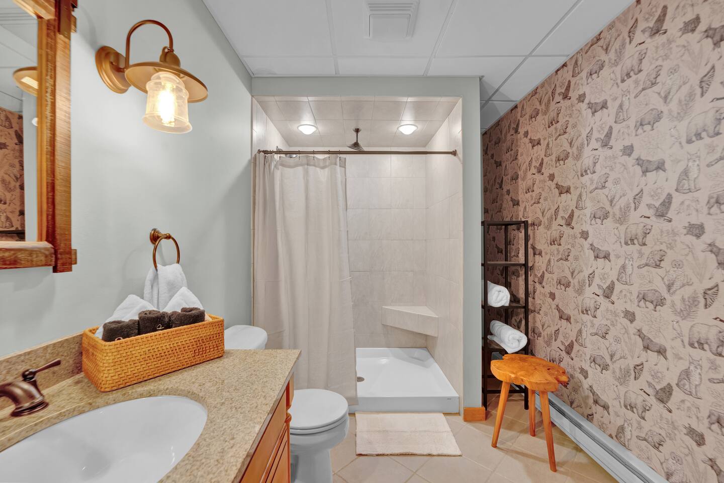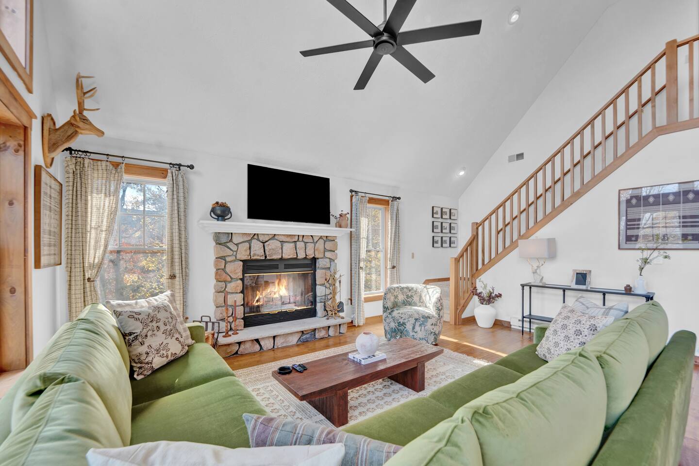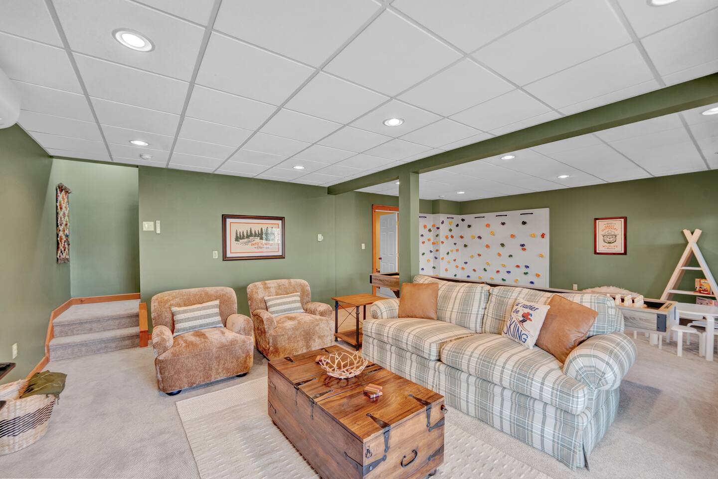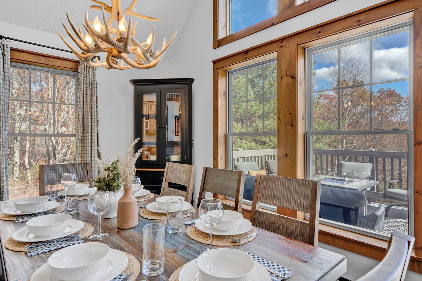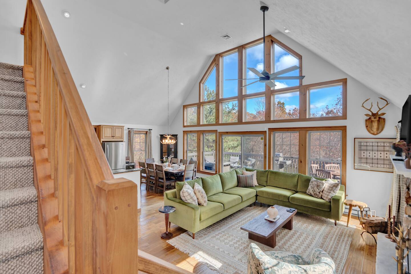 Welcome to Sunrise Chalet, a stylish and warm mountain-retreat basecamp for your Poconos adventure! Just minutes from Camelback’s slopes and trails, this inviting mountain home offers the perfect mix of comfort and excitement — unwind in the hot tub and take in the mountain views, let the kids explore and play on the custom-built climbing wall, or gather round the dining table late into the night. ✨ KEY FEATURES ✨ - 2,300+ sq. ft. | 3 bedrooms | 3 baths | Sleeps 8 - 6-person hot tub w. seasonal mtn views - Rec room with shuffleboard table, 80” smartTV, custom climbing wall & kids corner - Kid-friendly w/ high-chair, stroller, baby gate, bedrails, floorseat, bottle warmer & pack n’ play provided - Community outdoor pool, splash zone, playground & tennis courts - Large deck with outdoor dining, couch & rocking chairs, propane fire pit & Weber gas grill - Central AC throughout - Natural stone wood burning fireplace - Modern, well-equipped kitchen with quality cookware, appliances, and air-fryer 🛏️ BEDROOMS ↟ The home's 3 bedrooms offer comfort & privacy for your whole group – adults & children alike! On the main floor, you’ll find two comfortable queen bedrooms conveniently located next to a full bathroom with a tub. Each room is thoughtfully decorated and furnished with a dresser and closet. Upstairs, the master bedroom is a secluded en-suite, offering a king-sized bed, walk-in closet, dresser, dedicated workspace, and attached full bathroom. 🛁 BATHROOMS ↟ Enjoy a retreat-within-your-retreat in our three full-sized bathrooms. The main floor bathroom has a convenient shower/tub combo and a vanity sink, perfect for everyday use and bathing the kiddos after a long day of adventure. Upstairs, the master bathroom offers a spacious shower, tub, and a double-sink vanity with a large mirror - great for couples or families. The downstairs bathroom includes a large walk-in shower and sink, ideal for guests or quick refreshes. All bathrooms are fully stocked with complimentary hand towels, wash cloths, makeup towels, hair dryers, and premium bath-time essentials 🍳 KITCHEN & DINING AREA ↟ This bright, open kitchen makes meal time a breeze, with easy access to the 8-seat dining table and serene views of the surrounding woods. It’s fully stocked with stainless steel appliances—including a fridge with water dispenser, wine fridge, oven, stove, microwave, dishwasher, air fryer, crockpot and waffle maker - plus all the cookware, utensils, and serving pieces you need to create memorable meals with ease. Can’t forget the coffee (and tea, for all our tea people)! Kickstart your morning in the mountains with a Keurig dual drip & k-cup coffee machine. Or, choose from our extensive selection of Stash teas for a delightful variety to suit your taste buds. 🛋️ LIVING AREAS ↟ This living room is made for relaxing! Sink into the large L-shaped sectional or the stylish accent chair, both facing a cozy stone fireplace. Enjoy your favorite shows on the wall-mounted smartTV with all of your favorite streaming apps, play games with loved ones, or simply unwind after a day outdoors. Downstairs, the recreation room offers endless fun for everyone. Challenge each other on the shuffleboard table, let the kids explore the dedicated play corner with toys, books, and a custom-built, padded rock climbing wall, or sink into the couch while enjoying your favorite show on the 80” mounted smart TV. 🌅 OUTDOOR SPACE ↟ Enjoy direct views of Camelback mountain and the serenity of nature on our two-story deck! The upper deck features a propane fire pit table surrounded by a comfy outdoor sectional and chairs - perfect for cozy evenings under the stars. There’s also a 6-person dining table with an umbrella and Weber gas grill for al fresco meals with family or friends. The lower deck is your private relaxation spot, complete with a state-of-the-art hot tub, hammock, and 4-person outdoor dining table. Both levels offer stunning seasonal views of the ski slopes, making this the perfect setting for morning coffee, sunset cocktails, or simply unwinding after a day of adventure. Lastly, enjoy access (separate fee required)to the community's amazing amenities, including a brand new outdoor pool, splash zone, kid's playground and tennis courts.