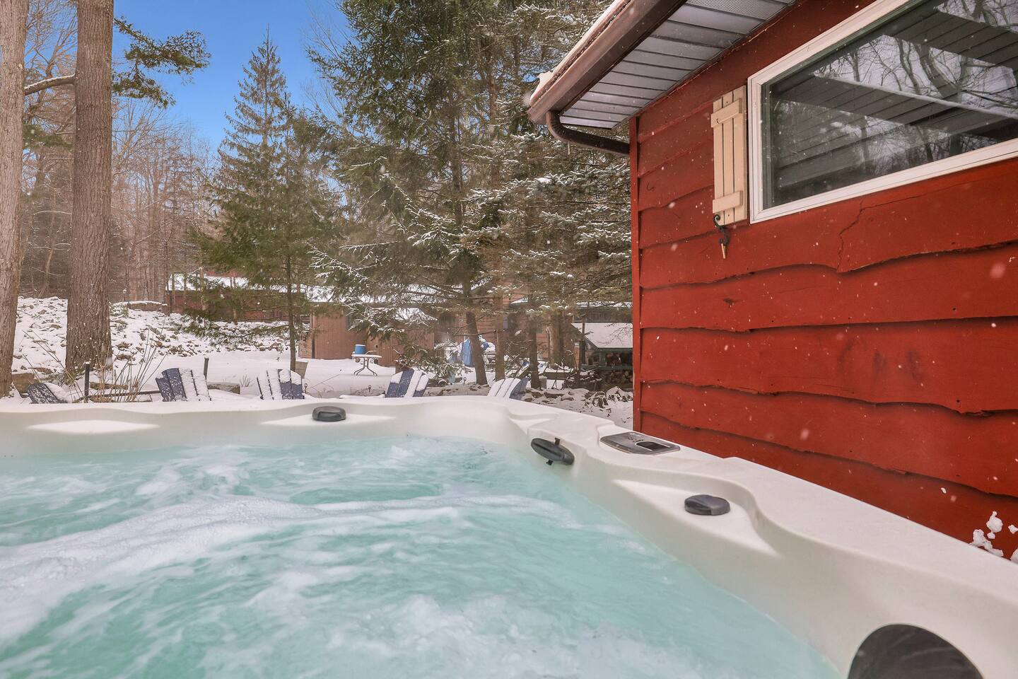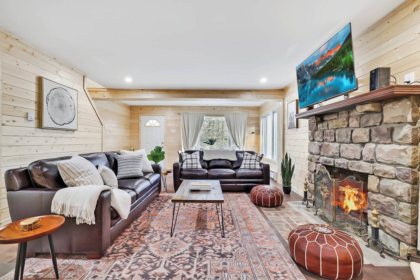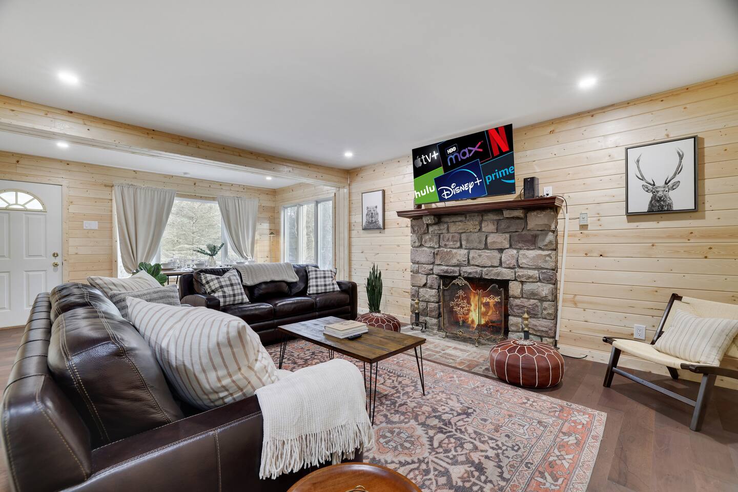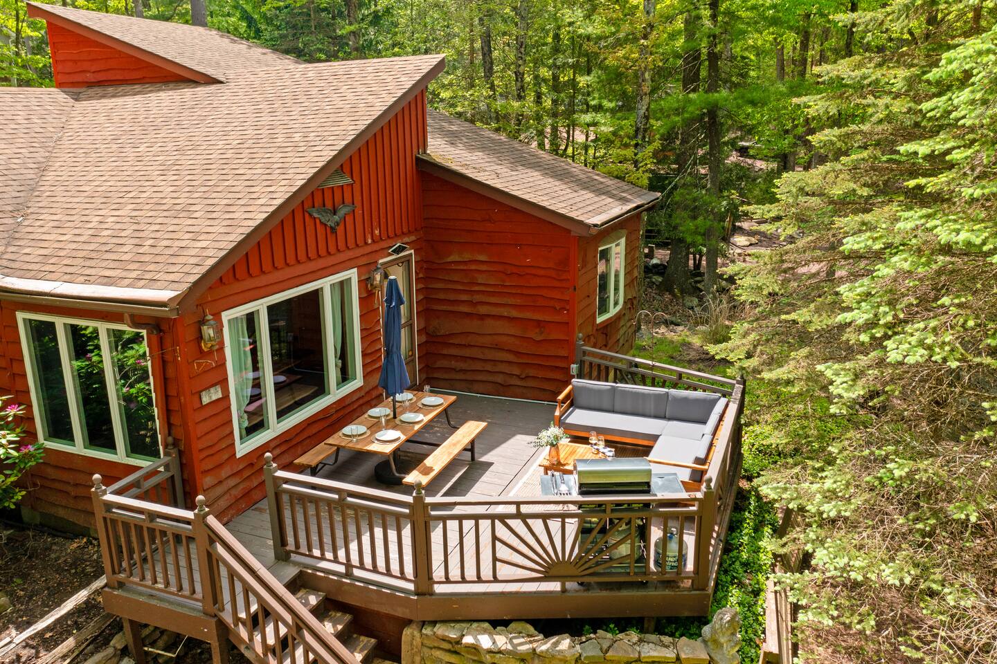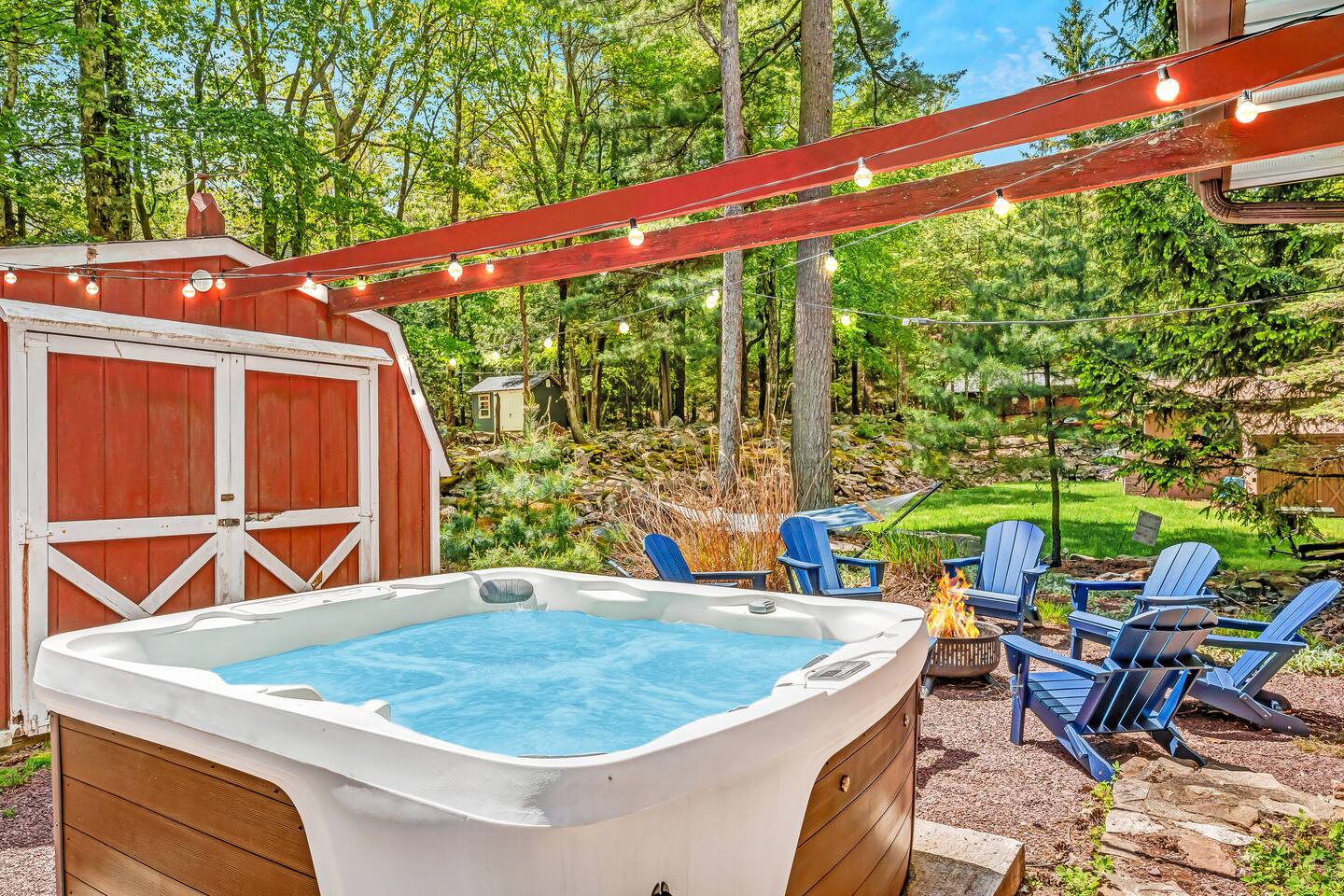 Welcome to Red Oak Retreat, nestled in the heart of the Poconosβ popular Lake Harmony area. This beautiful cabin seamlessly blends cozy, rustic charm with a touch of modern, creating a welcoming retreat that exudes both warmth and contemporary style. β β β β β Past guests have said: βPerfect location for a family getaway! Very close to Jack Frost and Big Boulder. The house was comfortable, cozy, and very clean.β β Claire Β· Stayed with kids βThis house is nothing short of beautiful! Staying on Lake Harmony is a MUST, there are restaurants and activities to do very close to the house. The house was extremely clean and still cozy! The host was able to respond very quick- even though we had no issues at all!" β Madison Β· Stayed with friends β β β β β KEY FEATURES: β’ 3 bedrooms + loft room; comfortably sleeping 11 (1 King, 1 Queen, 1 Double, and Bunk Room w/ 2 Doubles + 1 Twin) β’ 2 full bathrooms ft. 2 luxury walk-in showers β’ 8-person hot tub β’ Large living room with 55β smart TV with streaming app & indoor gas fireplace β’ Outdoor fire pit with Polywood Adirondack chairs β’ Modern, well-equipped kitchen with stainless steel cookware & two dining tables β’ Spacious master bedroom with a king-sized bed, smart TV and en-suite bath β’ High-speed WiFi β’ Kid-friendly w/ gate, high chair, and pack & play provided β’ Board games β β β β β β BEDROOMS β The homeβs 4 bedrooms offer privacy for your whole group β adults & children alike! The spacious master bedroom boasts a king-sized bed and a 44β smart TV, as well as a private, en-suite bathroom. There are two other bedrooms on the first floor: one featuring a queen-sized bed, and one with a double bed. Both evoke the rustic-yet-modern vibe that makes this home so welcoming and cozy. Finally, the fourth loft-style bedroom upstairs features a bunk bed (two double mattresses) and a separate twin-sized bed. This little hideaway is a favorite for kids! Note that the stairs leading up to the loft are narrow, but not an issue for most. β BATHROOMS β Enjoy a retreat-within-your-retreat in our TWO full-sized, recently renovated bathrooms. The master en-suite bathroom features a large shower with river-rock tiling to keep you enveloped in nature. The hall bathroom also features a large standing shower adorned with modern subway tiles, and is easily accessible for the rest of your group. All bathrooms are fully stocked with complimentary hand towels, wash cloths, makeup towels, hair dryers, and premium bath-time essentials. β KITCHEN β The chef in your group will love how spacious and open this kitchen is. So. Much. Counter Space! This kitchen offers all the quality stainless steel appliances, utensils and cookware needed to feel right at home. Think: all the stainless steel pots & pans, serving trays, and dishes you need to whip up a meal to remember. Canβt forget the coffee (and tea, for all our tea people). Kickstart your morning routine in the mountains with our brand new two-in-one drip coffee/Keurig machine. Or, choose from our extensive selection of Stash teas for a delightful variety to suit your taste buds. Whether you're a coffee connoisseur or a tea enthusiast, our thoughtfully curated caffeine station promises to wake you up. The kitchen also features a 4-person dining table (in addition to the 7-person dining table in the main living area) β perfect for a quick cup of coffee or bite to eat before hitting the slopes. β LIVING ROOM β This is a living room made for lounging! Two large, brand new leather couches face a cozy stone, gas-powered fireplace, as well as a 55β smart TV with all the streaming apps youβve come to love. The perfect place for kicking your feet up after a day spent outdoors. A quaint reading nook also offers extra seating, if youβd rather be snuggled up with a book. β DINING AREA β Adjacent to the living room is a 7-person dining table β perfect for those memorable dinners-that-blend-into-nighttime, and maybe even some friendly competition at family game night. From the top-line Crate & Barrel dinnerware, to the well appointed table decor, this space is designed to be the backdrop of your evenings. β OUTDOOR SPACE β The outdoor space is rich with amenities and activities, boasting an 8-person hot tub, a fire pit surrounded by 8 brand new polywood Adirondack chairs, a relaxing garden hammock and a corn-hole set. There is also a large deck off the back of the house featuring a six-person outdoor teakwood sectional, a modern wooden picnic table, and a brand new stainless steel gas BBQ grill. Whether looking to escape for solo relaxation or actively enjoy the beautiful Lake Harmony scenery, there is no shortage of outdoor amenities! The home is on a wooded corner lot, and offers a U-shaped driveway with parking for 6 vehicles.