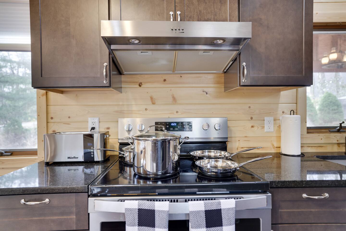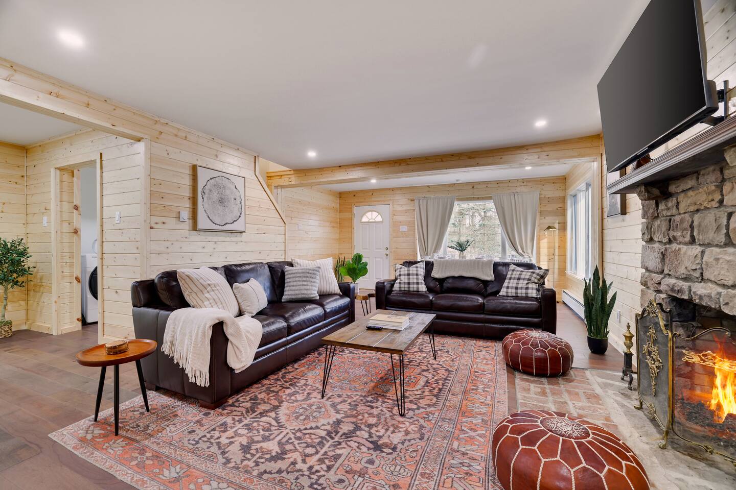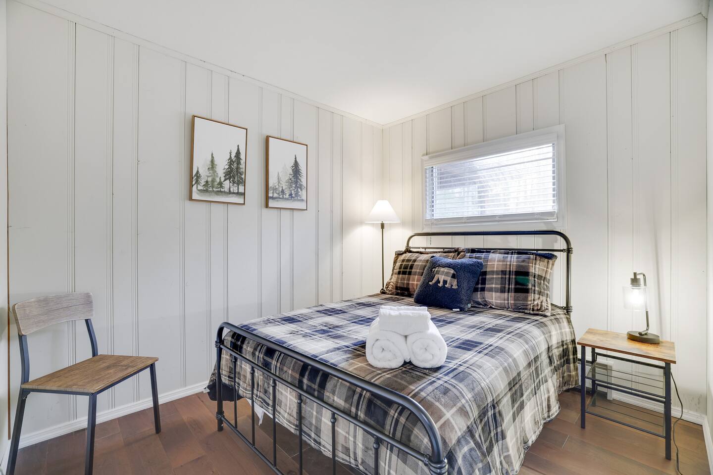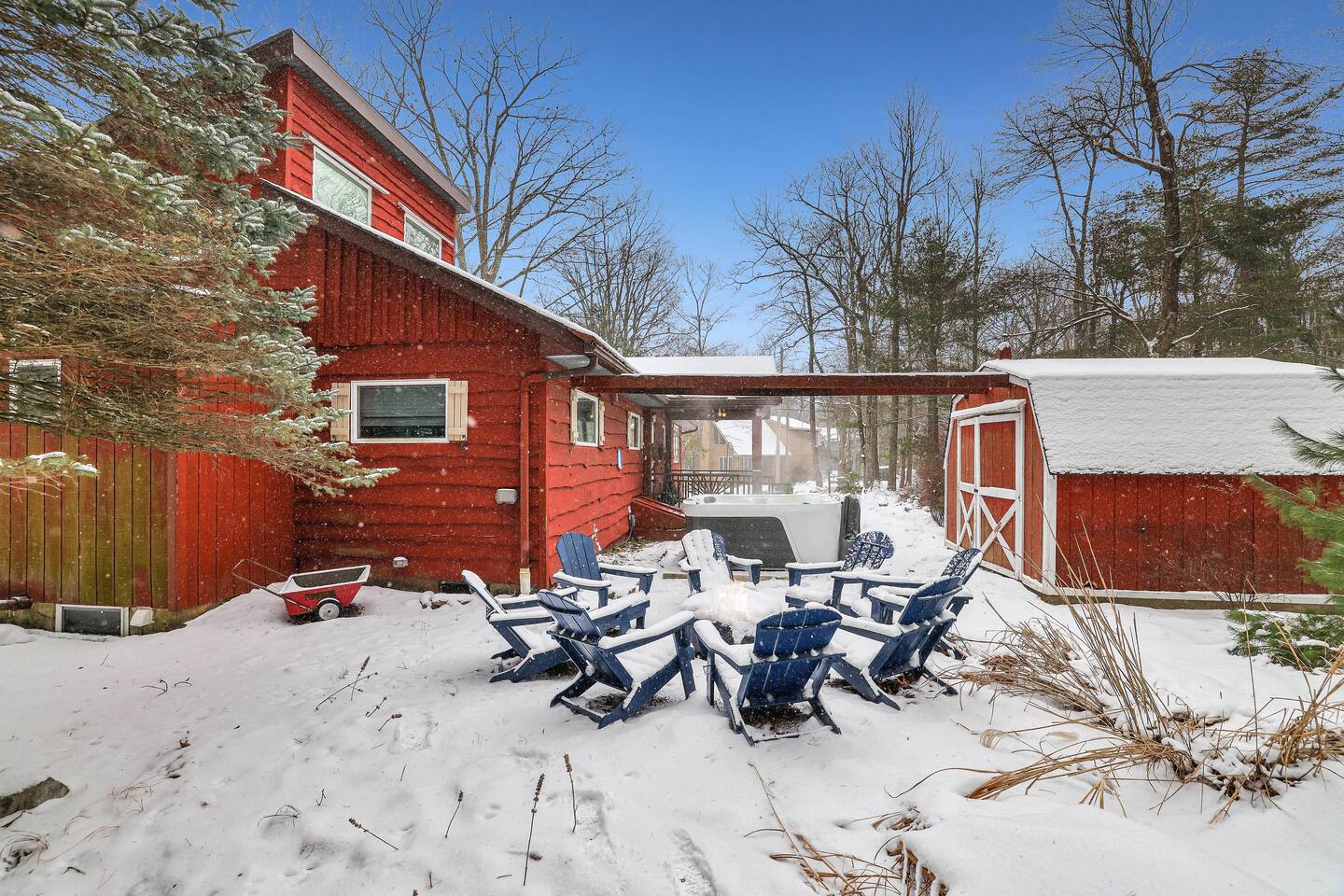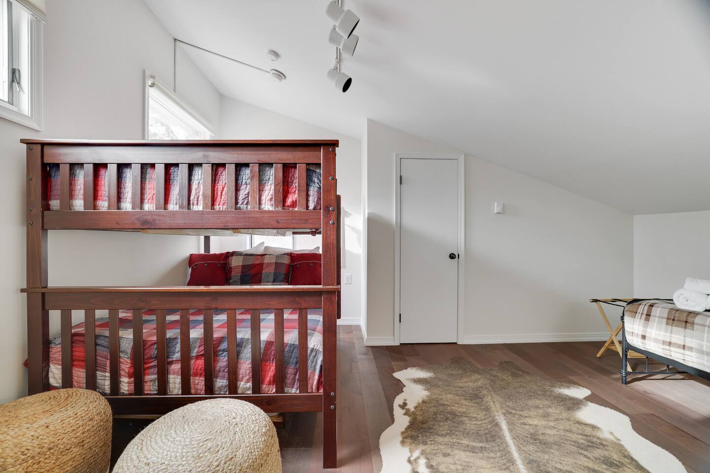 Welcome to Red Oak Retreat, nestled in the heart of the Poconosβ popular Lake Harmony area. This beautiful cabin seamlessly blends cozy, rustic charm with a touch of modern, creating a welcoming retreat that exudes both warmth and contemporary style. β β β β β Past guests have said: βPerfect location for a family getaway! Very close to Jack Frost and Big Boulder. The house was comfortable, cozy, and very clean.β β Claire Β· Stayed with kids βThis house is nothing short of beautiful! Staying on Lake Harmony is a MUST, there are restaurants and activities to do very close to the house. The house was extremely clean and still cozy! The host was able to respond very quick- even though we had no issues at all!" β Madison Β· Stayed with friends β β β β β KEY FEATURES: β’ 3 bedrooms + loft room; comfortably sleeping 11 (1 King, 1 Queen, 1 Double, and Bunk Room w/ 2 Doubles + 1 Twin) β’ 2 full bathrooms ft. 2 luxury walk-in showers β’ 8-person hot tub β’ Large living room with 55β smart TV with streaming app & indoor gas fireplace β’ Outdoor fire pit with Polywood Adirondack chairs β’ Modern, well-equipped kitchen with stainless steel cookware & two dining tables β’ Spacious master bedroom with a king-sized bed, smart TV and en-suite bath β’ High-speed WiFi β’ Kid-friendly w/ gate, high chair, and pack & play provided β’ Board games β β β β β β BEDROOMS β The homeβs 4 bedrooms offer privacy for your whole group β adults & children alike! The spacious master bedroom boasts a king-sized bed and a 44β smart TV, as well as a private, en-suite bathroom. There are two other bedrooms on the first floor: one featuring a queen-sized bed, and one with a double bed. Both evoke the rustic-yet-modern vibe that makes this home so welcoming and cozy. Finally, the fourth loft-style bedroom upstairs features a bunk bed (two double mattresses) and a separate twin-sized bed. This little hideaway is a favorite for kids! Note that the stairs leading up to the loft are narrow, but not an issue for most. β BATHROOMS β Enjoy a retreat-within-your-retreat in our TWO full-sized, recently renovated bathrooms. The master en-suite bathroom features a large shower with river-rock tiling to keep you enveloped in nature. The hall bathroom also features a large standing shower adorned with modern subway tiles, and is easily accessible for the rest of your group. All bathrooms are fully stocked with complimentary hand towels, wash cloths, makeup towels, hair dryers, and premium bath-time essentials. β KITCHEN β The chef in your group will love how spacious and open this kitchen is. So. Much. Counter Space! This kitchen offers all the quality stainless steel appliances, utensils and cookware needed to feel right at home. Think: all the stainless steel pots & pans, serving trays, and dishes you need to whip up a meal to remember. Canβt forget the coffee (and tea, for all our tea people). Kickstart your morning routine in the mountains with our brand new two-in-one drip coffee/Keurig machine. Or, choose from our extensive selection of Stash teas for a delightful variety to suit your taste buds. Whether you're a coffee connoisseur or a tea enthusiast, our thoughtfully curated caffeine station promises to wake you up. The kitchen also features a 4-person dining table (in addition to the 7-person dining table in the main living area) β perfect for a quick cup of coffee or bite to eat before hitting the slopes. β LIVING ROOM β This is a living room made for lounging! Two large, brand new leather couches face a cozy stone, gas-powered fireplace, as well as a 55β smart TV with all the streaming apps youβve come to love. The perfect place for kicking your feet up after a day spent outdoors. A quaint reading nook also offers extra seating, if youβd rather be snuggled up with a book. β DINING AREA β Adjacent to the living room is a 7-person dining table β perfect for those memorable dinners-that-blend-into-nighttime, and maybe even some friendly competition at family game night. From the top-line Crate & Barrel dinnerware, to the well appointed table decor, this space is designed to be the backdrop of your evenings. β OUTDOOR SPACE β The outdoor space is rich with amenities and activities, boasting an 8-person hot tub, a fire pit surrounded by 8 brand new polywood Adirondack chairs, a relaxing garden hammock and a corn-hole set. There is also a large deck off the back of the house featuring a six-person outdoor teakwood sectional, a modern wooden picnic table, and a brand new stainless steel gas BBQ grill. Whether looking to escape for solo relaxation or actively enjoy the beautiful Lake Harmony scenery, there is no shortage of outdoor amenities! The home is on a wooded corner lot, and offers a U-shaped driveway with parking for 6 vehicles.