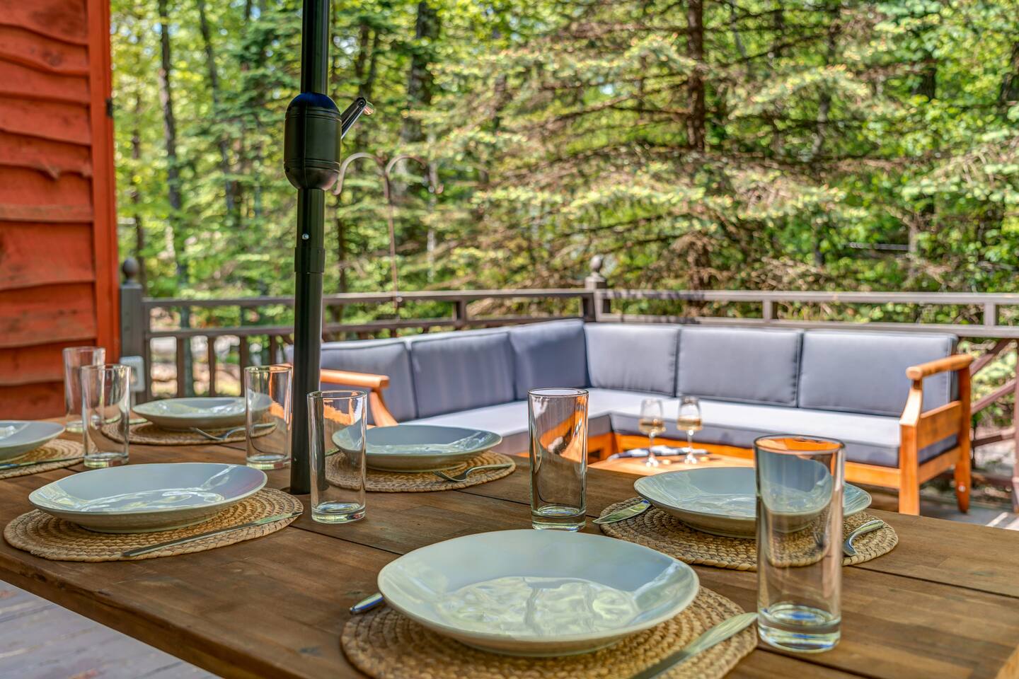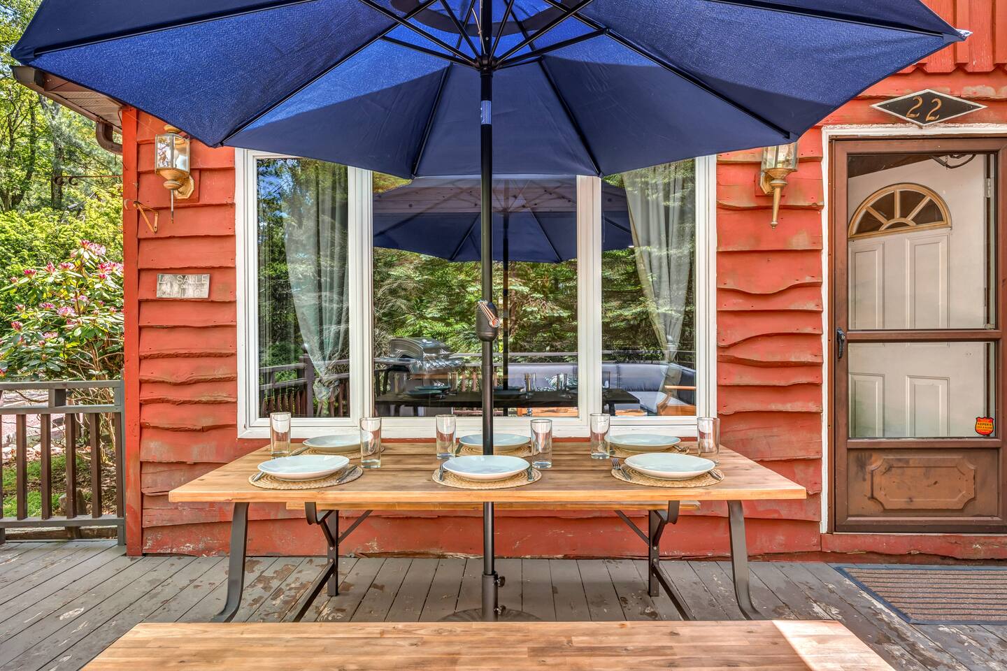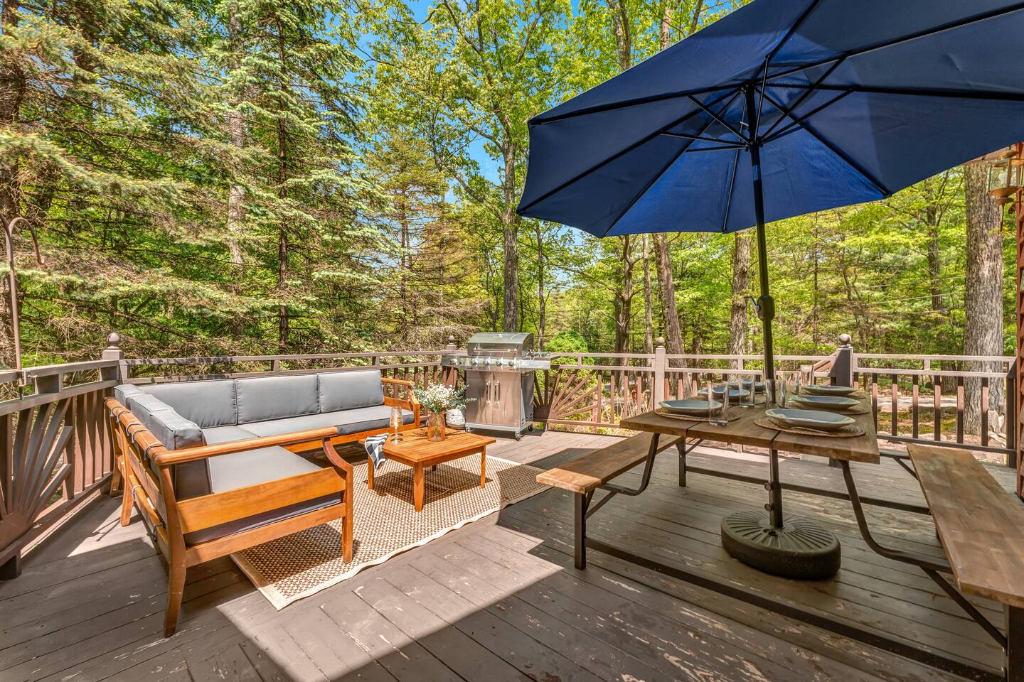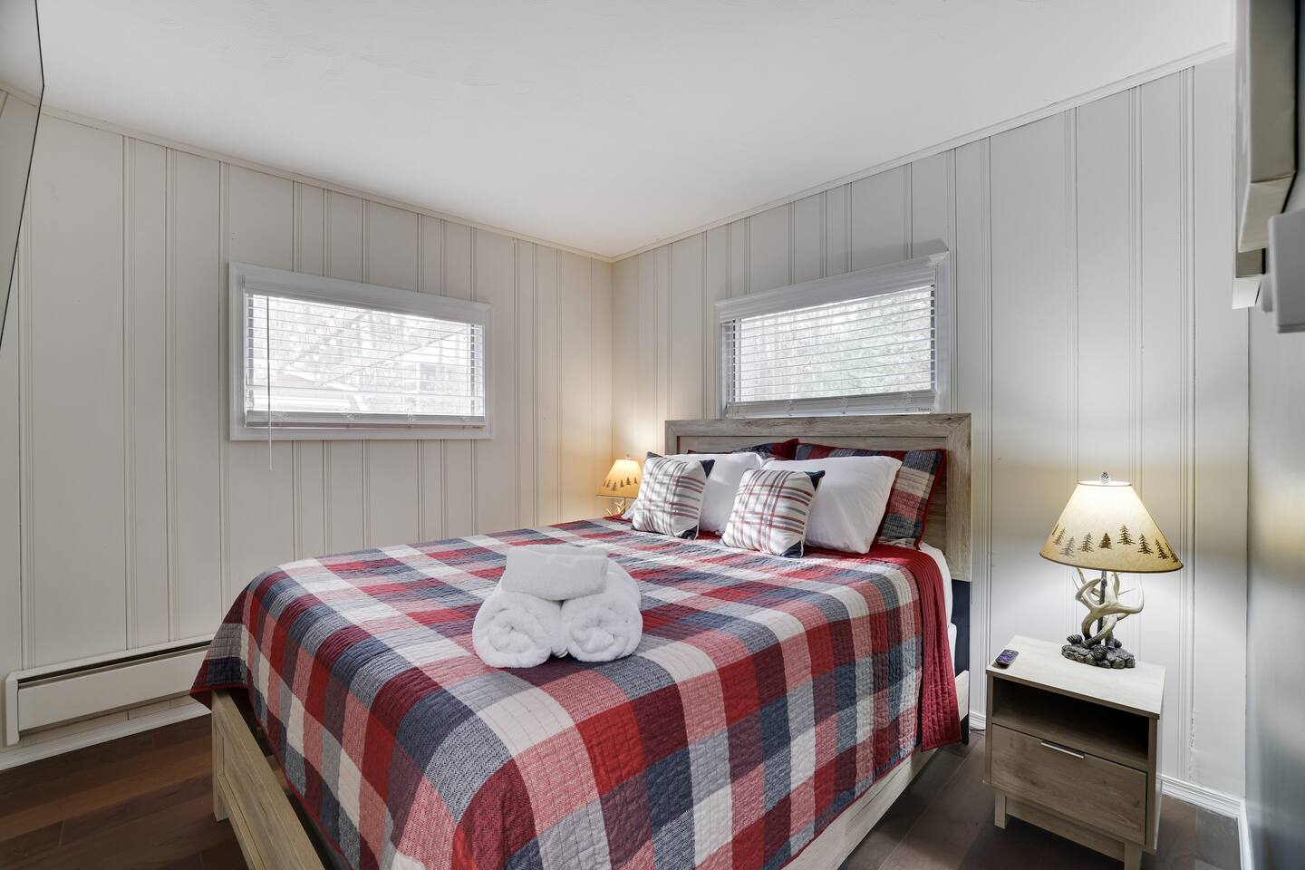 Welcome to Red Oak Retreat, nestled in the heart of the Poconosβ popular Lake Harmony area. This beautiful cabin seamlessly blends cozy, rustic charm with a touch of modern, creating a welcoming retreat that exudes both warmth and contemporary style. β β β β β Past guests have said: βPerfect location for a family getaway! Very close to Jack Frost and Big Boulder. The house was comfortable, cozy, and very clean.β β Claire Β· Stayed with kids βThis house is nothing short of beautiful! Staying on Lake Harmony is a MUST, there are restaurants and activities to do very close to the house. The house was extremely clean and still cozy! The host was able to respond very quick- even though we had no issues at all!" β Madison Β· Stayed with friends β β β β β KEY FEATURES: β’ 3 bedrooms + loft room; comfortably sleeping 11 (1 King, 1 Queen, 1 Double, and Bunk Room w/ 2 Doubles + 1 Twin) β’ 2 full bathrooms ft. 2 luxury walk-in showers β’ 8-person hot tub β’ Large living room with 55β smart TV with streaming app & indoor gas fireplace β’ Outdoor fire pit with Polywood Adirondack chairs β’ Modern, well-equipped kitchen with stainless steel cookware & two dining tables β’ Spacious master bedroom with a king-sized bed, smart TV and en-suite bath β’ High-speed WiFi β’ Kid-friendly w/ gate, high chair, and pack & play provided β’ Board games β β β β β β BEDROOMS β The homeβs 4 bedrooms offer privacy for your whole group β adults & children alike! The spacious master bedroom boasts a king-sized bed and a 44β smart TV, as well as a private, en-suite bathroom. There are two other bedrooms on the first floor: one featuring a queen-sized bed, and one with a double bed. Both evoke the rustic-yet-modern vibe that makes this home so welcoming and cozy. Finally, the fourth loft-style bedroom upstairs features a bunk bed (two double mattresses) and a separate twin-sized bed. This little hideaway is a favorite for kids! Note that the stairs leading up to the loft are narrow, but not an issue for most. β BATHROOMS β Enjoy a retreat-within-your-retreat in our TWO full-sized, recently renovated bathrooms. The master en-suite bathroom features a large shower with river-rock tiling to keep you enveloped in nature. The hall bathroom also features a large standing shower adorned with modern subway tiles, and is easily accessible for the rest of your group. All bathrooms are fully stocked with complimentary hand towels, wash cloths, makeup towels, hair dryers, and premium bath-time essentials. β KITCHEN β The chef in your group will love how spacious and open this kitchen is. So. Much. Counter Space! This kitchen offers all the quality stainless steel appliances, utensils and cookware needed to feel right at home. Think: all the stainless steel pots & pans, serving trays, and dishes you need to whip up a meal to remember. Canβt forget the coffee (and tea, for all our tea people). Kickstart your morning routine in the mountains with our brand new two-in-one drip coffee/Keurig machine. Or, choose from our extensive selection of Stash teas for a delightful variety to suit your taste buds. Whether you're a coffee connoisseur or a tea enthusiast, our thoughtfully curated caffeine station promises to wake you up. The kitchen also features a 4-person dining table (in addition to the 7-person dining table in the main living area) β perfect for a quick cup of coffee or bite to eat before hitting the slopes. β LIVING ROOM β This is a living room made for lounging! Two large, brand new leather couches face a cozy stone, gas-powered fireplace, as well as a 55β smart TV with all the streaming apps youβve come to love. The perfect place for kicking your feet up after a day spent outdoors. A quaint reading nook also offers extra seating, if youβd rather be snuggled up with a book. β DINING AREA β Adjacent to the living room is a 7-person dining table β perfect for those memorable dinners-that-blend-into-nighttime, and maybe even some friendly competition at family game night. From the top-line Crate & Barrel dinnerware, to the well appointed table decor, this space is designed to be the backdrop of your evenings. β OUTDOOR SPACE β The outdoor space is rich with amenities and activities, boasting an 8-person hot tub, a fire pit surrounded by 8 brand new polywood Adirondack chairs, a relaxing garden hammock and a corn-hole set. There is also a large deck off the back of the house featuring a six-person outdoor teakwood sectional, a modern wooden picnic table, and a brand new stainless steel gas BBQ grill. Whether looking to escape for solo relaxation or actively enjoy the beautiful Lake Harmony scenery, there is no shortage of outdoor amenities! The home is on a wooded corner lot, and offers a U-shaped driveway with parking for 6 vehicles.