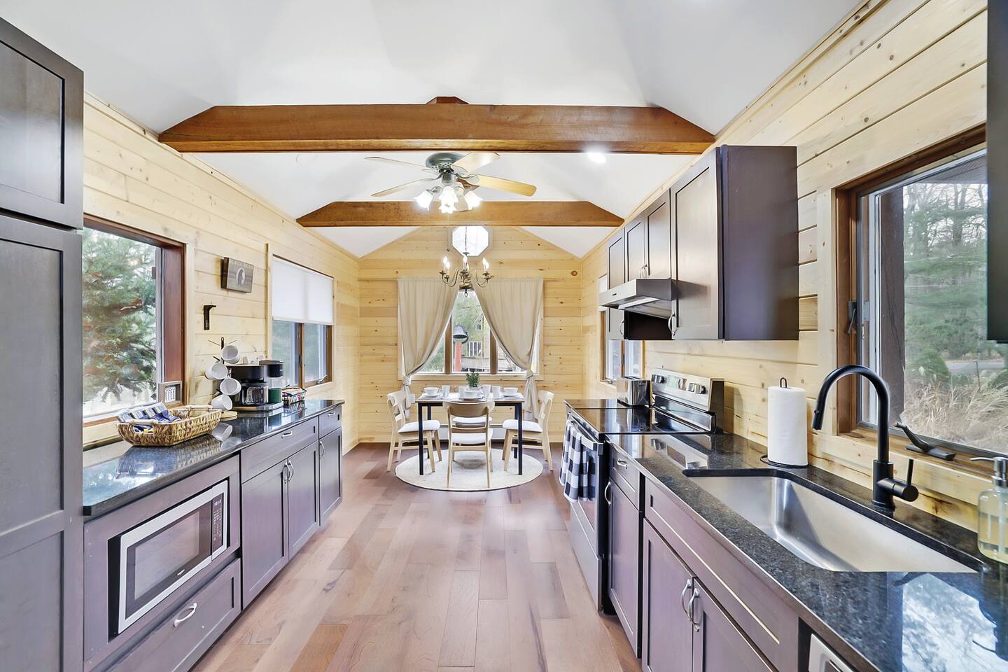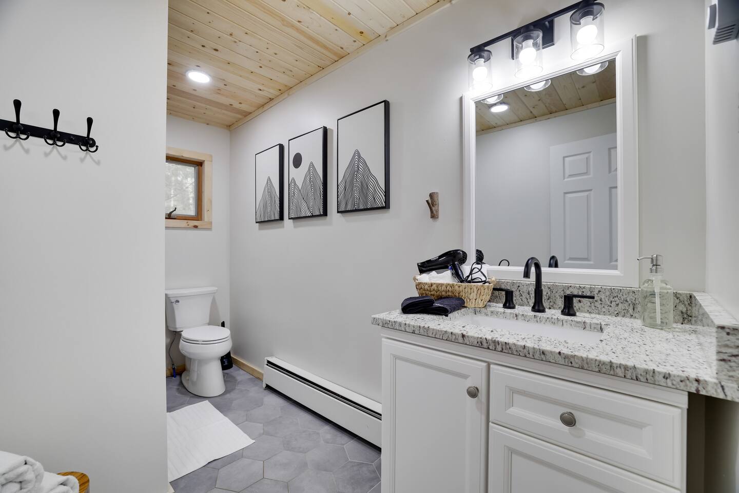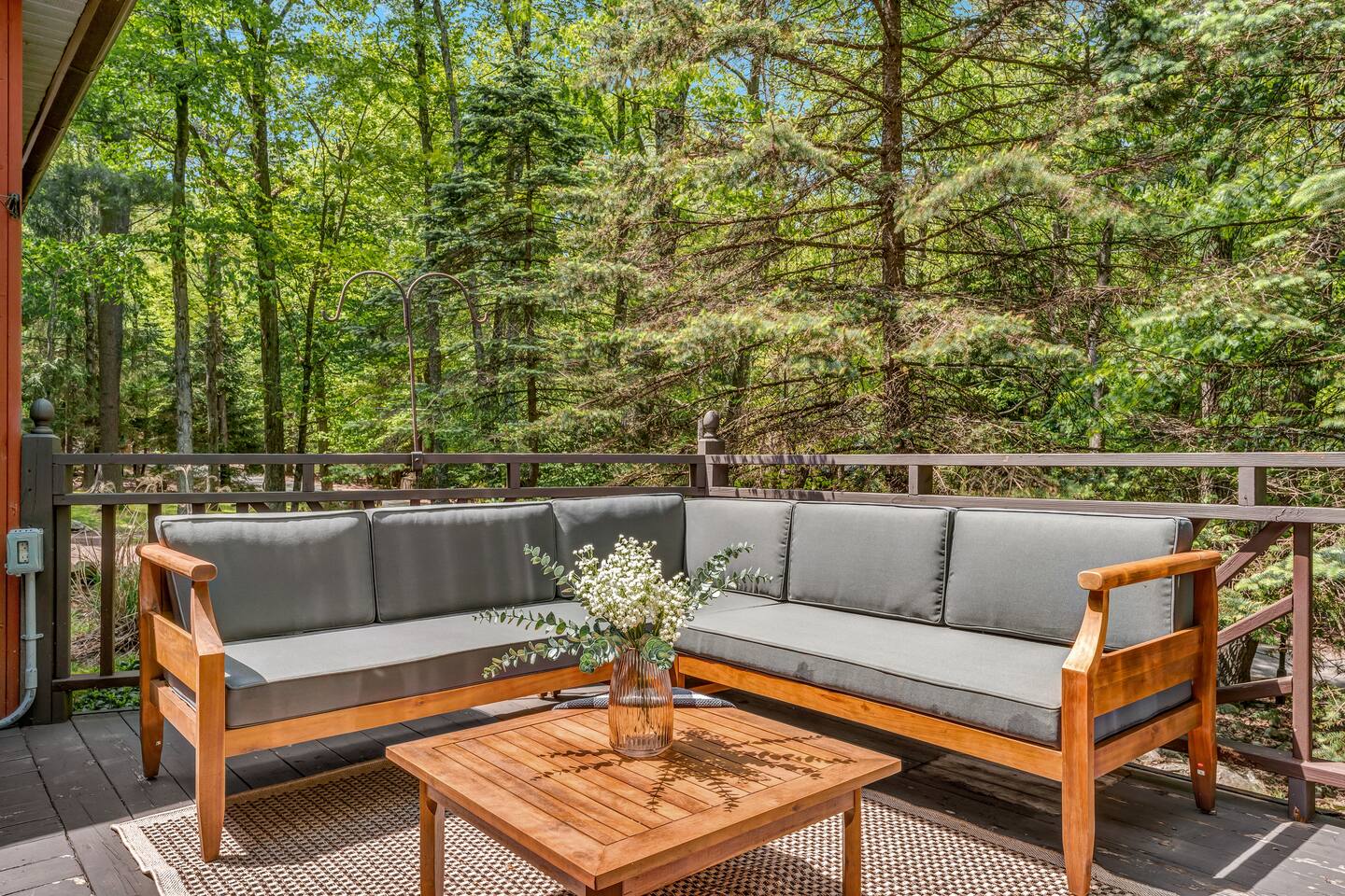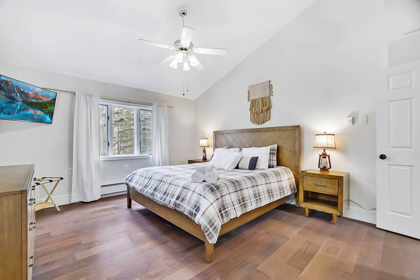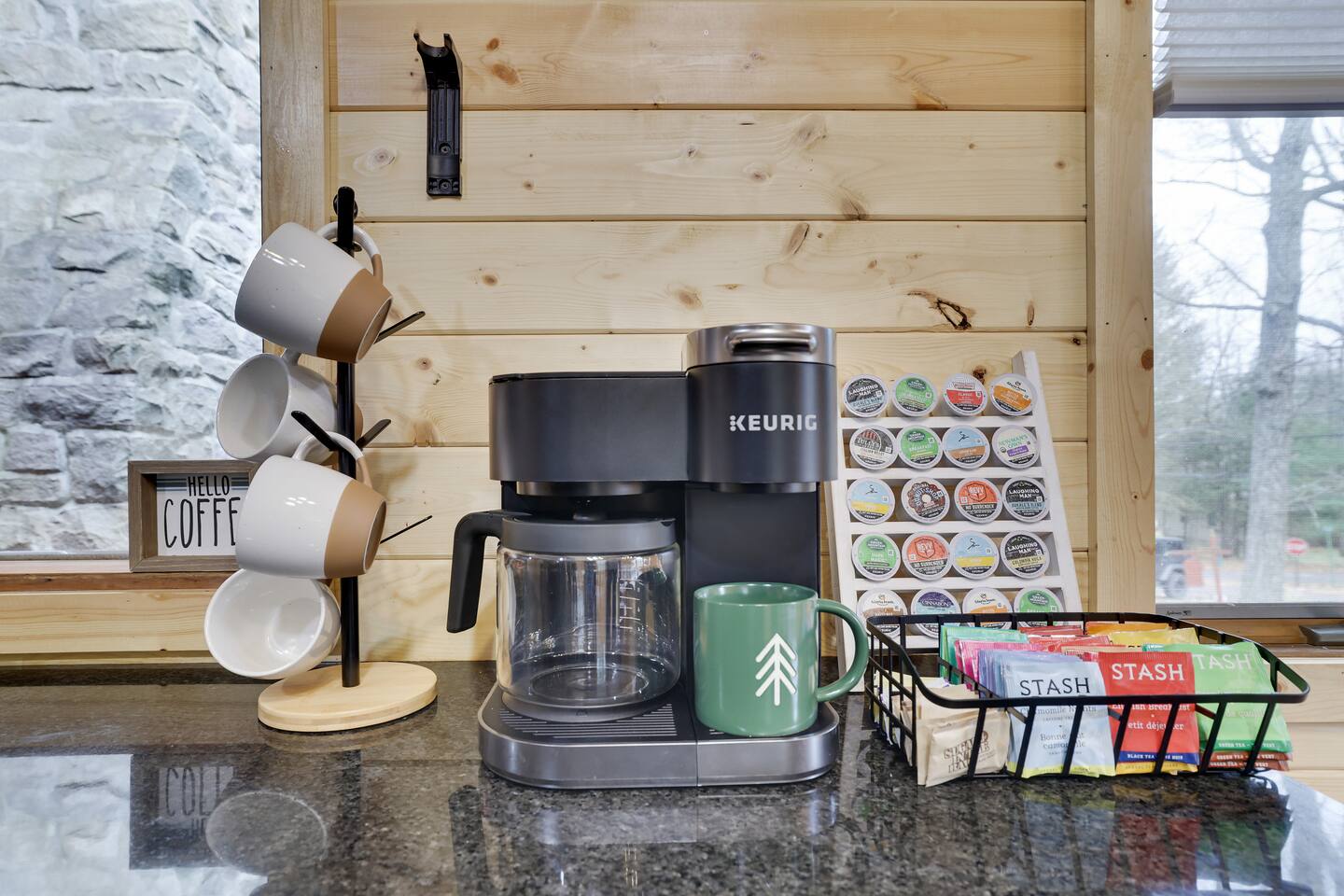 Welcome to Red Oak Retreat, nestled in the heart of the Poconosβ popular Lake Harmony area. This beautiful cabin seamlessly blends cozy, rustic charm with a touch of modern, creating a welcoming retreat that exudes both warmth and contemporary style. β β β β β Past guests have said: βPerfect location for a family getaway! Very close to Jack Frost and Big Boulder. The house was comfortable, cozy, and very clean.β β Claire Β· Stayed with kids βThis house is nothing short of beautiful! Staying on Lake Harmony is a MUST, there are restaurants and activities to do very close to the house. The house was extremely clean and still cozy! The host was able to respond very quick- even though we had no issues at all!" β Madison Β· Stayed with friends β β β β β KEY FEATURES: β’ 3 bedrooms + loft room; comfortably sleeping 11 (1 King, 1 Queen, 1 Double, and Bunk Room w/ 2 Doubles + 1 Twin) β’ 2 full bathrooms ft. 2 luxury walk-in showers β’ 8-person hot tub β’ Large living room with 55β smart TV with streaming app & indoor gas fireplace β’ Outdoor fire pit with Polywood Adirondack chairs β’ Modern, well-equipped kitchen with stainless steel cookware & two dining tables β’ Spacious master bedroom with a king-sized bed, smart TV and en-suite bath β’ High-speed WiFi β’ Kid-friendly w/ gate, high chair, and pack & play provided β’ Board games β β β β β β BEDROOMS β The homeβs 4 bedrooms offer privacy for your whole group β adults & children alike! The spacious master bedroom boasts a king-sized bed and a 44β smart TV, as well as a private, en-suite bathroom. There are two other bedrooms on the first floor: one featuring a queen-sized bed, and one with a double bed. Both evoke the rustic-yet-modern vibe that makes this home so welcoming and cozy. Finally, the fourth loft-style bedroom upstairs features a bunk bed (two double mattresses) and a separate twin-sized bed. This little hideaway is a favorite for kids! Note that the stairs leading up to the loft are narrow, but not an issue for most. β BATHROOMS β Enjoy a retreat-within-your-retreat in our TWO full-sized, recently renovated bathrooms. The master en-suite bathroom features a large shower with river-rock tiling to keep you enveloped in nature. The hall bathroom also features a large standing shower adorned with modern subway tiles, and is easily accessible for the rest of your group. All bathrooms are fully stocked with complimentary hand towels, wash cloths, makeup towels, hair dryers, and premium bath-time essentials. β KITCHEN β The chef in your group will love how spacious and open this kitchen is. So. Much. Counter Space! This kitchen offers all the quality stainless steel appliances, utensils and cookware needed to feel right at home. Think: all the stainless steel pots & pans, serving trays, and dishes you need to whip up a meal to remember. Canβt forget the coffee (and tea, for all our tea people). Kickstart your morning routine in the mountains with our brand new two-in-one drip coffee/Keurig machine. Or, choose from our extensive selection of Stash teas for a delightful variety to suit your taste buds. Whether you're a coffee connoisseur or a tea enthusiast, our thoughtfully curated caffeine station promises to wake you up. The kitchen also features a 4-person dining table (in addition to the 7-person dining table in the main living area) β perfect for a quick cup of coffee or bite to eat before hitting the slopes. β LIVING ROOM β This is a living room made for lounging! Two large, brand new leather couches face a cozy stone, gas-powered fireplace, as well as a 55β smart TV with all the streaming apps youβve come to love. The perfect place for kicking your feet up after a day spent outdoors. A quaint reading nook also offers extra seating, if youβd rather be snuggled up with a book. β DINING AREA β Adjacent to the living room is a 7-person dining table β perfect for those memorable dinners-that-blend-into-nighttime, and maybe even some friendly competition at family game night. From the top-line Crate & Barrel dinnerware, to the well appointed table decor, this space is designed to be the backdrop of your evenings. β OUTDOOR SPACE β The outdoor space is rich with amenities and activities, boasting an 8-person hot tub, a fire pit surrounded by 8 brand new polywood Adirondack chairs, a relaxing garden hammock and a corn-hole set. There is also a large deck off the back of the house featuring a six-person outdoor teakwood sectional, a modern wooden picnic table, and a brand new stainless steel gas BBQ grill. Whether looking to escape for solo relaxation or actively enjoy the beautiful Lake Harmony scenery, there is no shortage of outdoor amenities! The home is on a wooded corner lot, and offers a U-shaped driveway with parking for 6 vehicles.